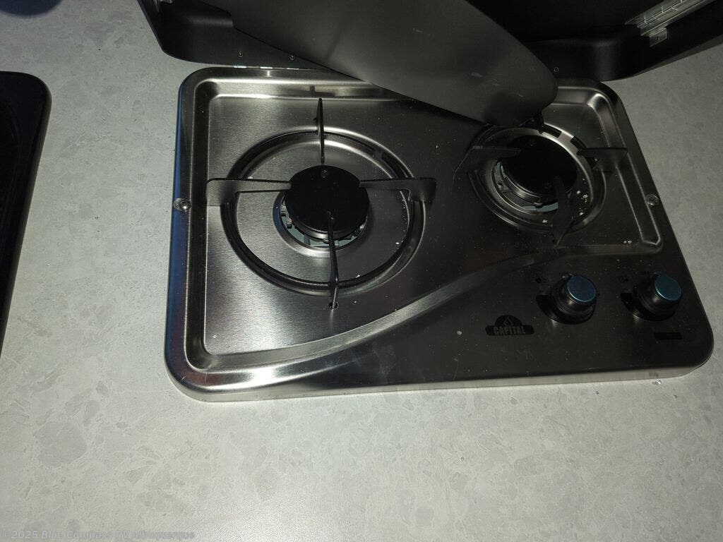 When you only need sleeping space for one or two, enjoy making last minute plans, and prefer your everyday vehicle to do your towing, this camper makes sense! The front kitchen makes it easy to walk around as you prepare meals using the two burner stove and sink, and there is more counterspace plus extra storage near the entry, and there is a refrigerator/freezer. The rear dinette converts into a 56" x 76" bed and also has storage under the seats for blankets, outdoor gear and such.