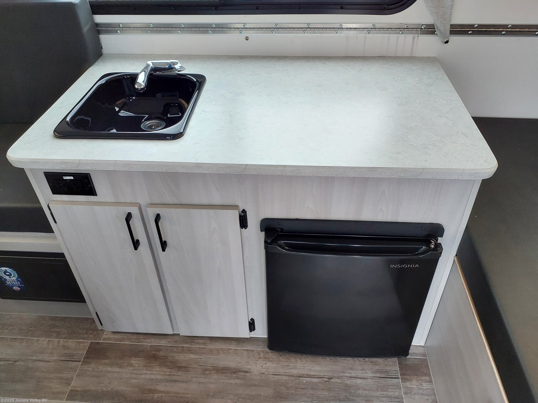 - Interior amenities including a compact refrigerator, dinette bed, kitchen sink, and living quarters