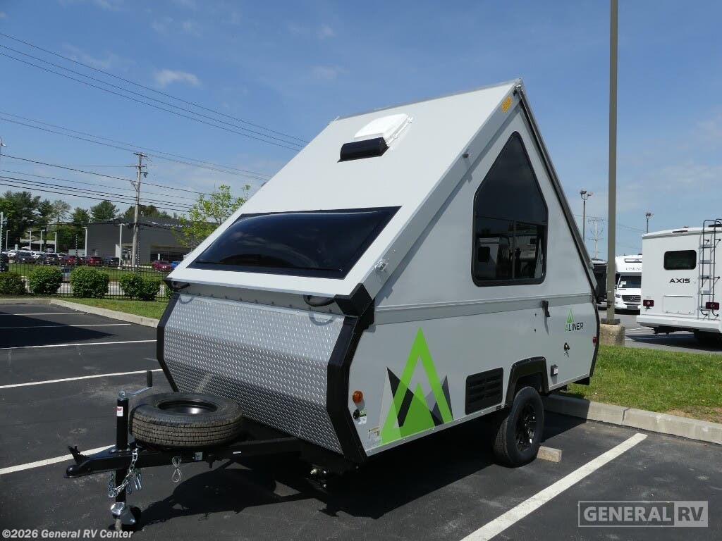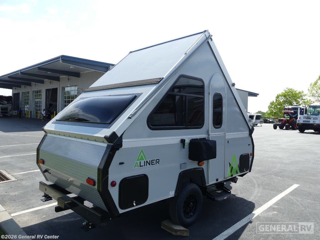 Aliner Scout A-frame camper Std. Model highlights: Sleeps Three Rear Sofa Bed Dinette/Bed Conversion Exterior Baggage Doors Get ready to sleep above ground as you upgrade from tent camping to this A-frame camper! It is easy to tow, set up and store when the fun is over. Inside you will find ample storage for your gear, a dinette to dine at when you aren't outside, a sofa bed to relax on before bedtime, and both furnishings covert to sleeping space. There are more features such as three electrical outlets inside, one outlet outside, high density foam, hypoallergenic cushions and mattress, and a fantastic vent-fan. With the Scout A-frame camper by Aliner, there is an E-coated frame with powder coating on the front tongue and bumper, a diamond plate stone guard to protect against road debris, aluminum wheels, and a battery tray. There are vacuum bonded fiberglass panels, an Azdel lightweight, Thermoplastic composite interior wall and ceiling panels, and 10" electric brakes. You will also find a sink inside to wash your hands and dishes, two skylights with night shades and a door window for natural lighting, plus more!