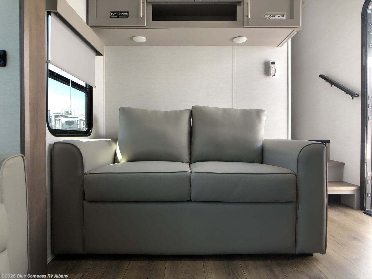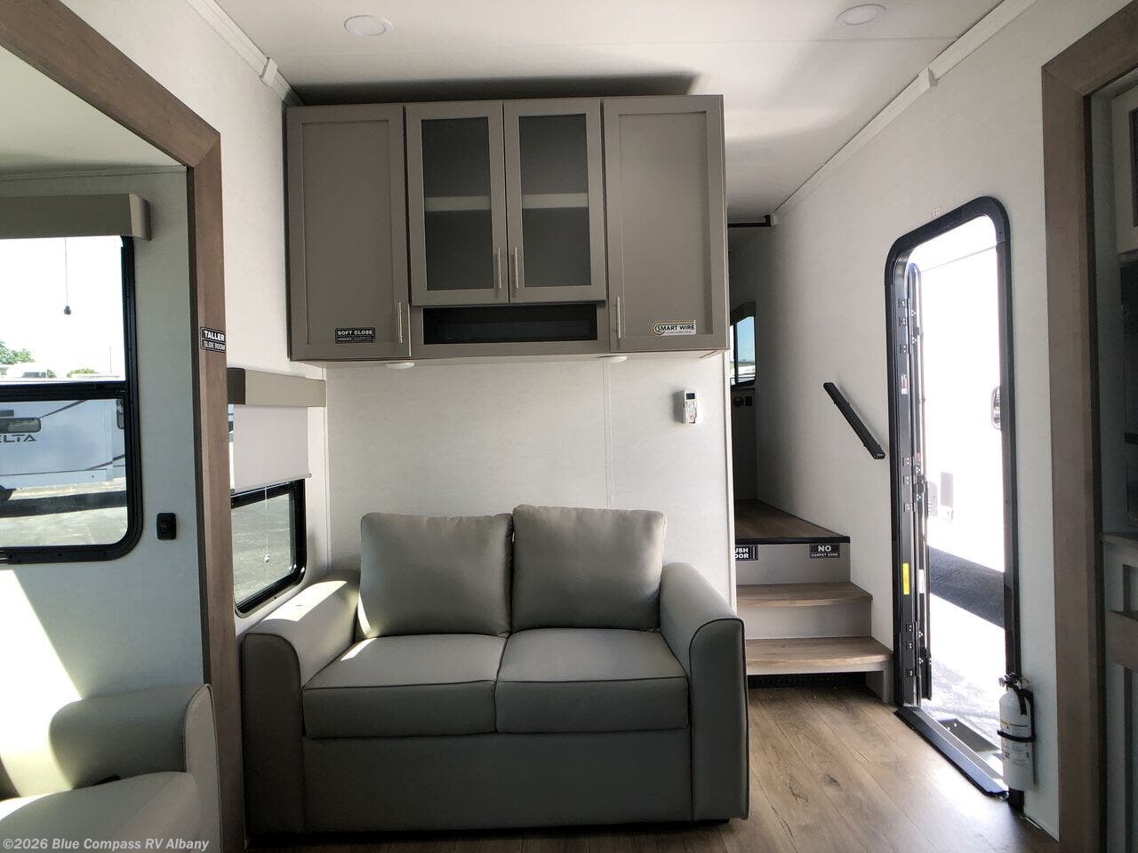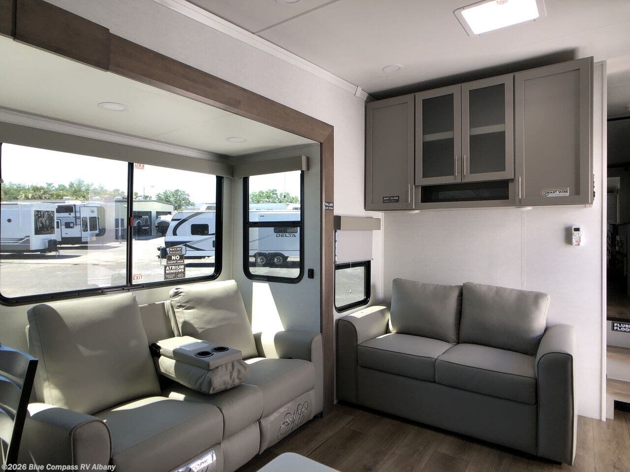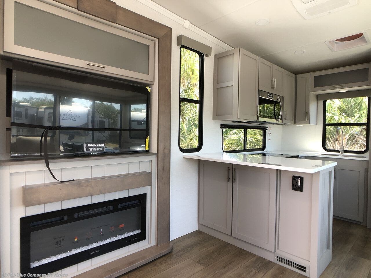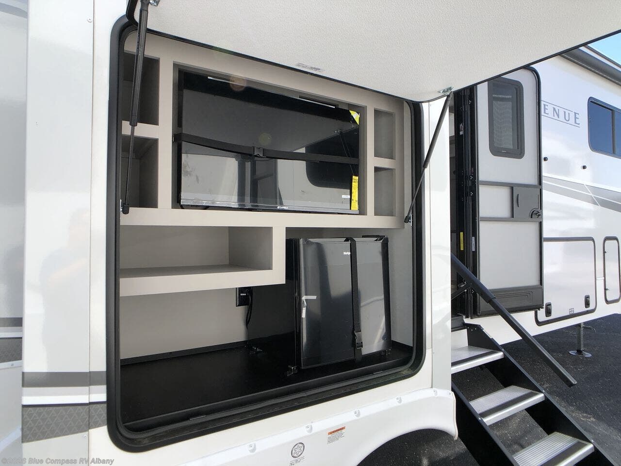 With any Avenue fifth wheel or travel trailer by Alliance RV, you will enjoy more interior space provided by the 8' 5" wide-body construction, and a long list of luxury features. Each is built with Azdel composite sidewalls both inside and out, along with a PVC roof for added strength. There are innovative storage solutions that include hidden storage behind the TV, within end tables and ottomans, and more. Since these units feature no carpet throughout, cleaning will be easier than ever, and there are flush floor slides throughout for seamless living spaces. The Avenue also comes with the OTG Solar Package with a 400 watt solar panel, inverter prep, multiple outlets, and more to keep you charged up!