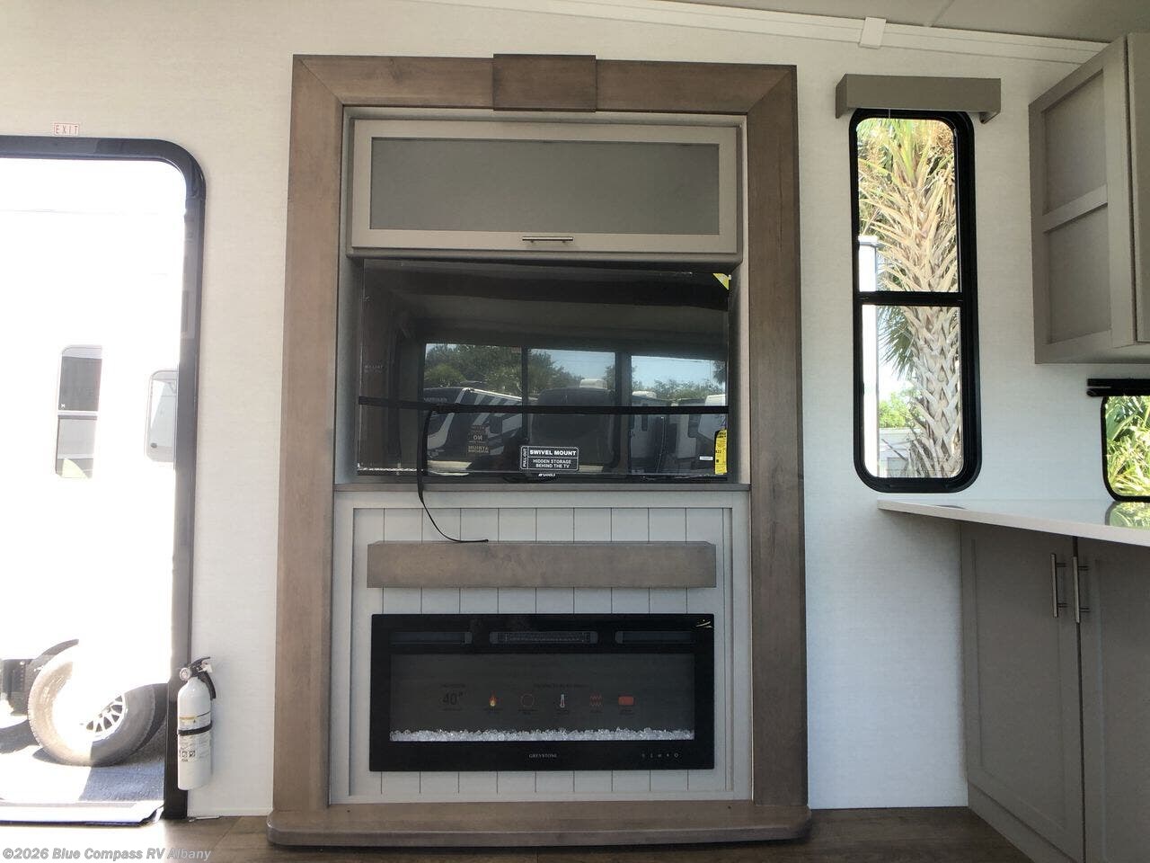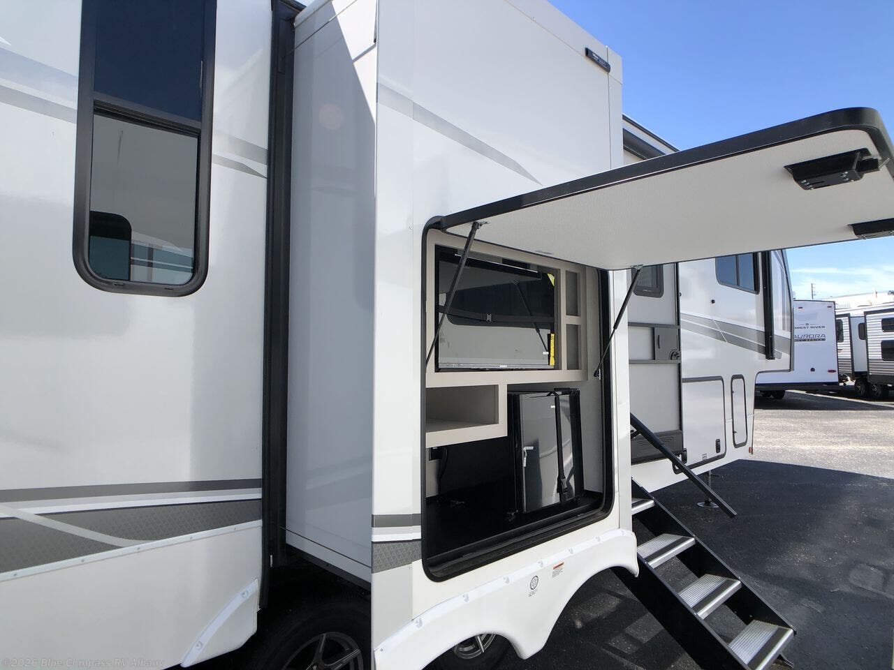 If you've been on the search for a luxury fifth wheel, this is the one! You'll love the rear kitchen with ample counter space, a 16 cu. ft. 12V refrigerator, plus a large sink to clean up. The swing-mount 50" HDTV will provide entertainment for your family while you relax on the dual recliner theater seat or tri-fold sofa. Freshening up each day will be a breeze in the full bath that includes a shower with a seat, and the front private bedroom is close by for convenience. You'll have the queen bed all to yourselves with an option to choose a king bed instead. And check out the large front closet with washer and dryer prep. Going full-time has never been easier!