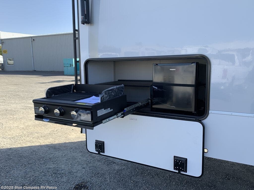 The whole gang can join in on the fun in this fifth wheel! The rear private 54" x 74" loft bed features a lower 60" x 70" bed beneath with storage and a TV, and its very own half bathroom with private entry/exit to the outside. There is also an exterior baggage door so you can easily pack gear straight into this room. The living area comes with dual recliner theater seating, a swing out 50" class HDTV, and a floating dinette table with two chairs and a movable ottoman with flip up storage. There is also a 16 cu. ft. 12 volt refrigerator and pull-out pantry here for food storage. And you can easily prepare your best home cooked meals using the three burner cooktop. When you're ready to wind down your night, head to the front private bedroom and relax on the queen bed slide which could be switched out for the optional king bed if you like! This unit also features an outdoor griddle and refrigerator under the loft space.