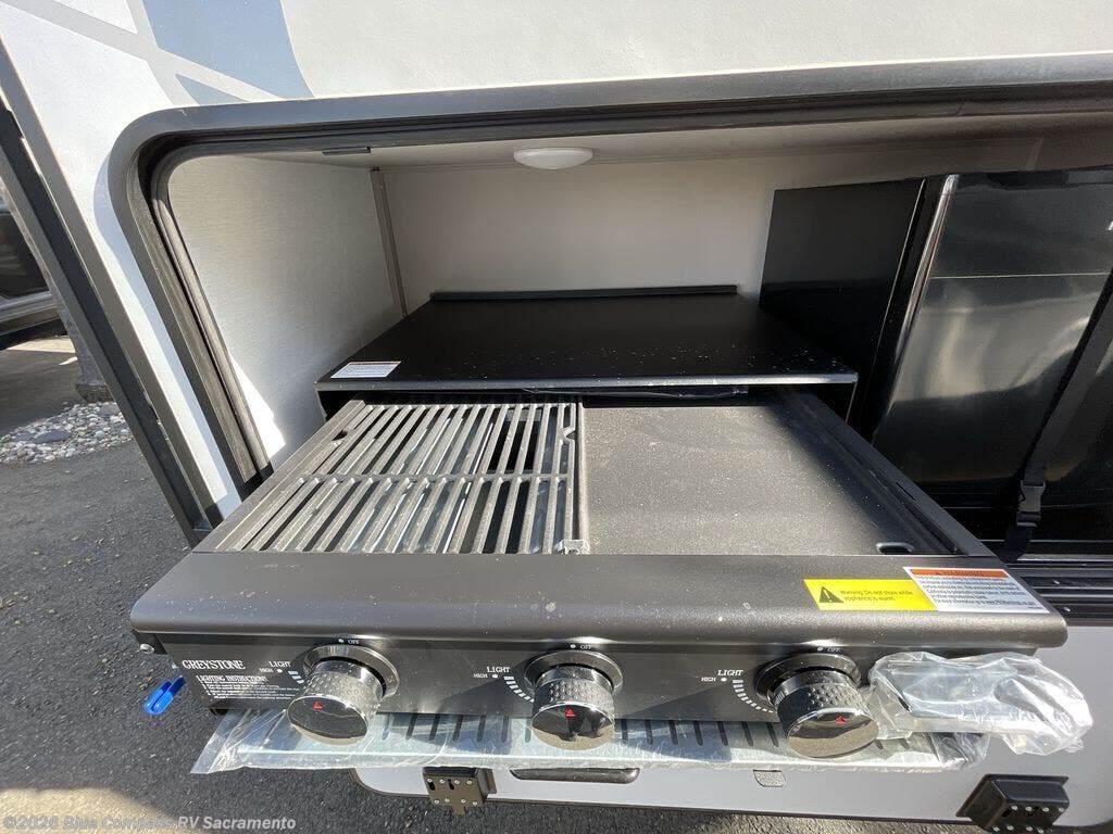 The whole gang can join in on the fun in this fifth wheel! The rear private 54" x 74" loft bed features a lower 60" x 70" bed beneath with storage and a TV, and its very own half bathroom with private entry/exit to the outside. There is also an exterior baggage door so you can easily pack gear straight into this room. The living area comes with dual recliner theater seating, a swing out 50" class HDTV, and a floating dinette table with two chairs and a movable ottoman with flip up storage. There is also a 16 cu. ft. 12 volt refrigerator and pull-out pantry here for food storage. And you can easily prepare your best home cooked meals using the three burner cooktop. When you're ready to wind down your night, head to the front private bedroom and relax on the queen bed slide which could be switched out for the optional king bed if you like! This unit also features an outdoor griddle and refrigerator under the loft space.