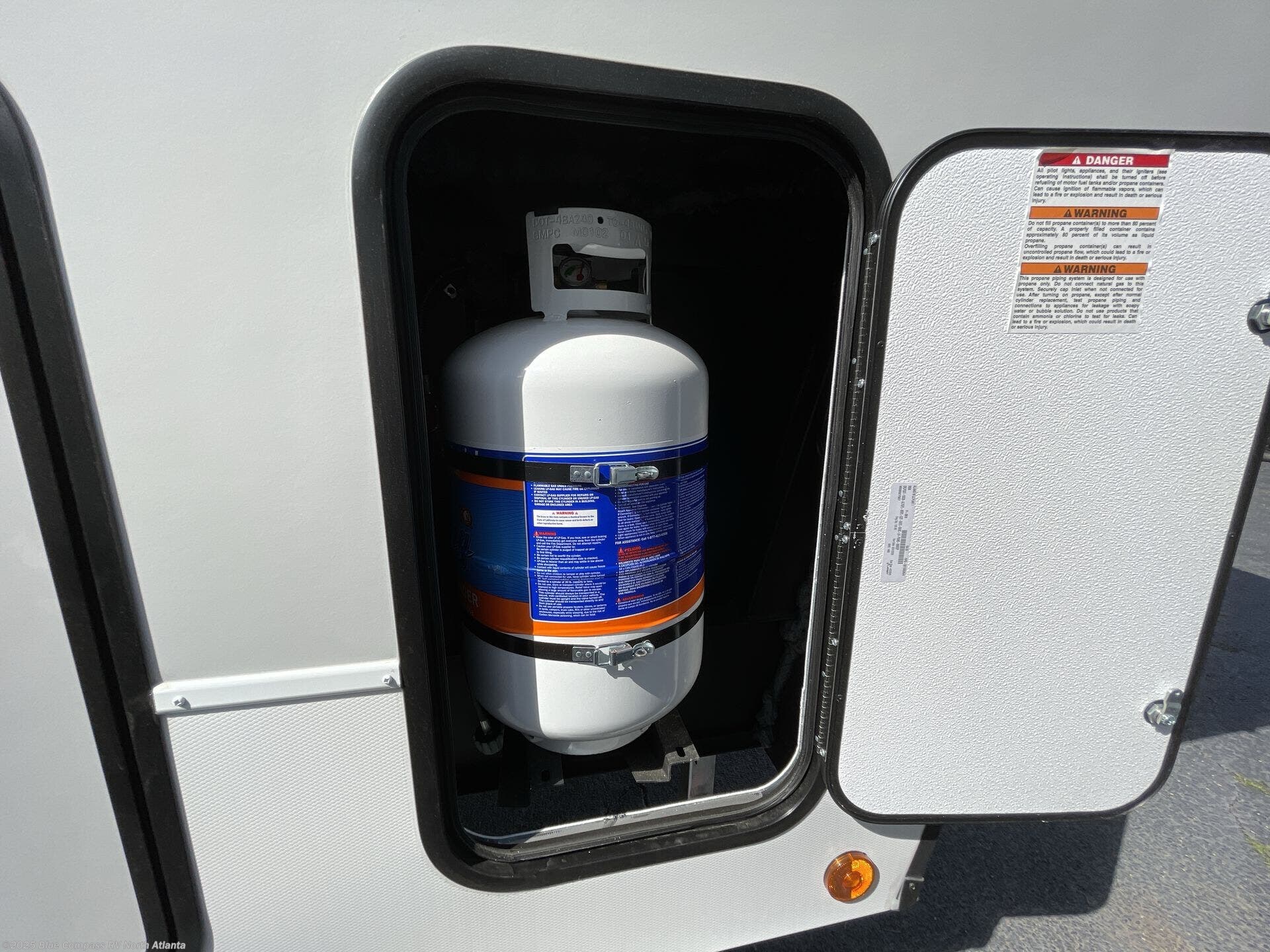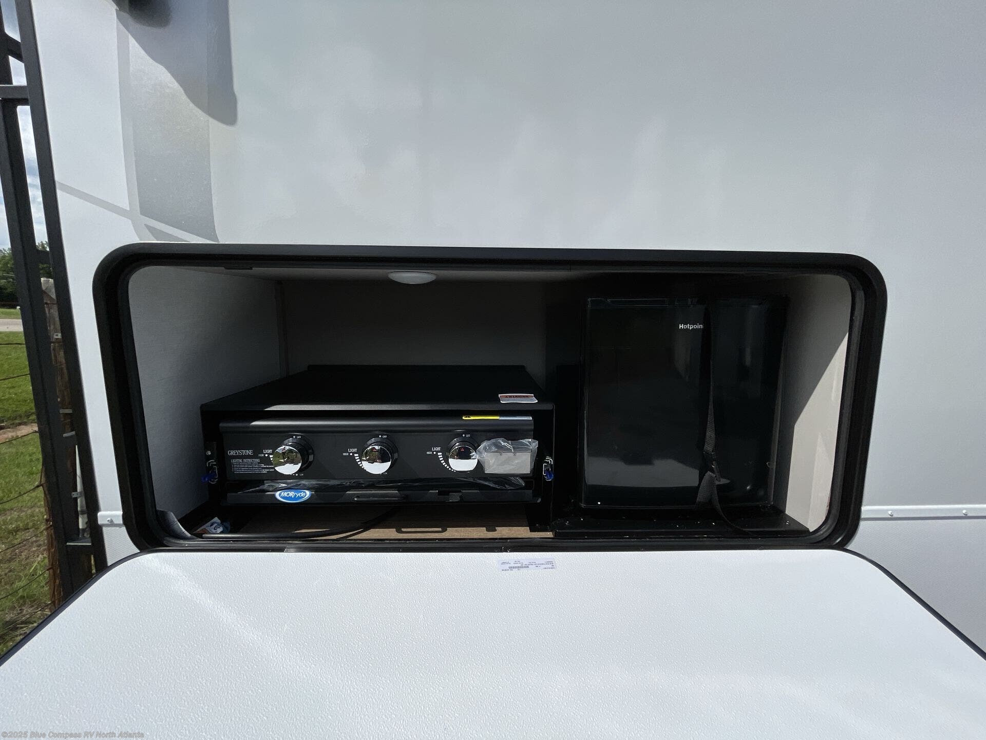 The whole gang can join in on the fun in this fifth wheel! The rear private 54" x 74" loft bed features a lower 60" x 70" bed beneath with storage and a TV, and its very own half bathroom with private entry/exit to the outside. There is also an exterior baggage door so you can easily pack gear straight into this room. The living area comes with dual recliner theater seating, a swing out 50" class HDTV, and a floating dinette table with two chairs and a movable ottoman with flip up storage. There is also a 16 cu. ft. 12 volt refrigerator and pull-out pantry here for food storage. And you can easily prepare your best home cooked meals using the three burner cooktop. When you're ready to wind down your night, head to the front private bedroom and relax on the queen bed slide which could be switched out for the optional king bed if you like! This unit also features an outdoor griddle and refrigerator under the loft space.