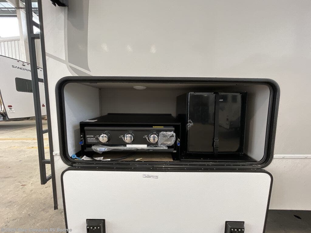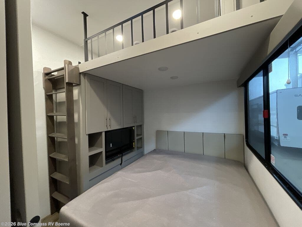 The whole gang can join in on the fun in this fifth wheel! The rear private 54" x 74" loft bed features a lower 60" x 70" bed beneath with storage and a TV, and its very own half bathroom with private entry/exit to the outside. There is also an exterior baggage door so you can easily pack gear straight into this room. The living area comes with dual recliner theater seating, a swing out 50" class HDTV, and a floating dinette table with two chairs and a movable ottoman with flip up storage. There is also a 16 cu. ft. 12 volt refrigerator and pull-out pantry here for food storage. And you can easily prepare your best home cooked meals using the three burner cooktop. When you're ready to wind down your night, head to the front private bedroom and relax on the queen bed slide which could be switched out for the optional king bed if you like! This unit also features an outdoor griddle and refrigerator under the loft space.