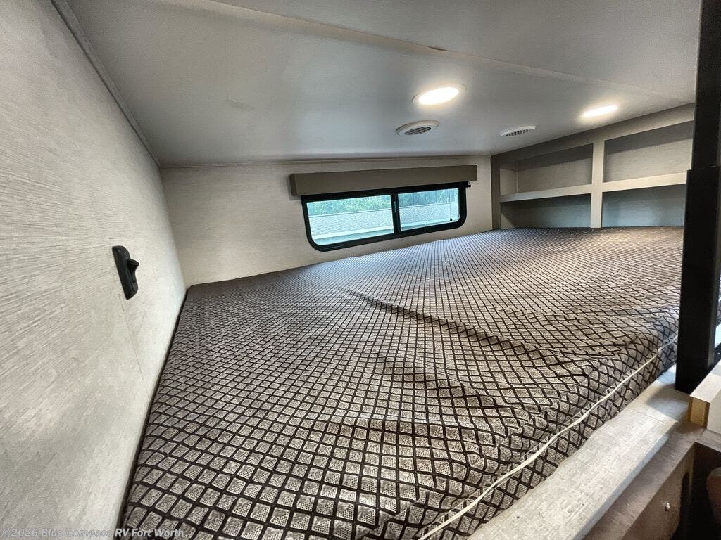 The whole gang can join in on the fun in this fifth wheel! The rear private 54" x 74" loft bed features a lower 60" x 70" bed beneath with storage and a TV, and its very own half bathroom with private entry/exit to the outside. There is also an exterior baggage door so you can easily pack gear straight into this room. The living area comes with dual recliner theater seating, a swing out 50" class HDTV, and a floating dinette table with two chairs and a movable ottoman with flip up storage. There is also a 16 cu. ft. 12 volt refrigerator and pull-out pantry here for food storage. And you can easily prepare your best home cooked meals using the three burner cooktop. When you're ready to wind down your night, head to the front private bedroom and relax on the queen bed slide which could be switched out for the optional king bed if you like! This unit also features an outdoor griddle and refrigerator under the loft space.