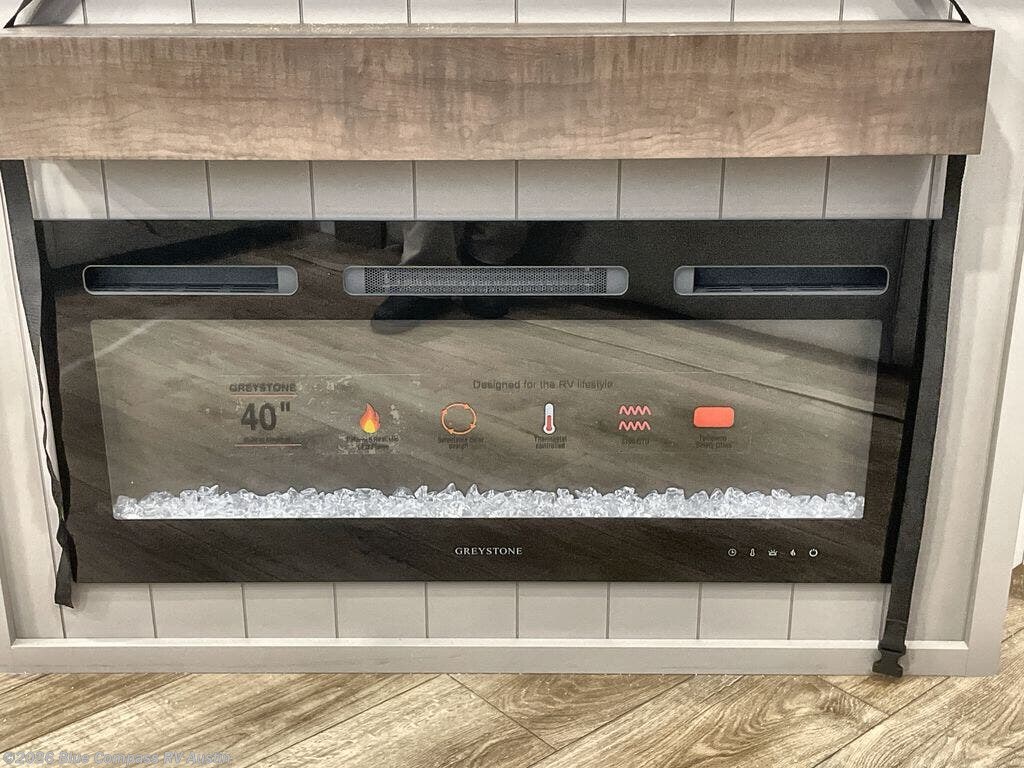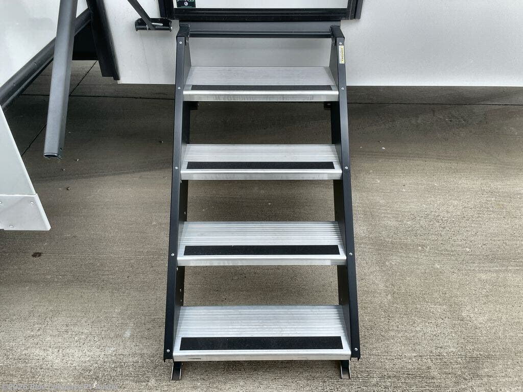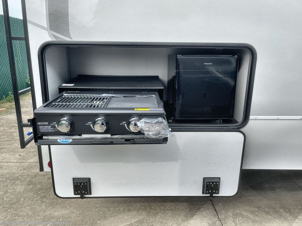 The whole gang can join in on the fun in this fifth wheel! The rear private 54" x 74" loft bed features a lower 60" x 70" bed beneath with storage and a TV, and its very own half bathroom with private entry/exit to the outside. There is also an exterior baggage door so you can easily pack gear straight into this room. The living area comes with dual recliner theater seating, a swing out 50" class HDTV, and a floating dinette table with two chairs and a movable ottoman with flip up storage. There is also a 16 cu. ft. 12 volt refrigerator and pull-out pantry here for food storage. And you can easily prepare your best home cooked meals using the three burner cooktop. When you're ready to wind down your night, head to the front private bedroom and relax on the queen bed slide which could be switched out for the optional king bed if you like! This unit also features an outdoor griddle and refrigerator under the loft space.