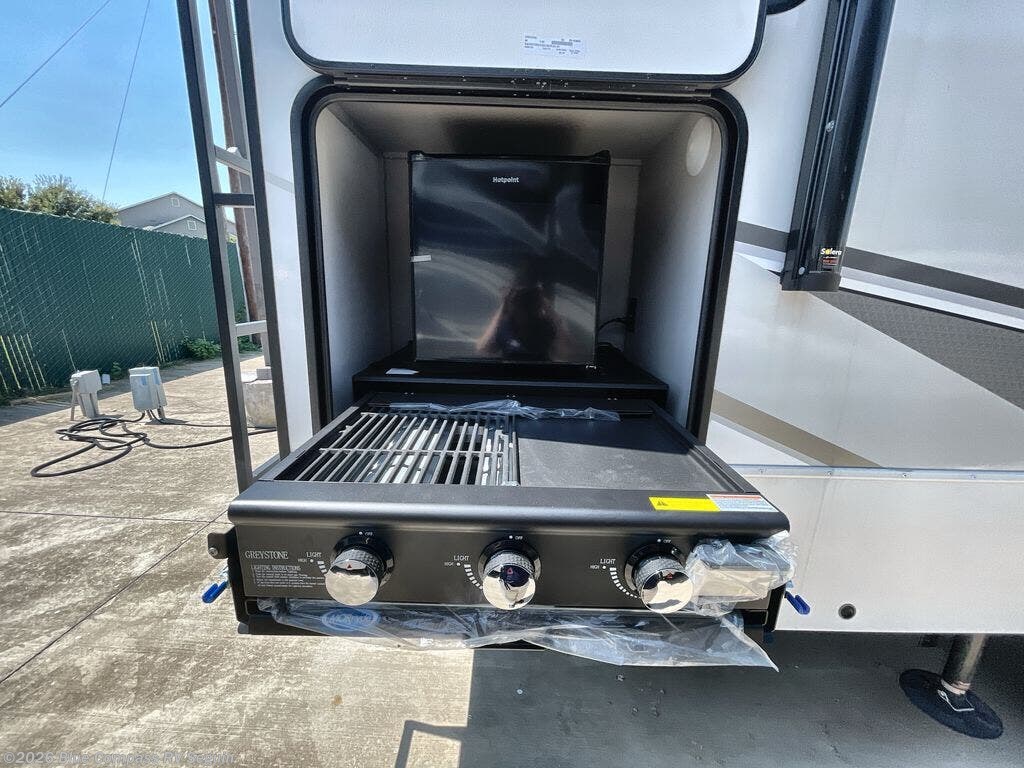 This fifth wheel is ready for adventure when you are! Once you arrive at the campground, you can put out the 16' awning, then start lunch on the exterior griddle. A booth dinette and theater sofa provide seating space inside, and there is a 50" Class HDTV to enjoy movies. The chef will also love the interior kitchen with its ample counter space, and there is plenty of storage with a hutch/pantry, second pantry, and 10 cu. ft. 12V refrigerator. Freshen up in the full bath before heading off to bed in the front private bedroom. Here, you'll find a queen bed, dual nightstands and overhead storage, plus a wardrobe with washer and dryer prep if you choose to add those appliances!