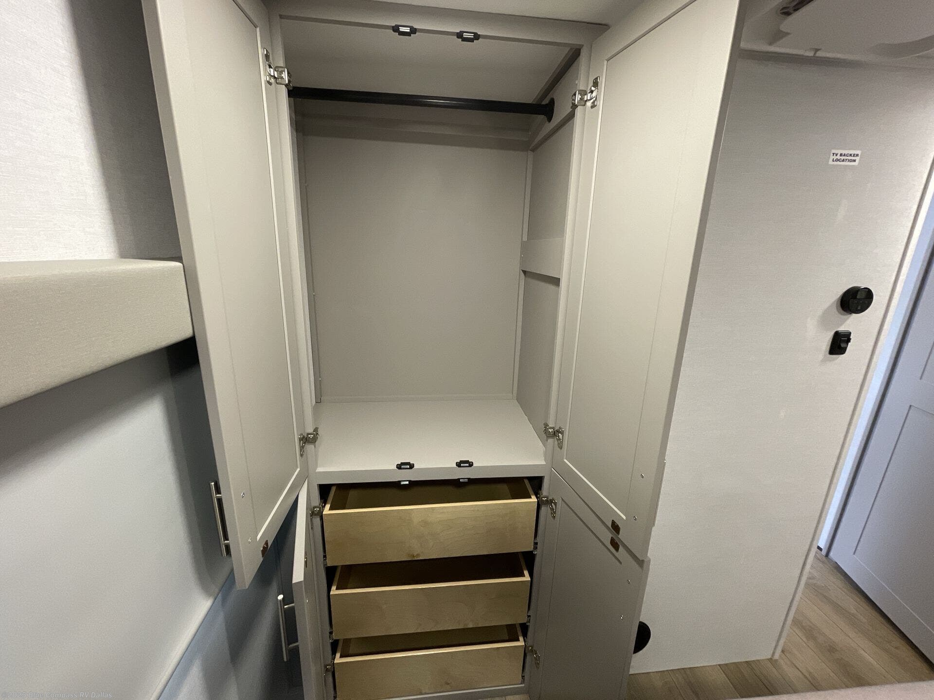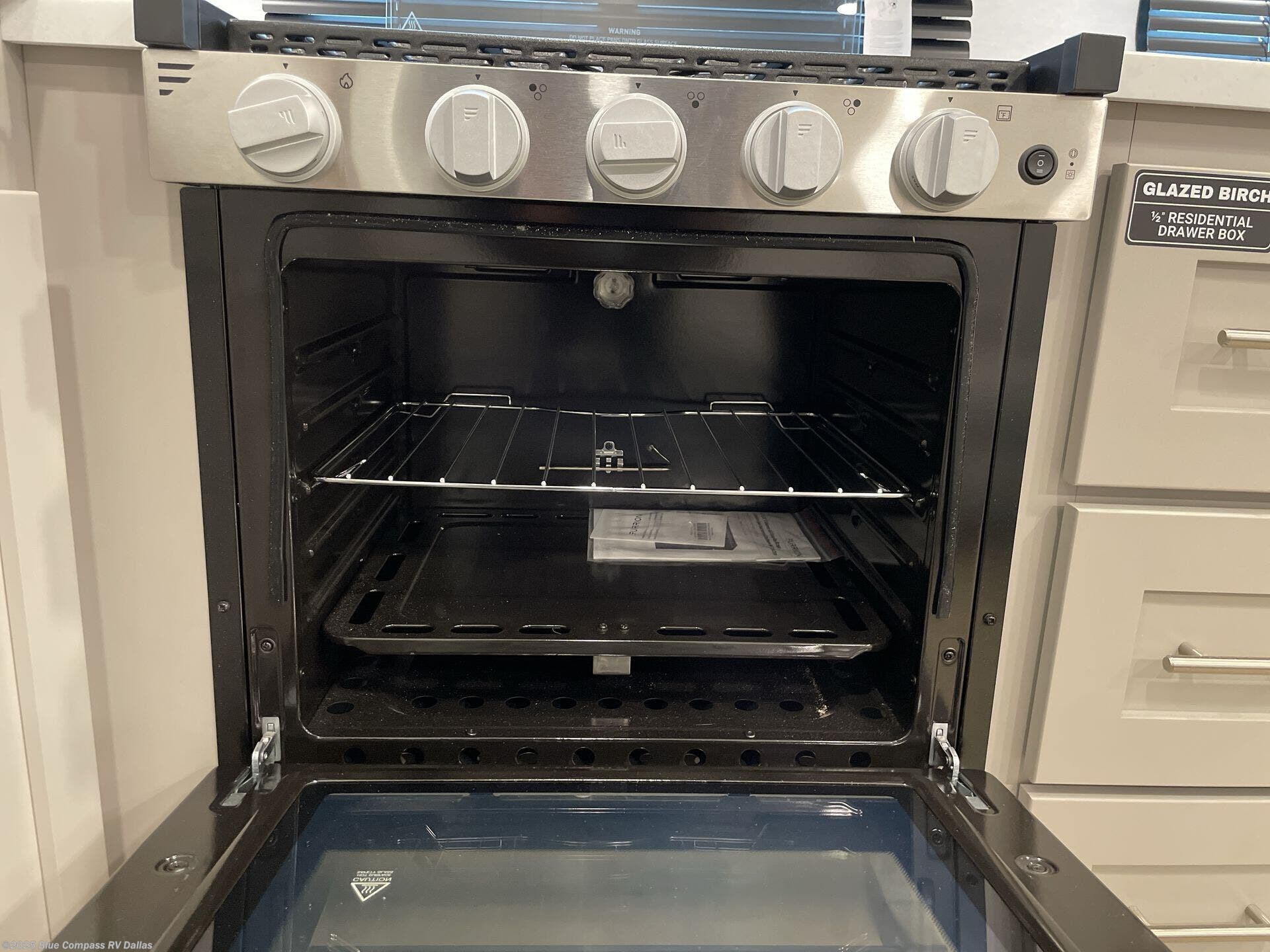 Escape to your favorite destinations with your favorite person in this fifth wheel! The front private bedroom has a queen bed with nightstands on either side to set a glass of water on, and a wardrobe to keep your clothes looking nice. Freshen up each morning in the full bathroom with a 30" x 36" shower, and grab a towel stored close by in the linen closet. Now that you're ready for the day, you can head to the kitchen and grab some eggs from the 10 cu. ft. 12V refrigerator to fry up using the three burner cooktop, plus there is a flip-up butcher block to make dinner prep easier. Spend your evenings in true relaxation seated on the sofa slide out across from the swing mount 40" HDTV. You also have a rear booth dinette with overhead storage!