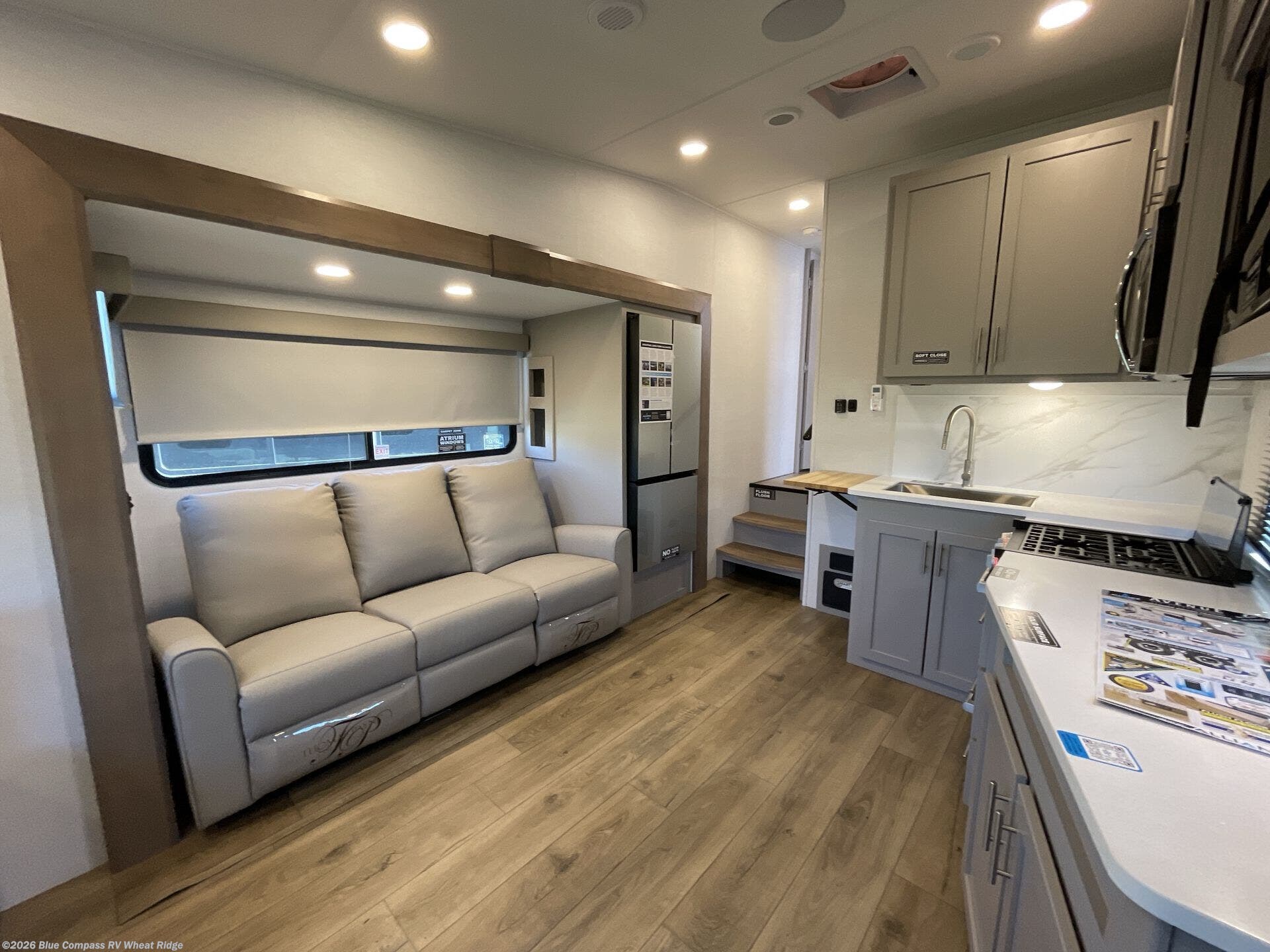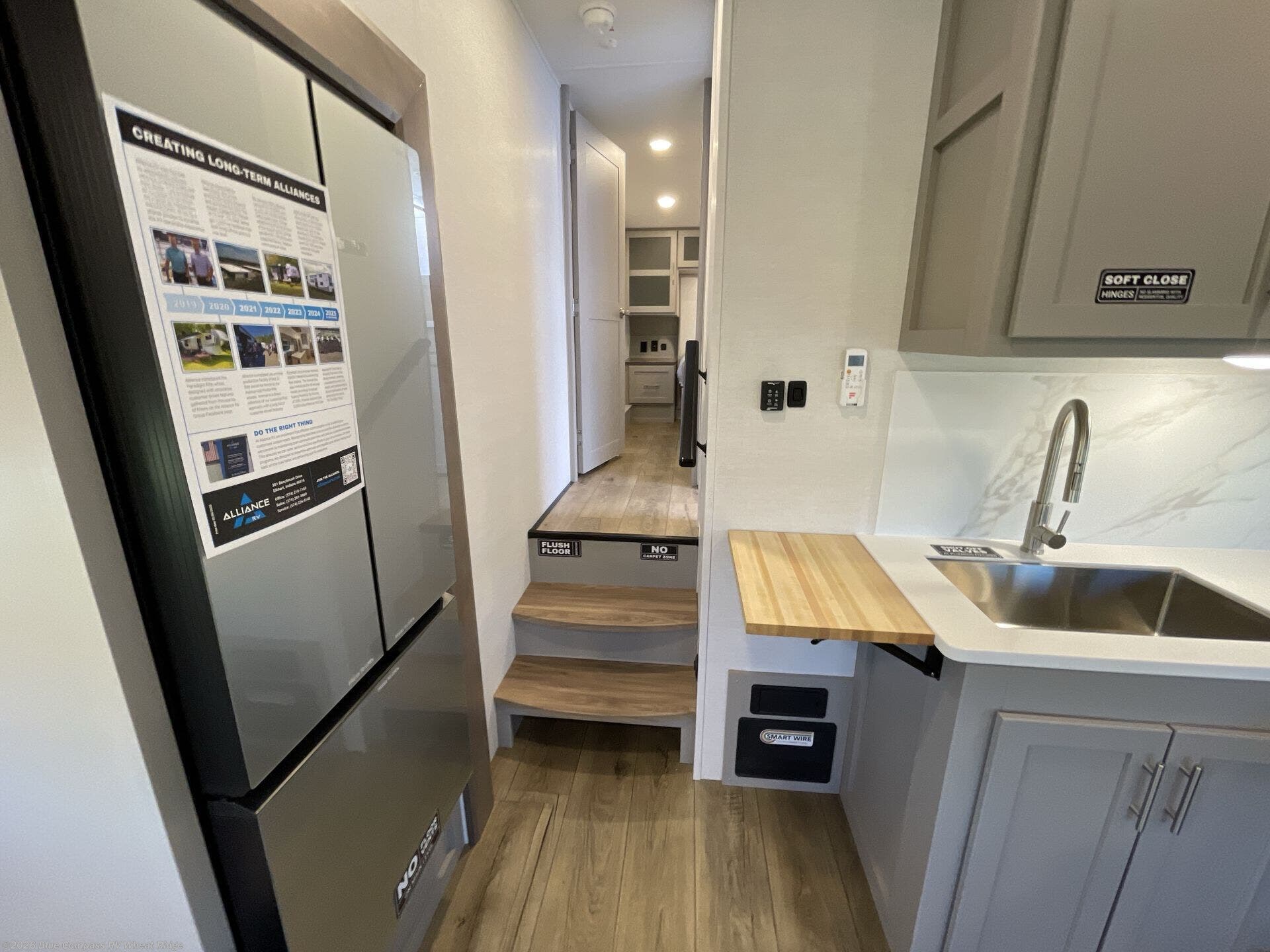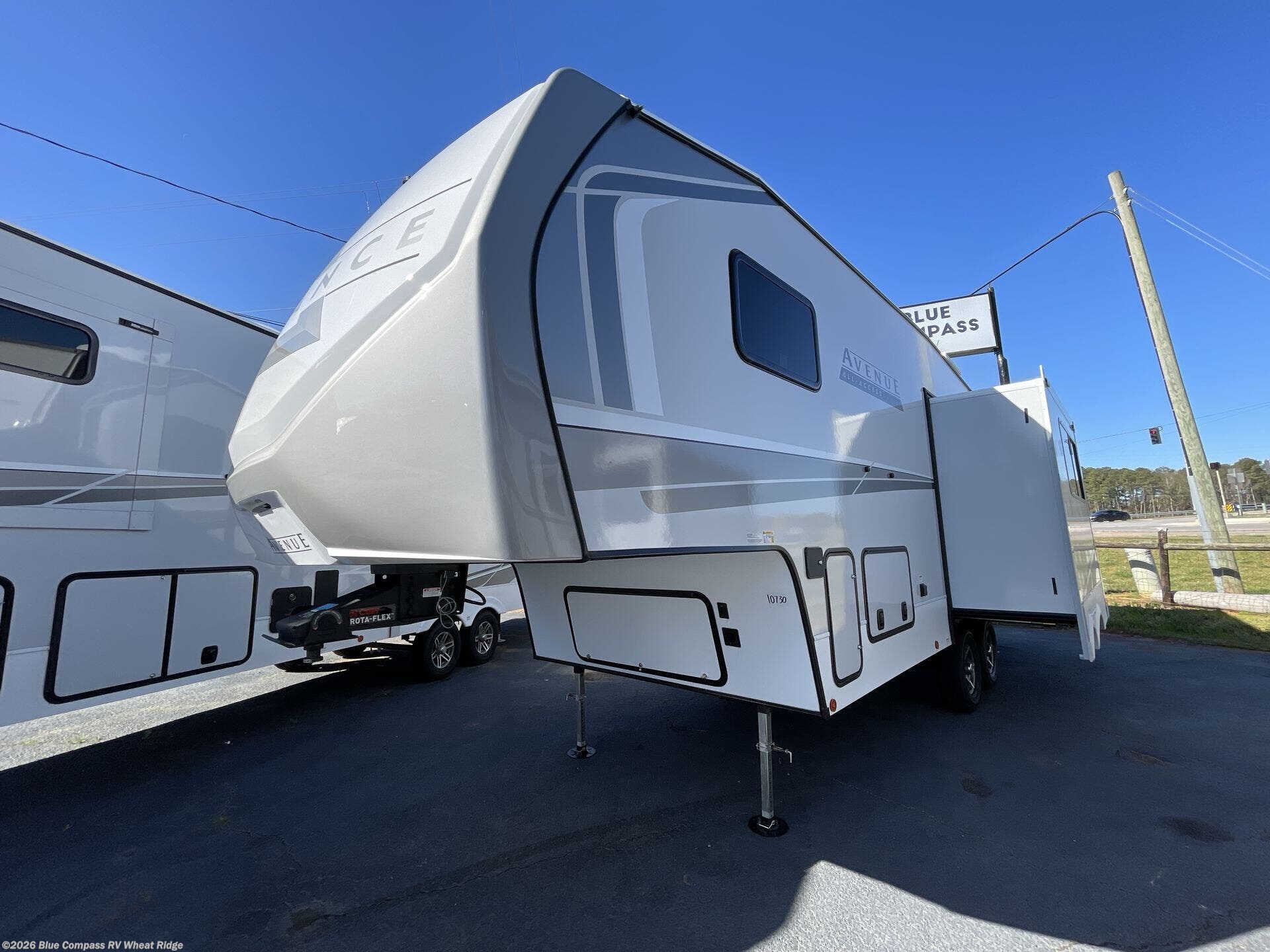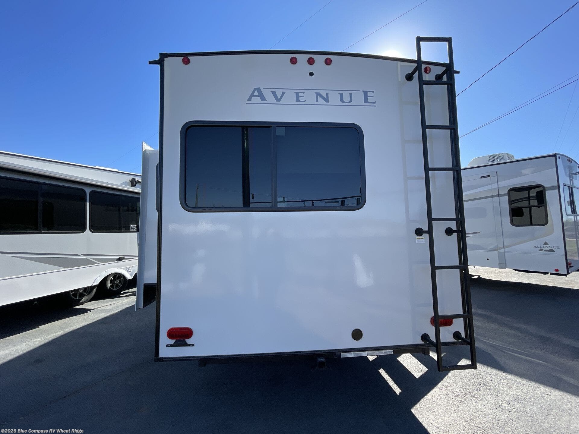 A benchmark chassis creates a space saver upper deck with each one of these Avenue All-Access fifth wheels by Alliance RV! The 101 in. wide-body construction gives you more room to walk around and the flush slide out floors throughout prevent any tripping. There are Azdel composite sidewalls inside and out, and a seamless fully walkable PVC roof for extreme durability and zero maintenance. You are sure to love the "no carpet zone" making each Avenue easy to clean and allergen free, not to mention pet friendly. You can maximize your space throughout with innovative storage solutions like the hidden storage behind the TV, inside the end tables, ottoman, and dinette chairs. These units also include the OTG Solar Package with a 200 watt solar panel, 15 amp MPPT charger, multiple outlets, and more to keep you powered up!