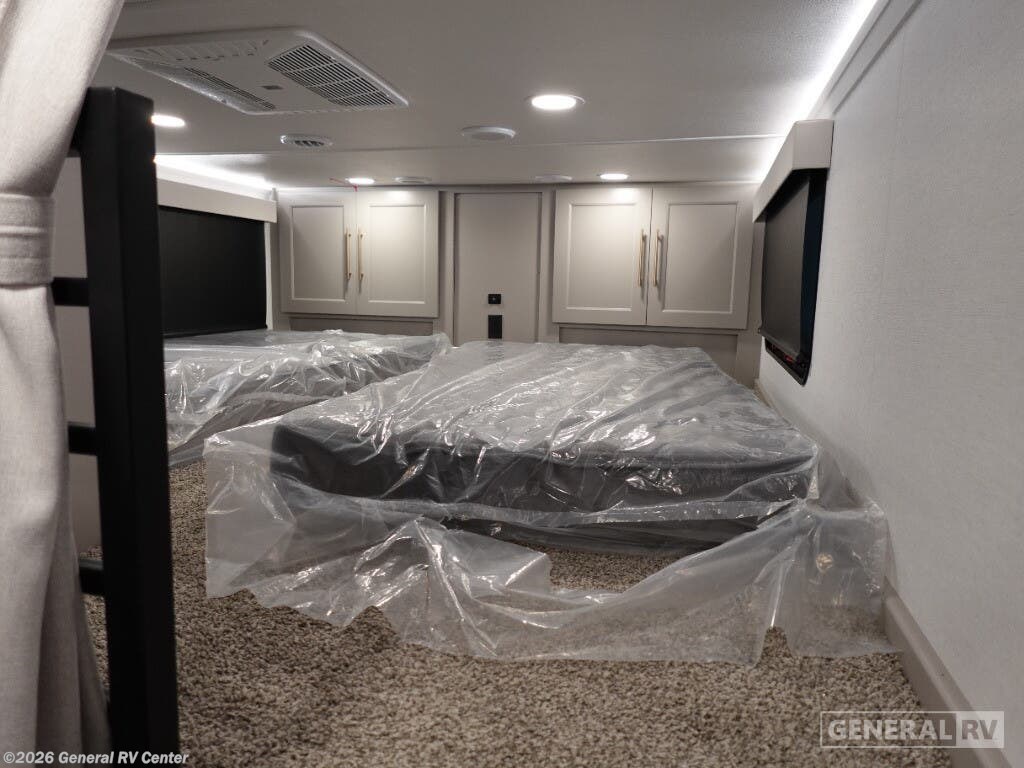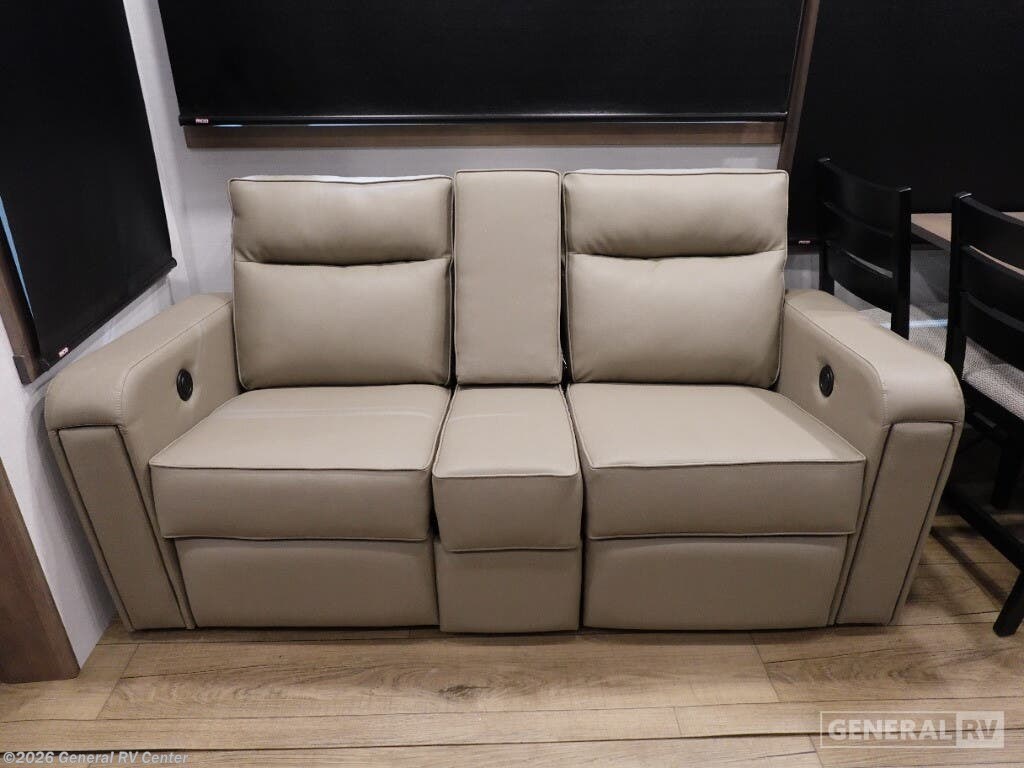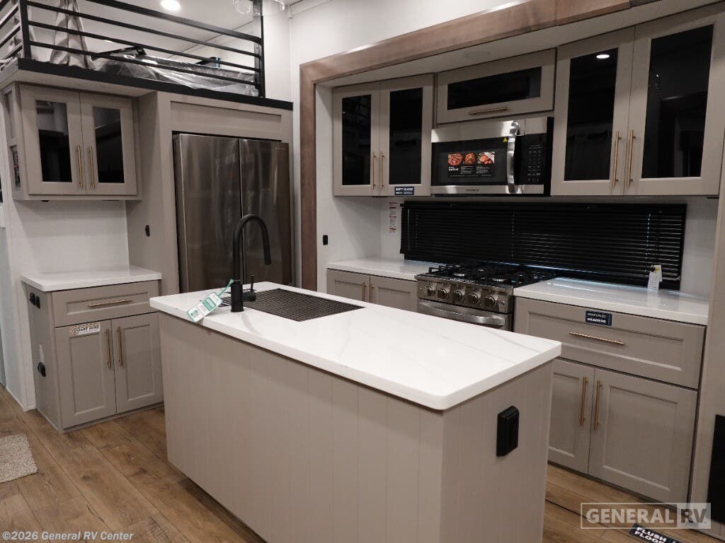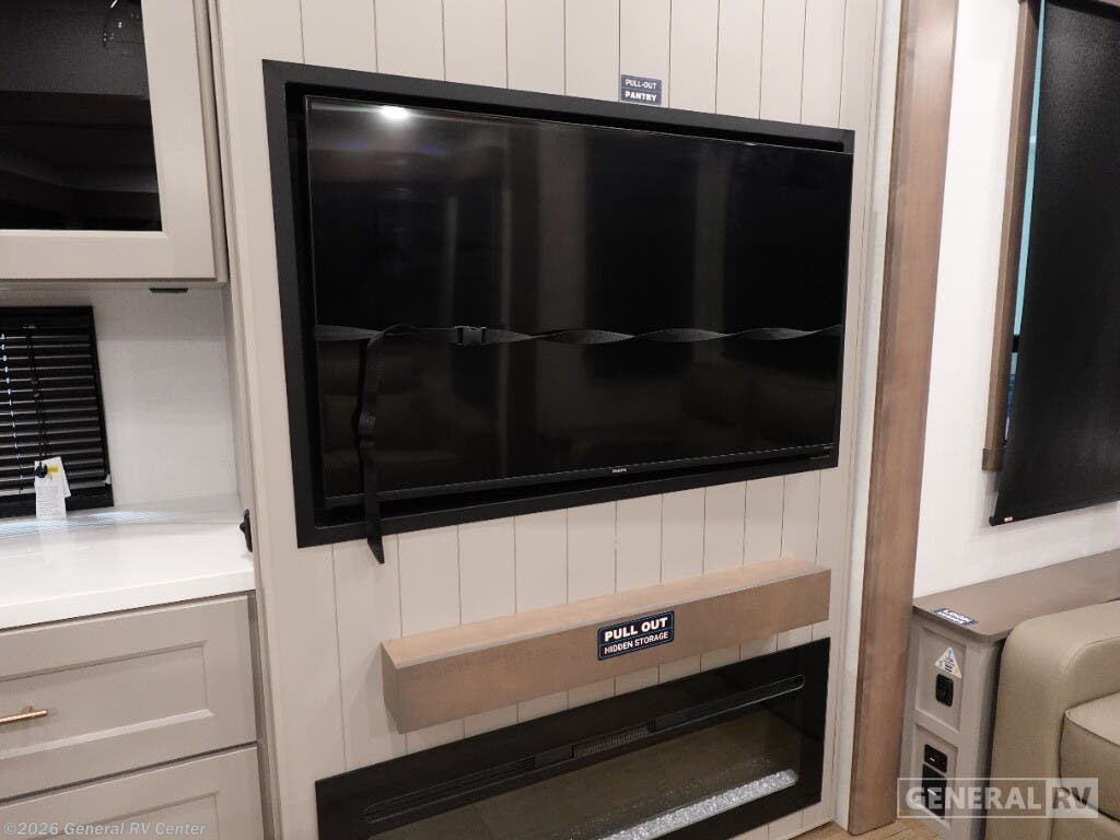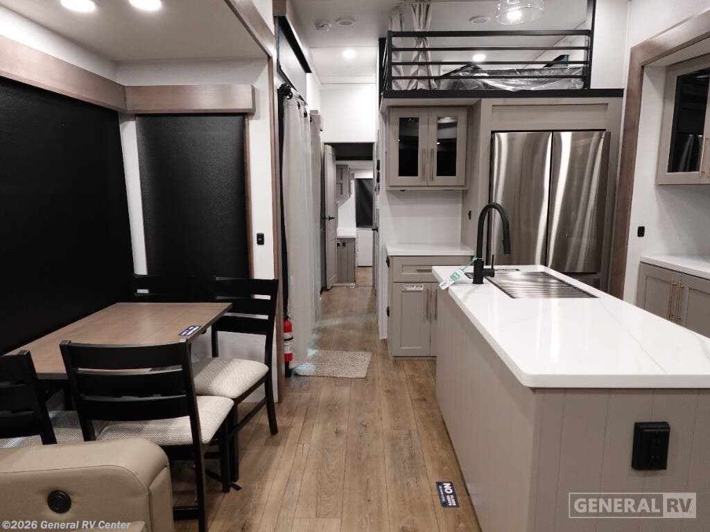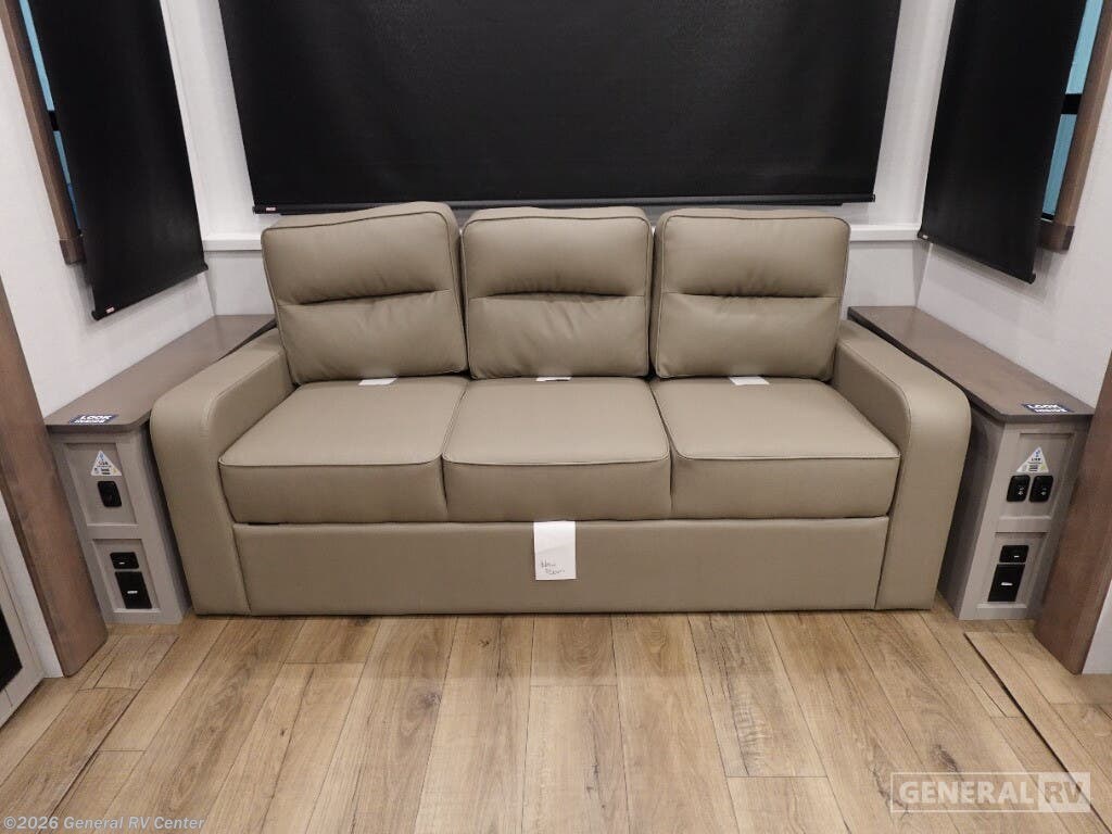 Step into the future of luxurious travel with the 2025 Alliance RV Benchmark 42LFT. This stunning fifth wheel is designed for those who crave both adventure and comfort. With a spacious layout that can comfortably sleep six, it's perfect for family trips or entertaining friends. The front living area is a masterpiece of design, featuring dual recliner theater seating and a cozy fireplace, creating an inviting space to relax after a day of exploration. The central kitchen is equipped with a full-size electric refrigerator and a four-burner cooktop, ensuring you have everything you need to whip up a gourmet meal on the road. The Benchmark 42LFT doesn't just offer style; it delivers on functionality too. The rear bedroom boasts a king-sized bed with a power-tilting feature, ensuring restful nights wherever you park. Above, the loft area provides additional sleeping space with bunks, making it ideal for kids or guests. Convenience is at the heart of this design, with features like a washer/dryer and a 22 ft. powered retractable awning for outdoor enjoyment. With ample fresh, gray, and black water capacities, you can venture off the beaten path with confidence. Visit your nearest General RV dealership to explore this remarkable RV in person and start your journey today!