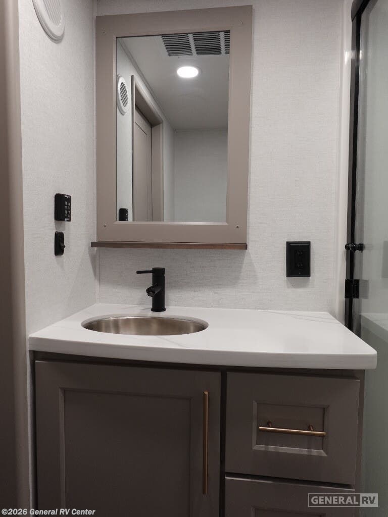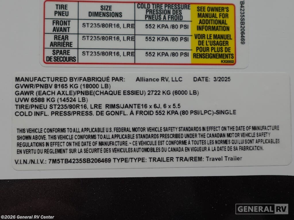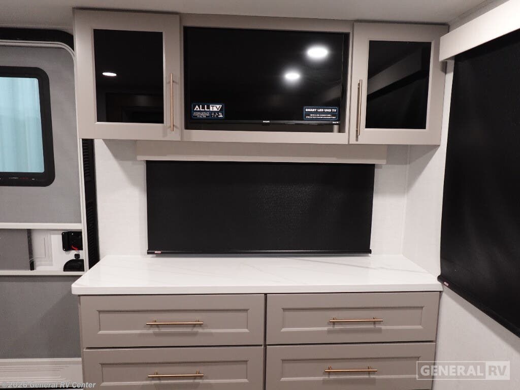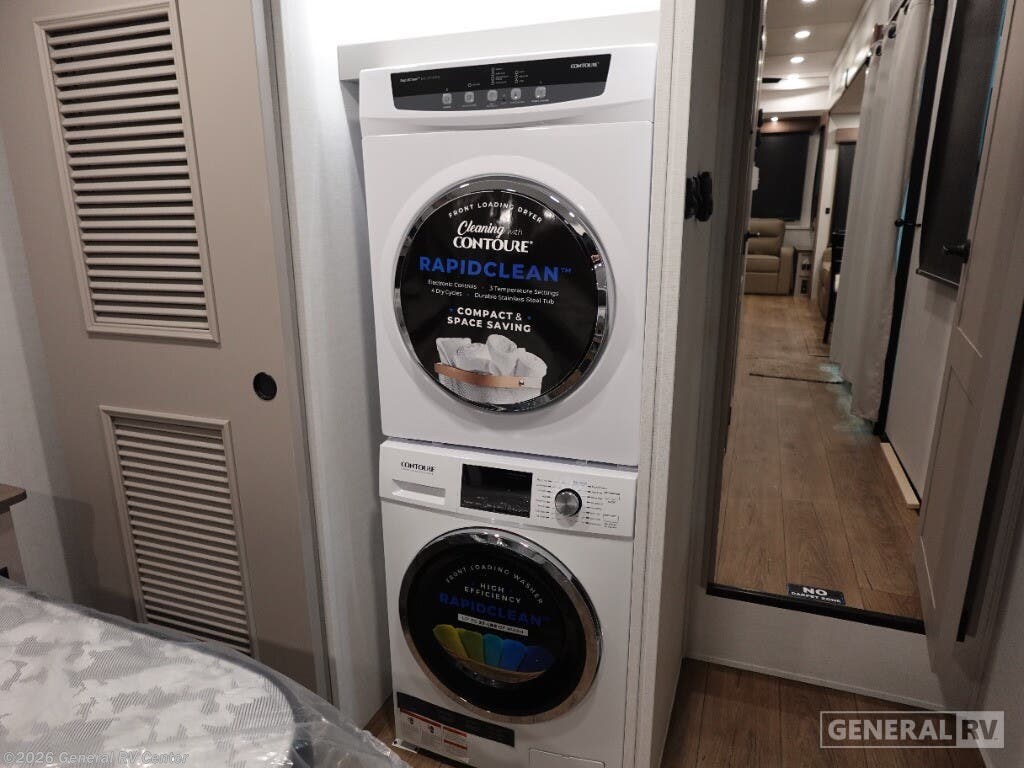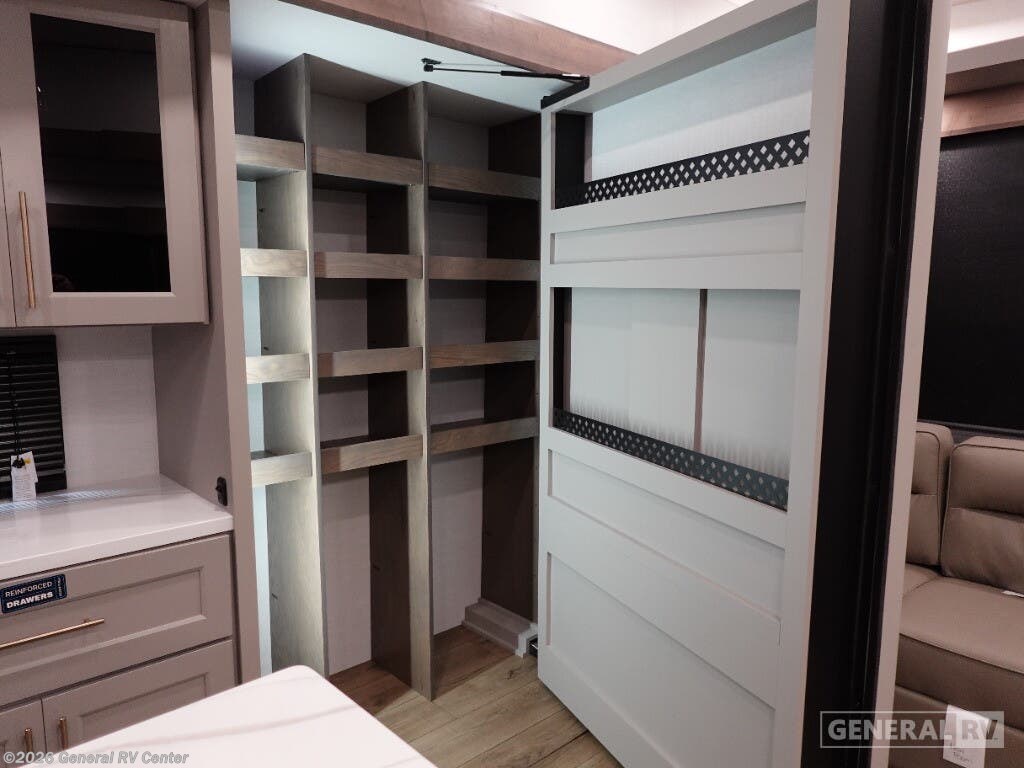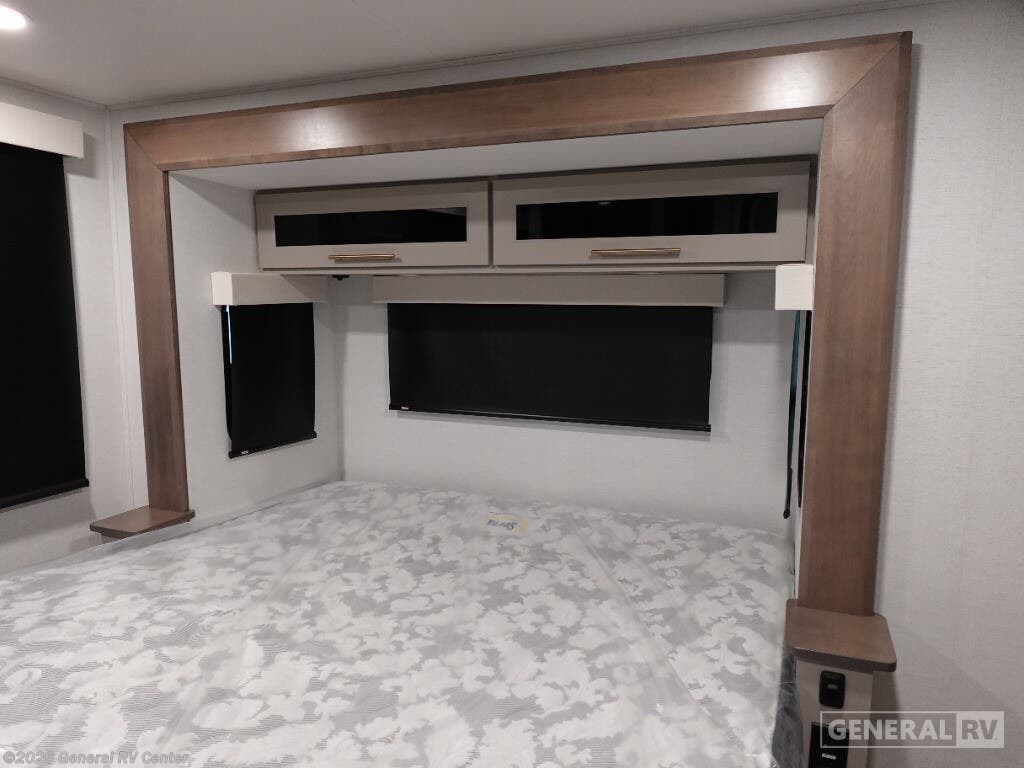 Step into the future of luxurious travel with the 2025 Alliance RV Benchmark 42LFT. This stunning fifth wheel is designed for those who crave both adventure and comfort. With a spacious layout that can comfortably sleep six, it's perfect for family trips or entertaining friends. The front living area is a masterpiece of design, featuring dual recliner theater seating and a cozy fireplace, creating an inviting space to relax after a day of exploration. The central kitchen is equipped with a full-size electric refrigerator and a four-burner cooktop, ensuring you have everything you need to whip up a gourmet meal on the road. The Benchmark 42LFT doesn't just offer style; it delivers on functionality too. The rear bedroom boasts a king-sized bed with a power-tilting feature, ensuring restful nights wherever you park. Above, the loft area provides additional sleeping space with bunks, making it ideal for kids or guests. Convenience is at the heart of this design, with features like a washer/dryer and a 22 ft. powered retractable awning for outdoor enjoyment. With ample fresh, gray, and black water capacities, you can venture off the beaten path with confidence. Visit your nearest General RV dealership to explore this remarkable RV in person and start your journey today!