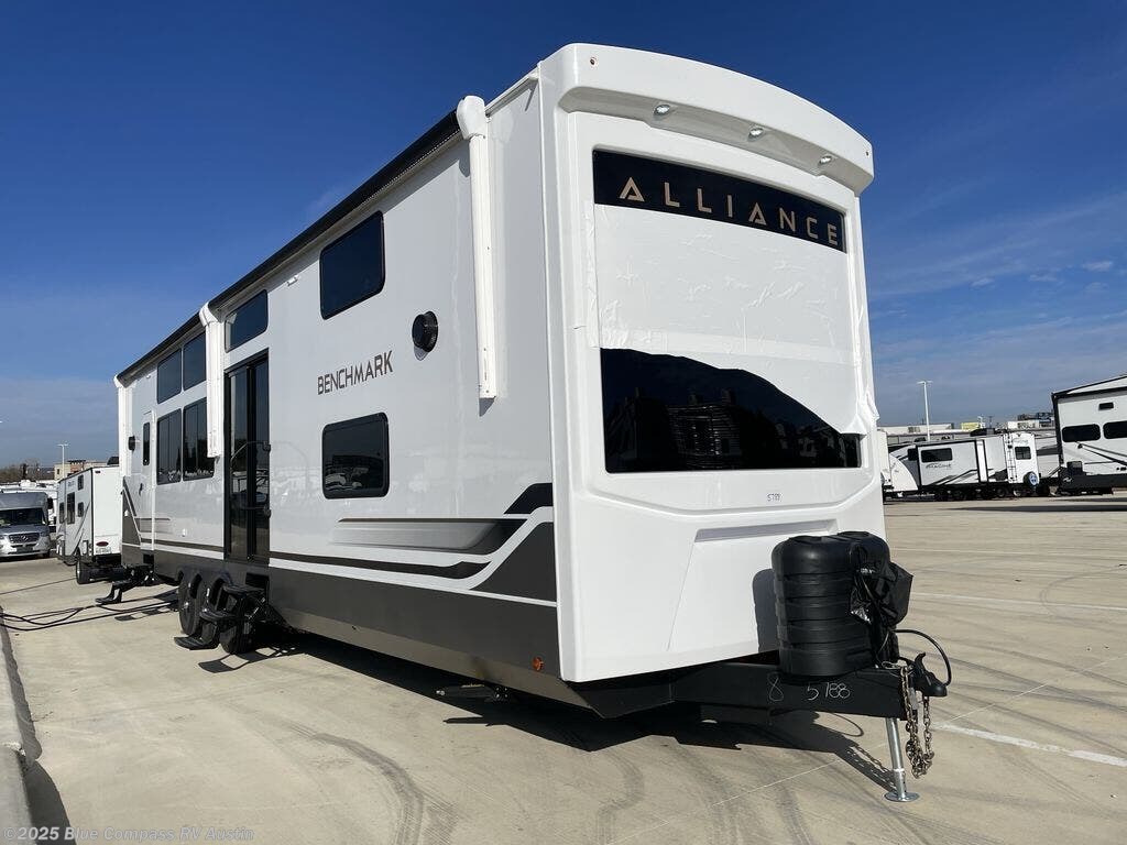 With any Benchmark destination trailer by Alliance RV, you will enjoy luxury features at every turn! The high gloss fiberglass exterior is ultra sleek, and the Azdel composite fiberglass sidewalls add durability so you can camp for years to come. You'll also find a residential exterior garden hose connection outside, along with a powder coated aluminum rear ladder, and an auxiliary LP tank hook up if you want to bring your grill along. Head inside to find hardwood cabinetry, solid surface countertops throughout, oversized windows in all rooms, and MCD roller shades throughout. The 45,000 BTU A/C and 60,000 BTU furnace will keep you comfortable year around, and there is a stackable washer and dryer to make full-time RV living easier than ever!