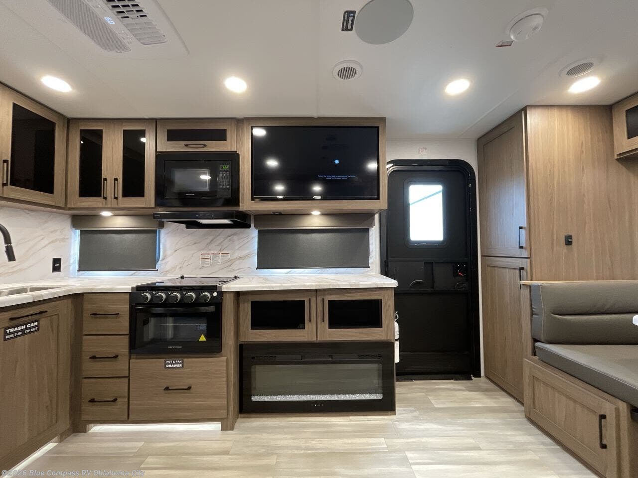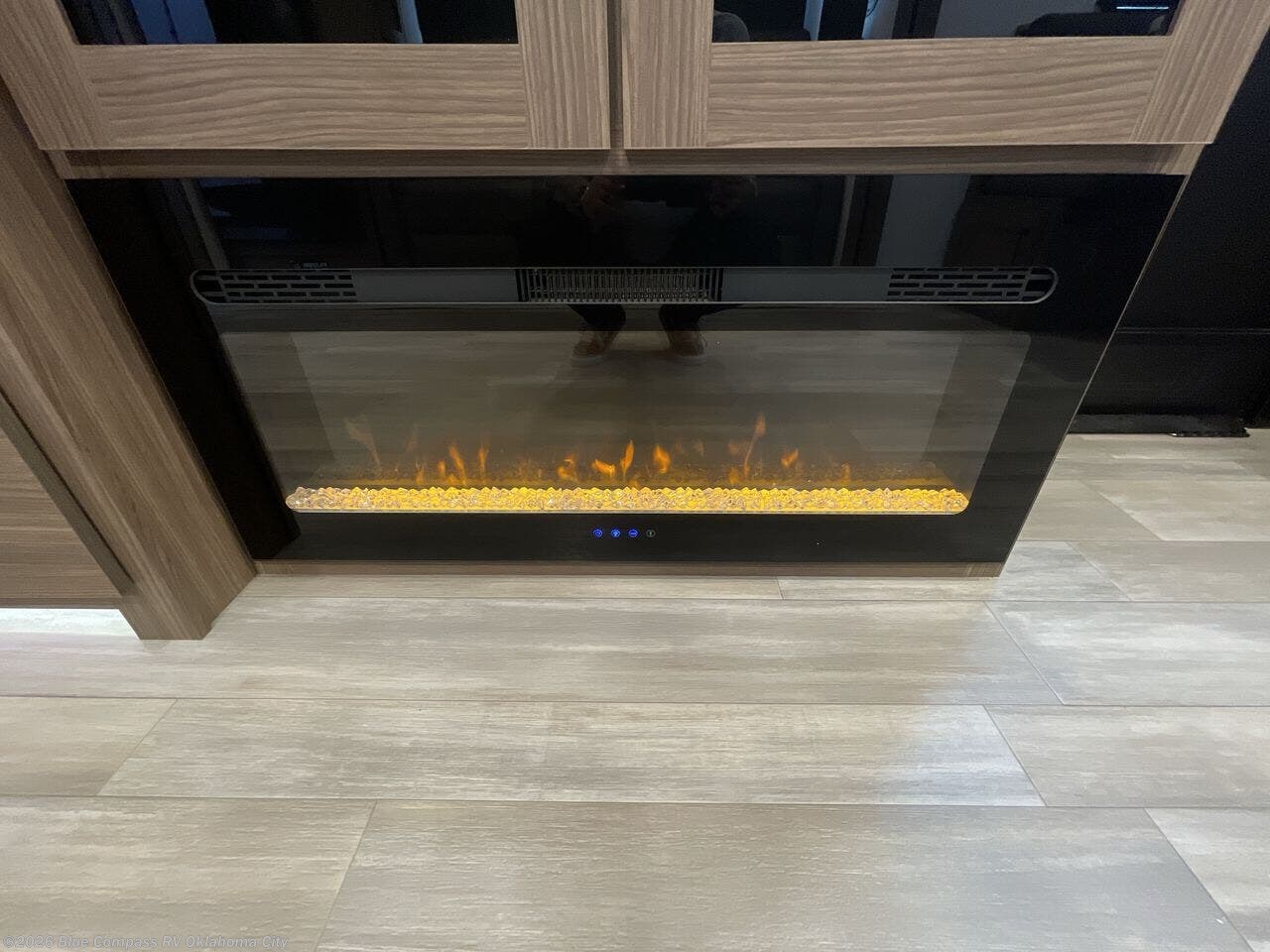 Grab your hiking boots and your sense of adventure for fun camping trips in this single slide out travel trailer. The rear booth dinette includes overhead storage for your things and the sofa slide out is in great view of the 40" HDTV. There is also a fireplace here that will make your space feel more like home plus more storage space, including an entryway closet and storage above the 10 cu. ft. 12V refrigerator. A walk-through bath will take you to the front master bedroom with a queen bed, wardrobe nightstands, plus its own exterior entry door!