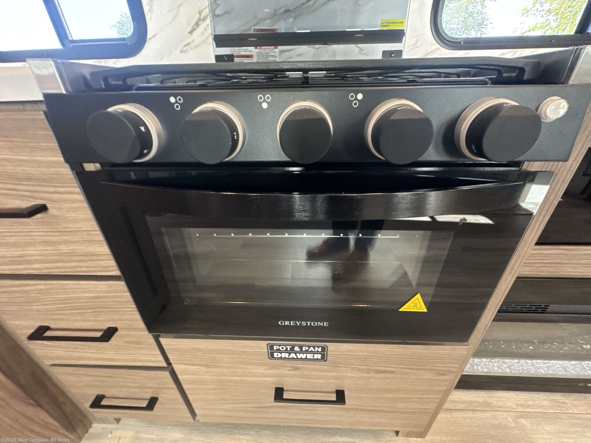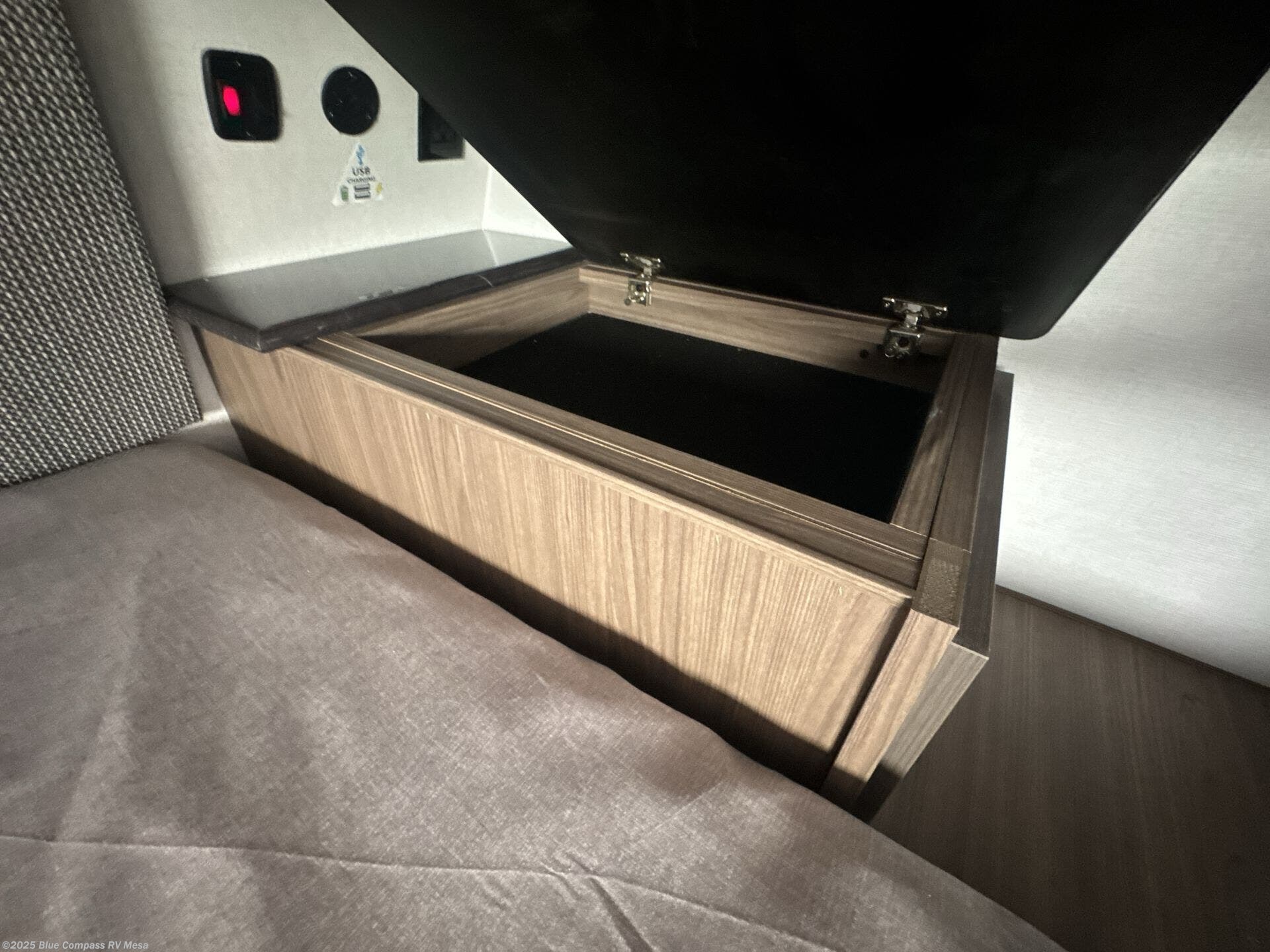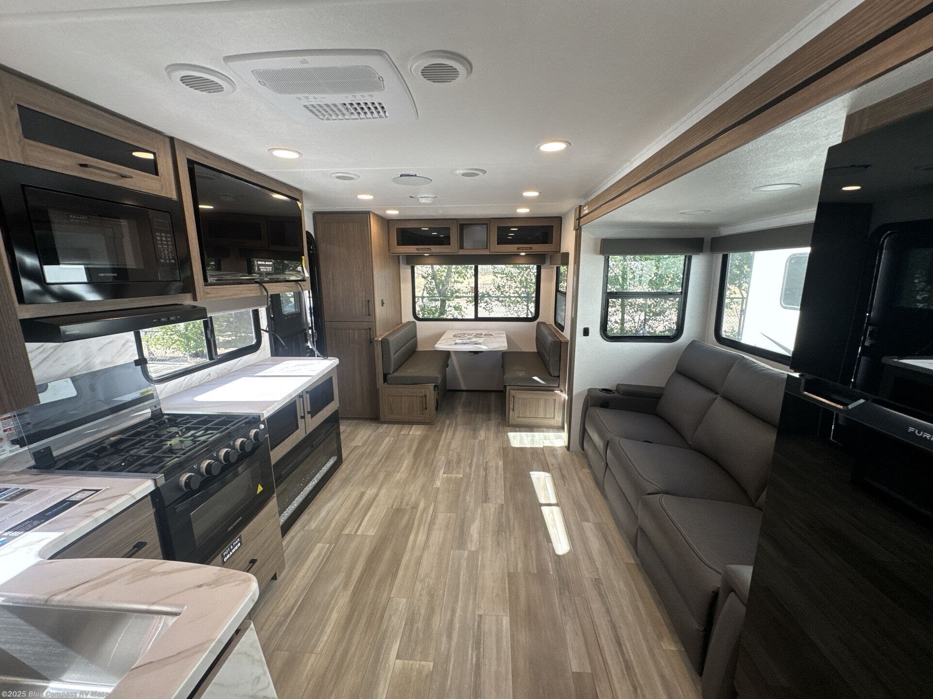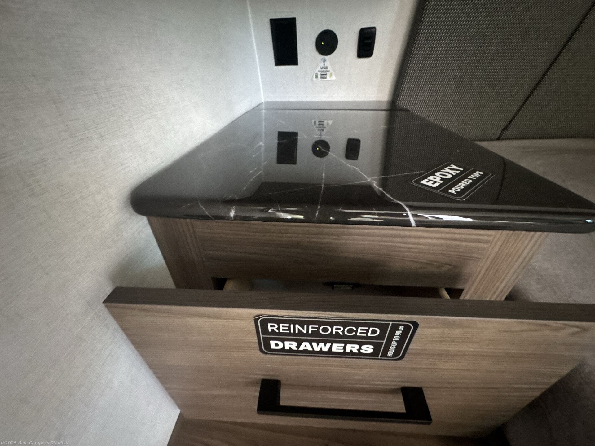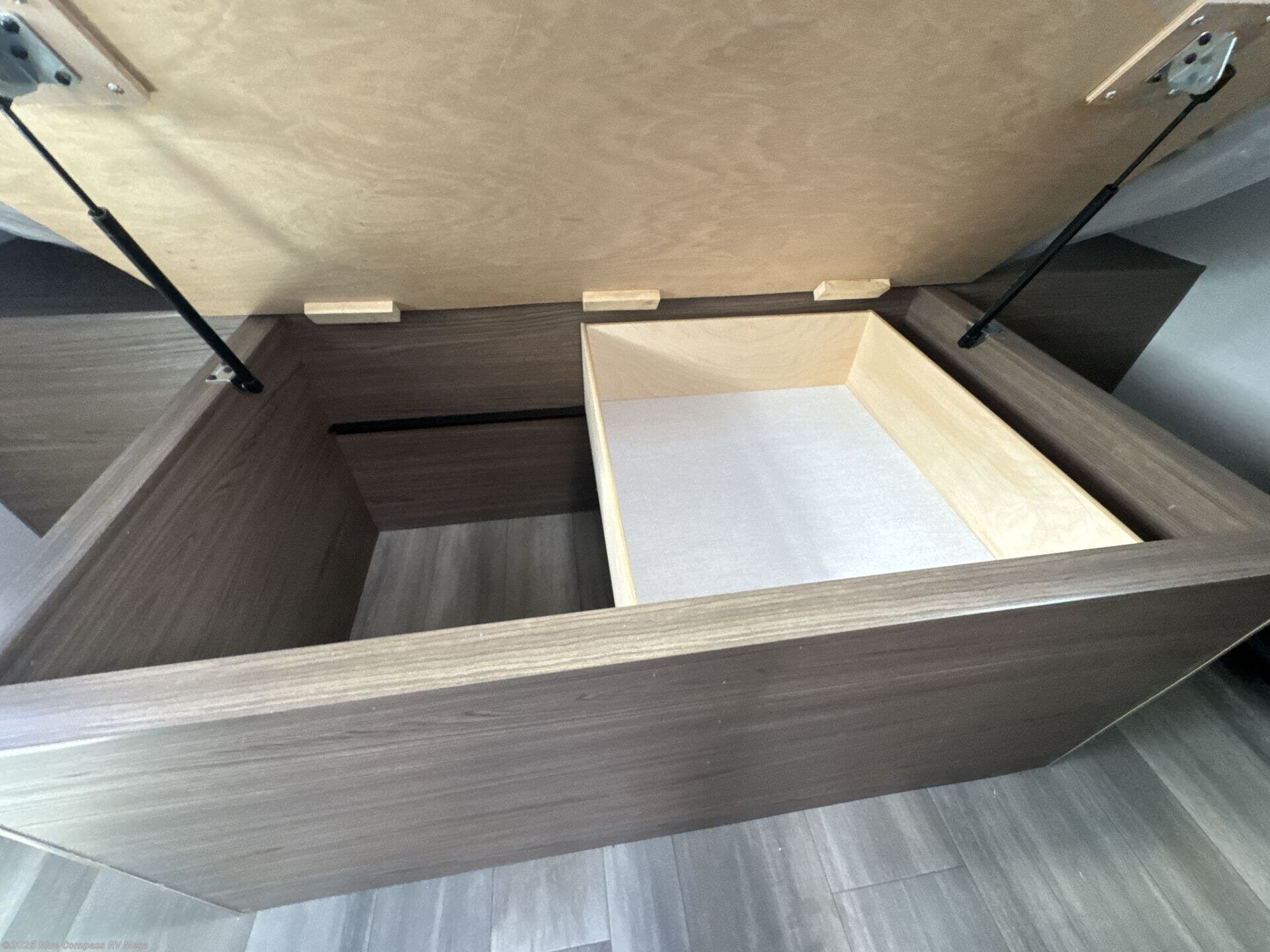 Grab your hiking boots and your sense of adventure for fun camping trips in this single slide out travel trailer. The rear booth dinette includes overhead storage for your things and the sofa slide out is in great view of the 40" HDTV. There is also a fireplace here that will make your space feel more like home plus more storage space, including an entryway closet and storage above the 10 cu. ft. 12V refrigerator. A walk-through bath will take you to the front master bedroom with a queen bed, wardrobe nightstands, plus its own exterior entry door!