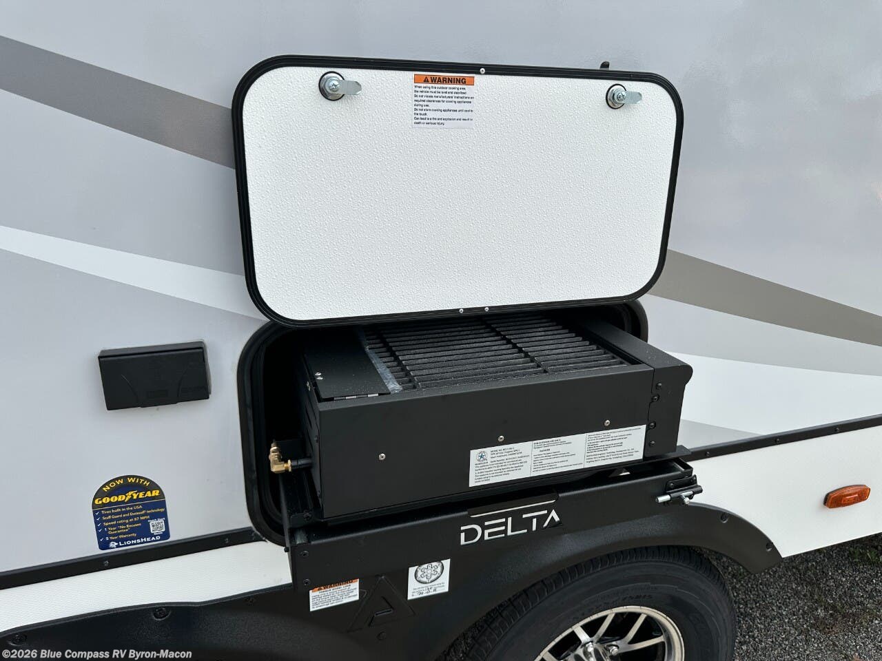 You will love all of your adventures with this Delta travel trailer in tow! This unit is perfect for a couple or even a family of four or six with a queen bed in the front private bedroom, and also using the sofa and U-shaped dinette once converted for more sleeping space. The U-shaped dinette is great for gathering for meals, a board game or game of cards, and the sofa is directly opposite a 40" HDTV which makes viewing enjoyable. You can easily prepare all of your favorite meals and snacks with the kitchen amenities provided inside. A three burner range allows you to easily cook indoors, or you can cook outside using the outdoor griddle/grill if you like. There is a 10 cu. ft. 12V refrigerator to keep all of your perishables and drinks nice and cold, plus a large sink for dishes and cleaning up, and a convenient pull-out trash can and flip-up counter extension as well. You will also appreciate the full rear bath featuring a 30" x 36" shower, toilet, vanity with sink, and linen cabinet for your towels and toiletries.