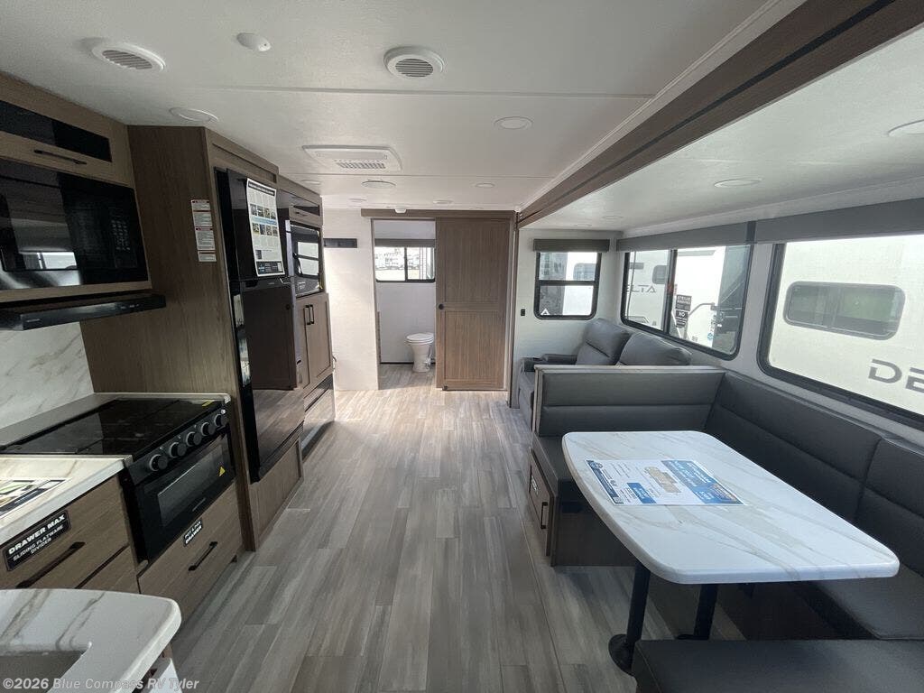 You will love all of your adventures with this Delta travel trailer in tow! This unit is perfect for a couple or even a family of four or six with a queen bed in the front private bedroom, and also using the sofa and U-shaped dinette once converted for more sleeping space. The U-shaped dinette is great for gathering for meals, a board game or game of cards, and the sofa is directly opposite a 40" HDTV which makes viewing enjoyable. You can easily prepare all of your favorite meals and snacks with the kitchen amenities provided inside. A three burner range allows you to easily cook indoors, or you can cook outside using the outdoor griddle/grill if you like. There is a 10 cu. ft. 12V refrigerator to keep all of your perishables and drinks nice and cold, plus a large sink for dishes and cleaning up, and a convenient pull-out trash can and flip-up counter extension as well. You will also appreciate the full rear bath featuring a 30" x 36" shower, toilet, vanity with sink, and linen cabinet for your towels and toiletries.