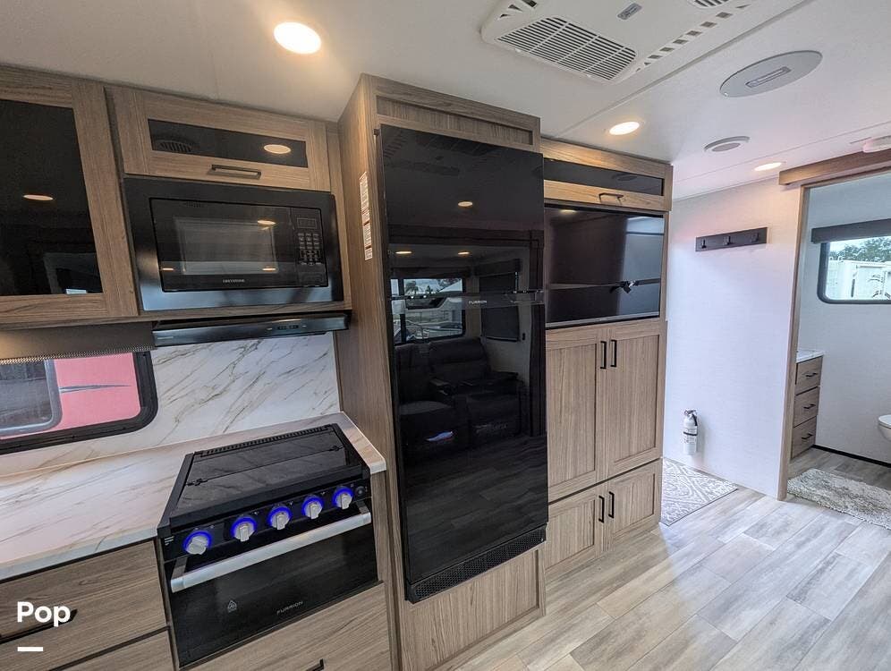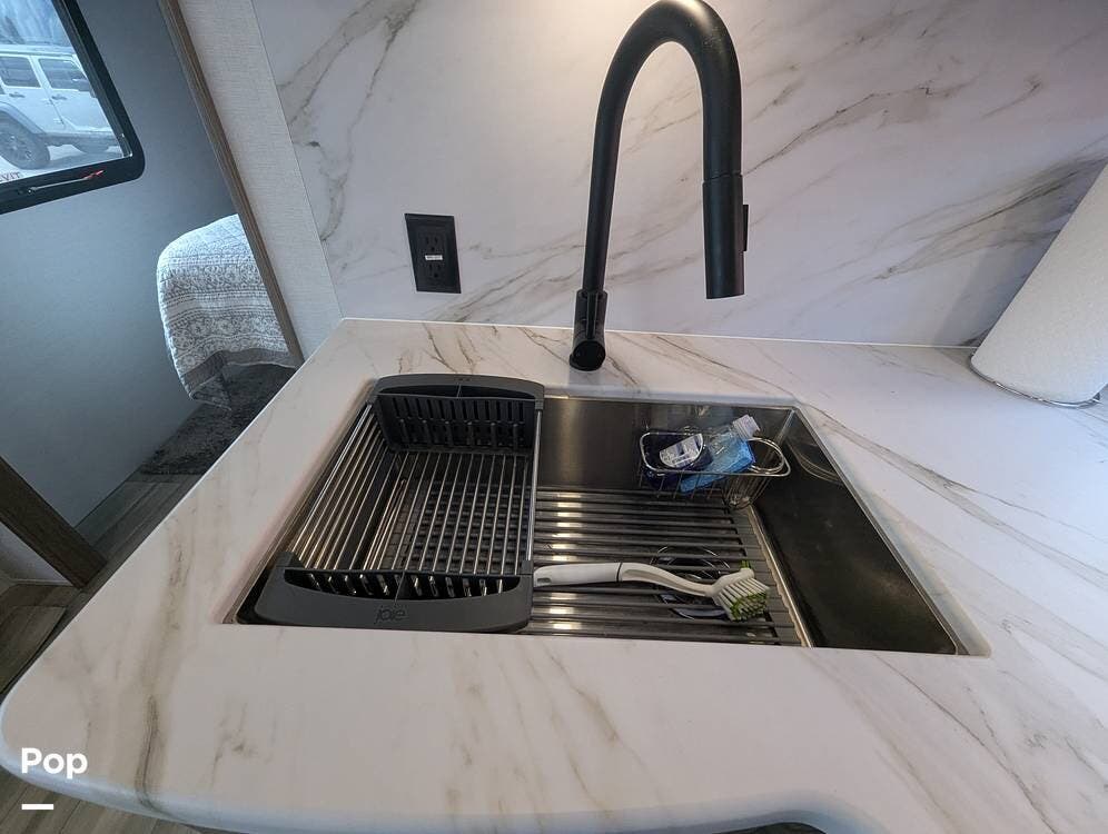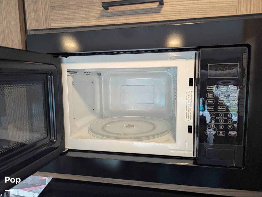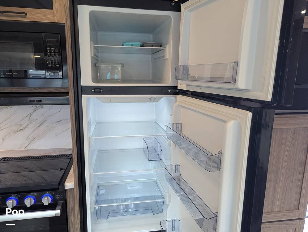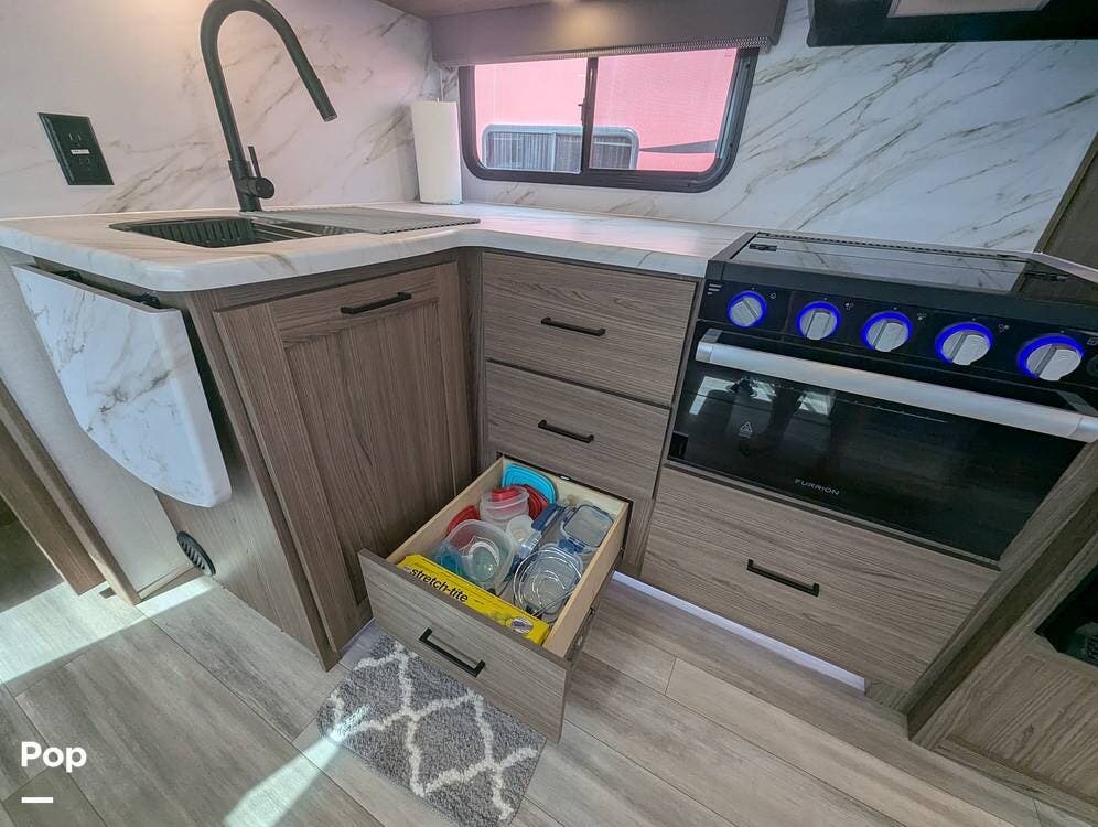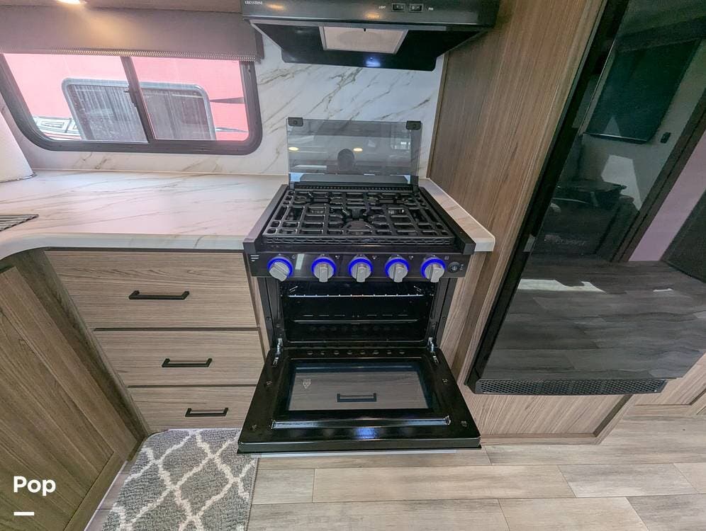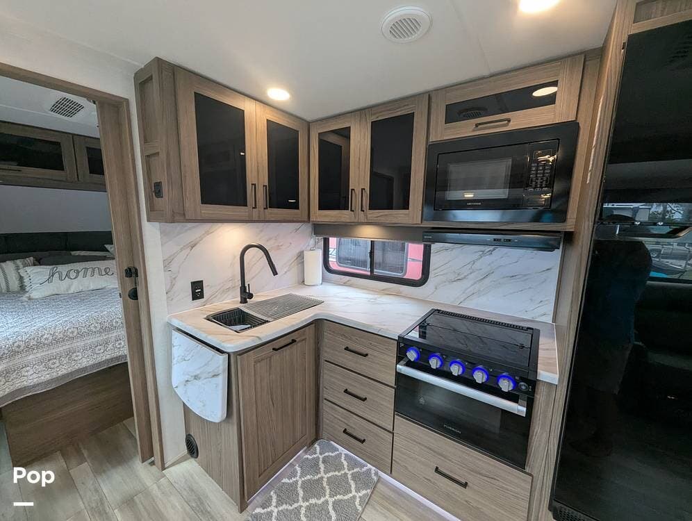The galley has a nice farmhouse sink with an extendable countertop. There is an oven, a three-burner stove, and a microwave. The refrigerator is midsize for longer camping stays.