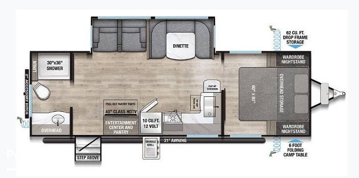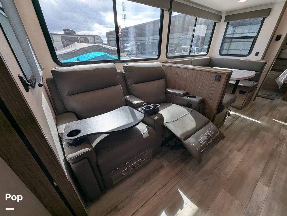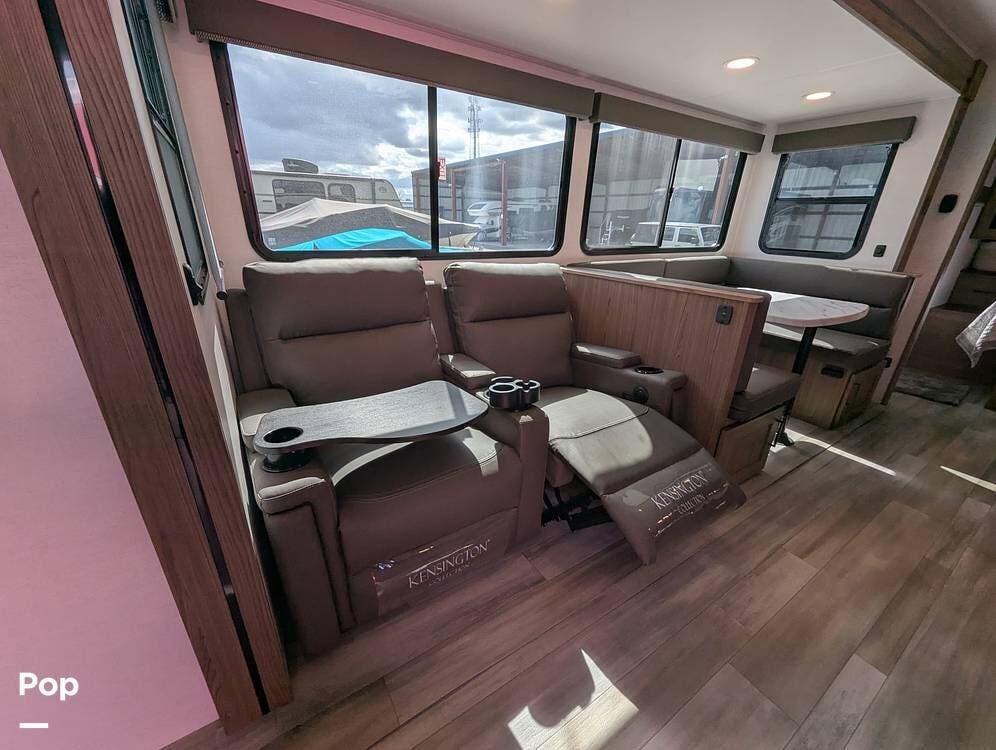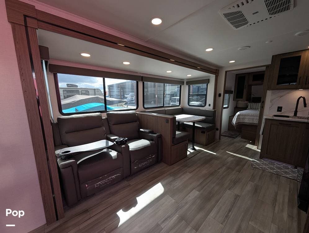 The two recliners sit adjacent to the TV with a storage cabinet with pull-out trays and more storage below. The dinette is U-shaped and will drop down to a bed if extra sleeping space is needed.