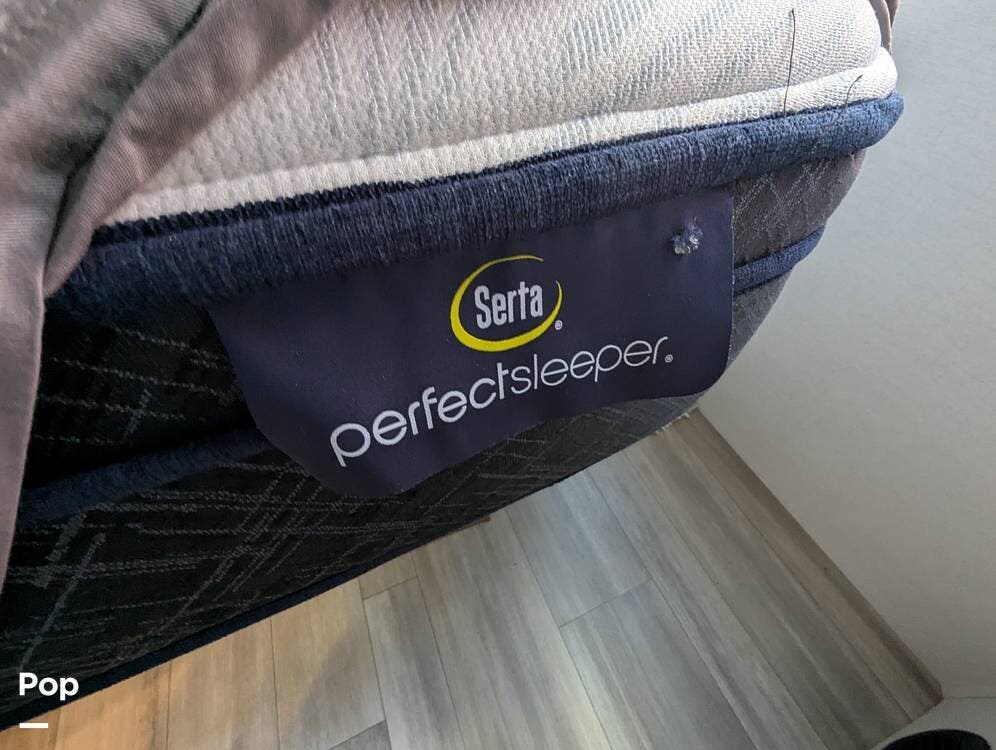 The master bedroom has its own air conditioner, an upgraded mattress, USB and 110-volt outlets conveniently placed, and two hanging cabinets for your clothes with overhead storage.