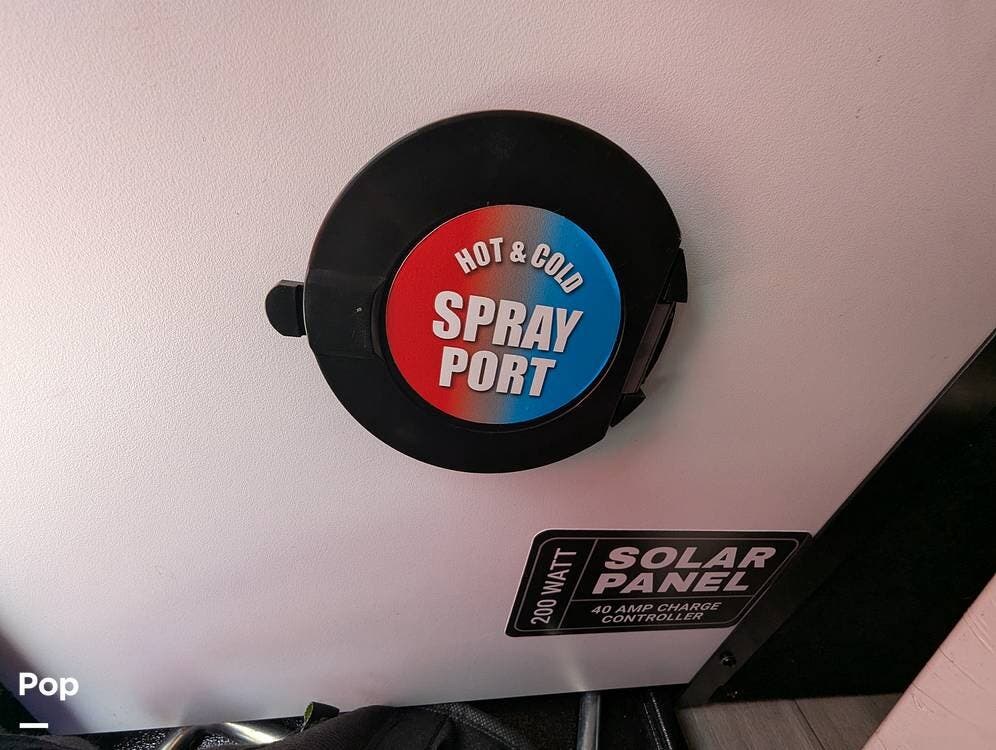 The exterior has a pass-through compartment for storage. The seller added side and rear cameras for convenience. There is a solar panel up on the roof. The ladder at the rear of the camper is extra wide and heavy-duty. The outdoor kitchen is nice for cooking out, and the front compartment houses a table!