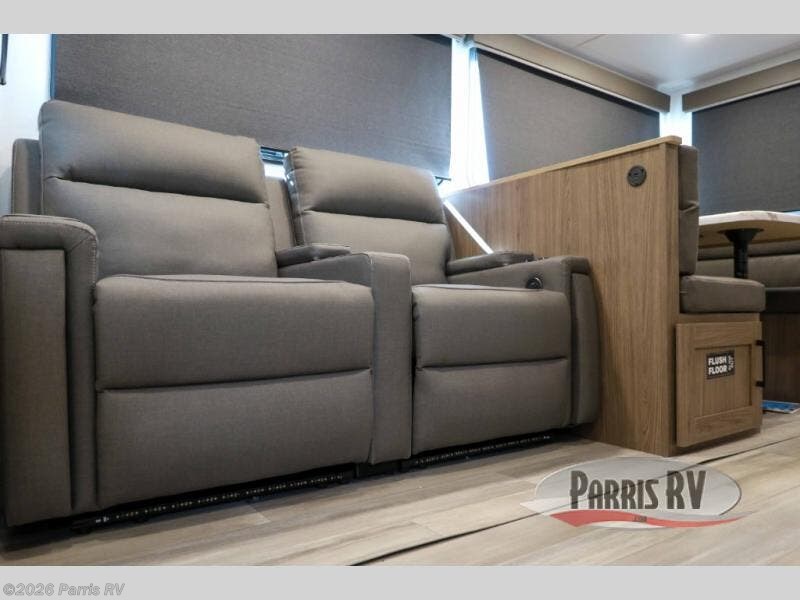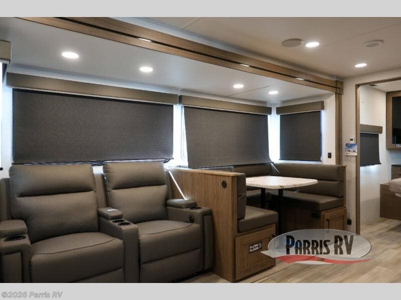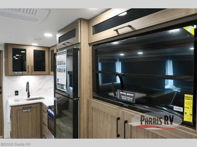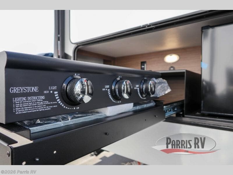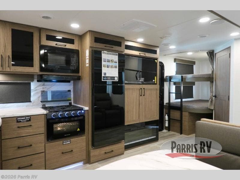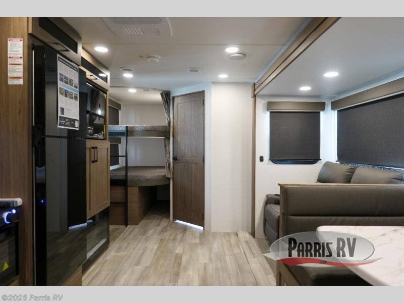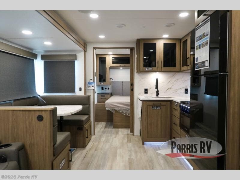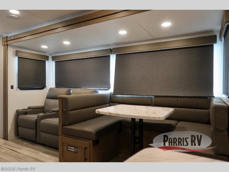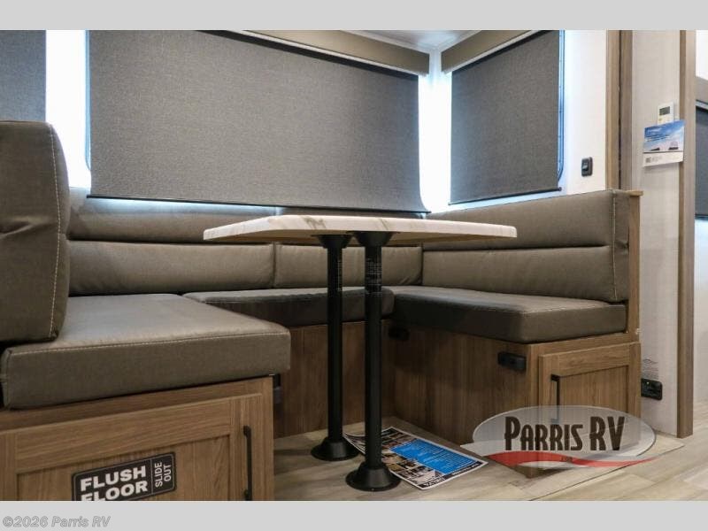 The perfect travel trailer for a larger family or one that enjoys traveling with friends! One large slide opens up the interior living space nice and features a U-shaped dinette and theater seating to provide plenty of seating for everyone. Enjoy the 40" HDTV opposite the seating for a movie indoors, and game night will be easy with everyone at the dinette which can also be converted for added sleeping if needed. The double entry doors will make loading and unloading simple, and allows you to easily slip in and out of the private bedroom for a morning walk. You can easily prepare all of your favorite meals and snacks with the kitchen amenities provided inside. A three burner range allows you to easily cook indoors, or you can enjoy cooking outside using the outdoor griddle/grill if you like. There is a 10 cu. ft. 12V refrigerator to keep all of your perishables and drinks nice and cold, plus a large sink for dishes and cleaning up, and there is also a flip-up counter extension for more prep space. You will also appreciate the rear corner bath featuring a 30" x 36" shower, vanity with sink, soft close porcelain toilet with foot flush, and linen cabinet for your towels.