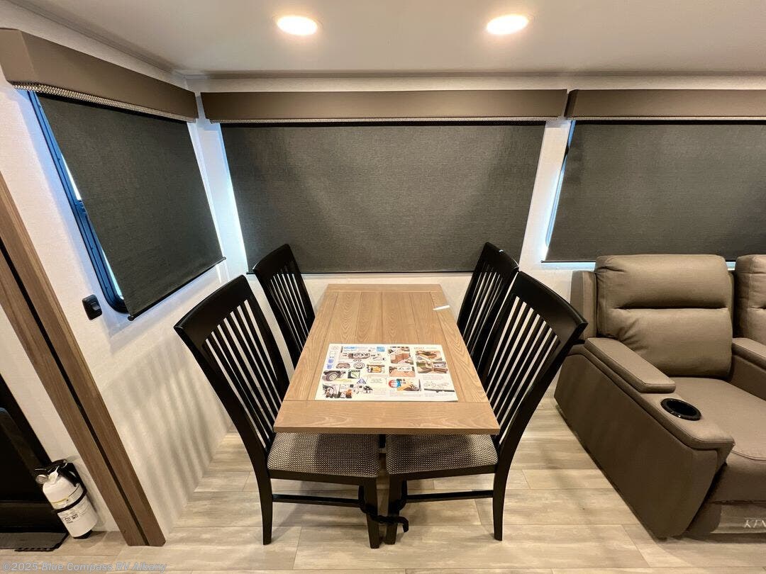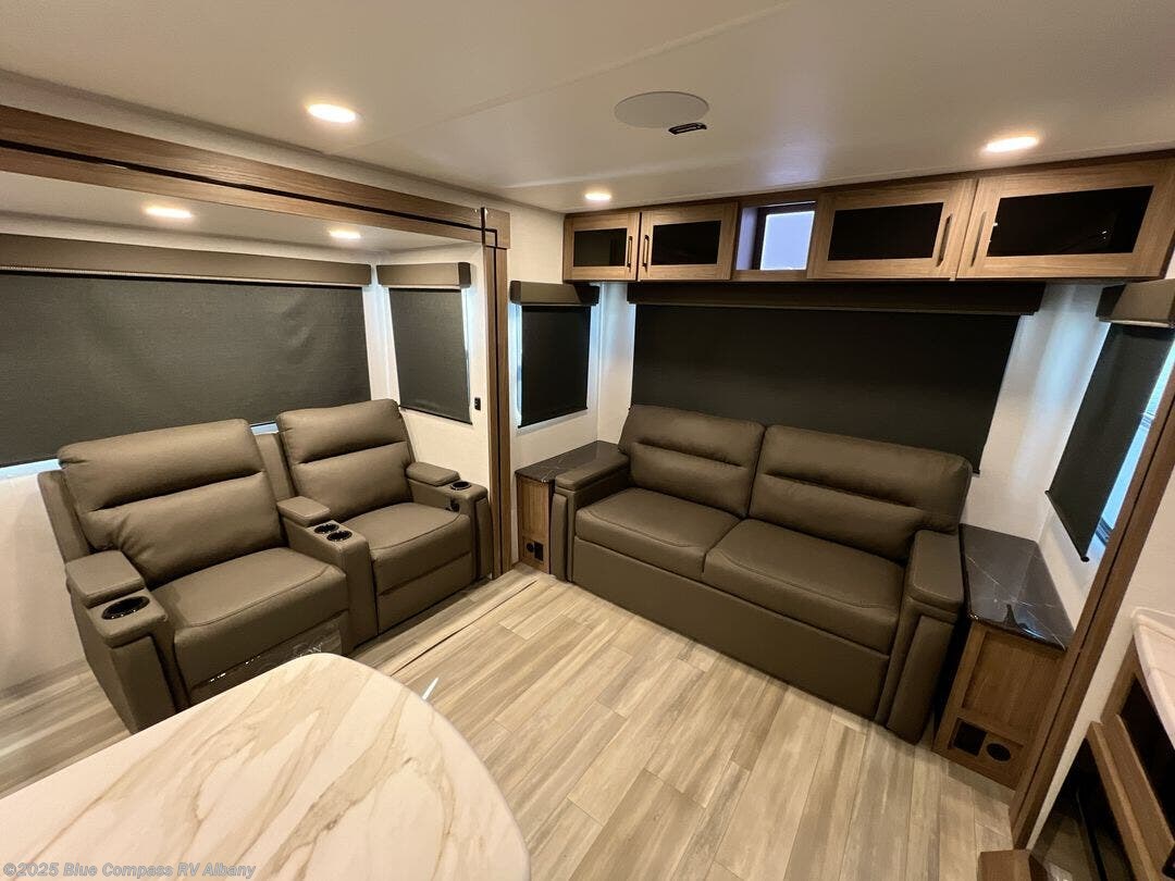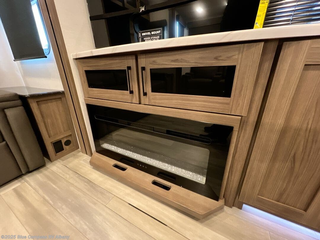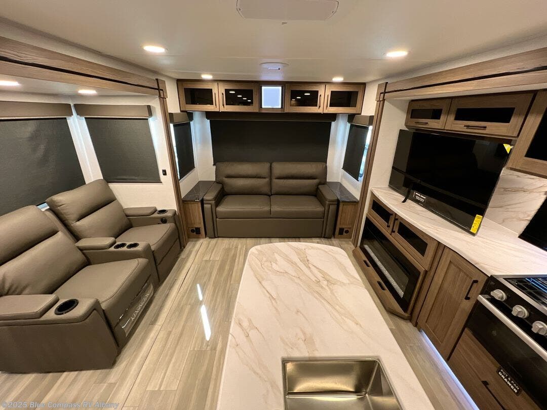 You will feel right at home camping in this travel trailer! The rear living area has a rear sofa and a set of theater seating conveniently across from the entertainment center with a 50" class HDTV above a pull-out fireplace storage for a cozy evening indoors. Prepare your best home cooked meals with the three burner cooktop, kitchen island which even has a tip-out trash can, and 10 cu. ft. 12V refrigerator. Enjoy your meals at the free standing dinette then either freshen up in the full bathroom with the 30" x 36" shower or head outside to relax under one of the two awnings. The front private bedroom has a queen bed for you to lay your head on at night and has wardrobe nightstands for your items!