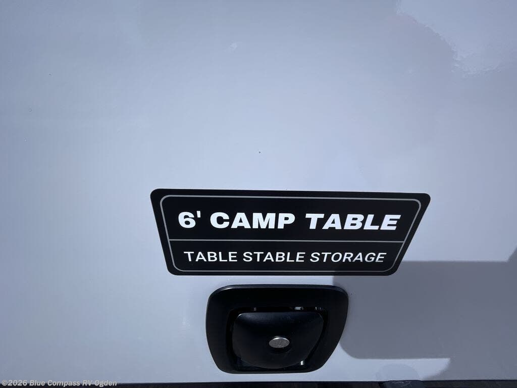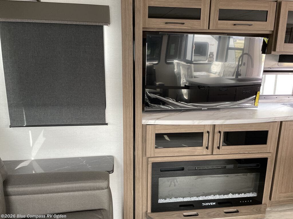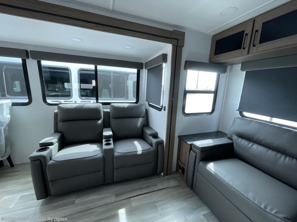 You will feel right at home camping in this travel trailer! The rear living area has a rear sofa and a set of theater seating conveniently across from the entertainment center with a 50" class HDTV above a pull-out fireplace storage for a cozy evening indoors. Prepare your best home cooked meals with the three burner cooktop, kitchen island which even has a tip-out trash can, and 10 cu. ft. 12V refrigerator. Enjoy your meals at the free standing dinette then either freshen up in the full bathroom with the 30" x 36" shower or head outside to relax under one of the two awnings. The front private bedroom has a queen bed for you to lay your head on at night and has wardrobe nightstands for your items!