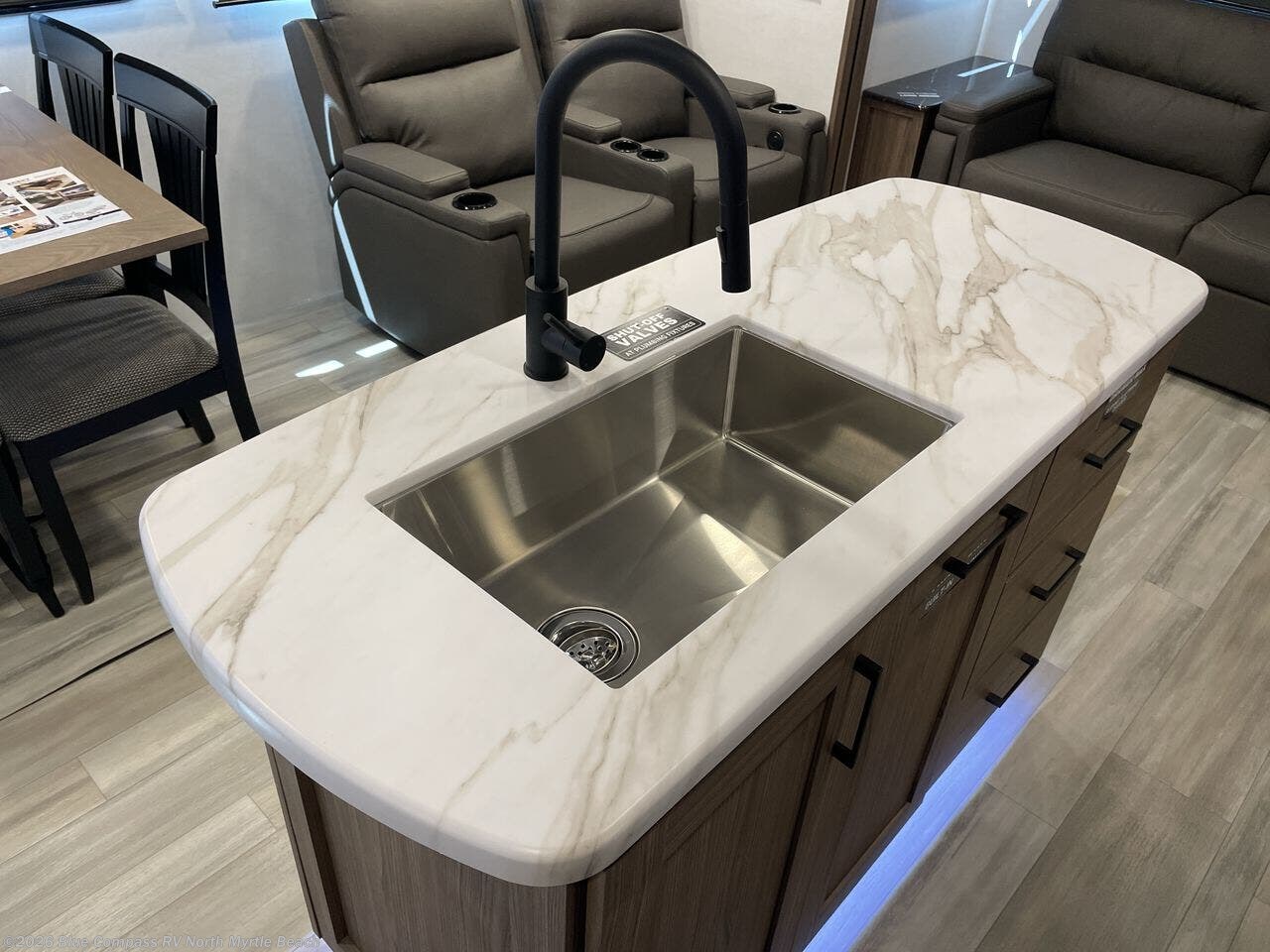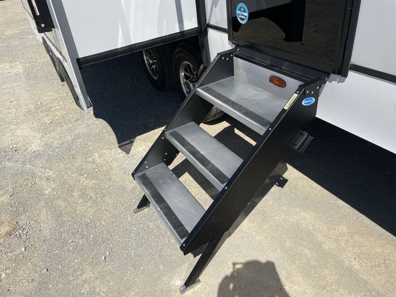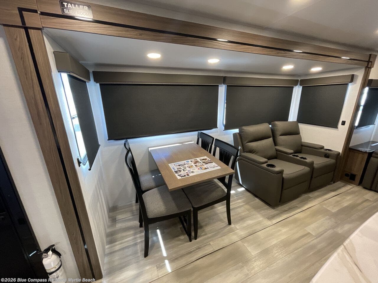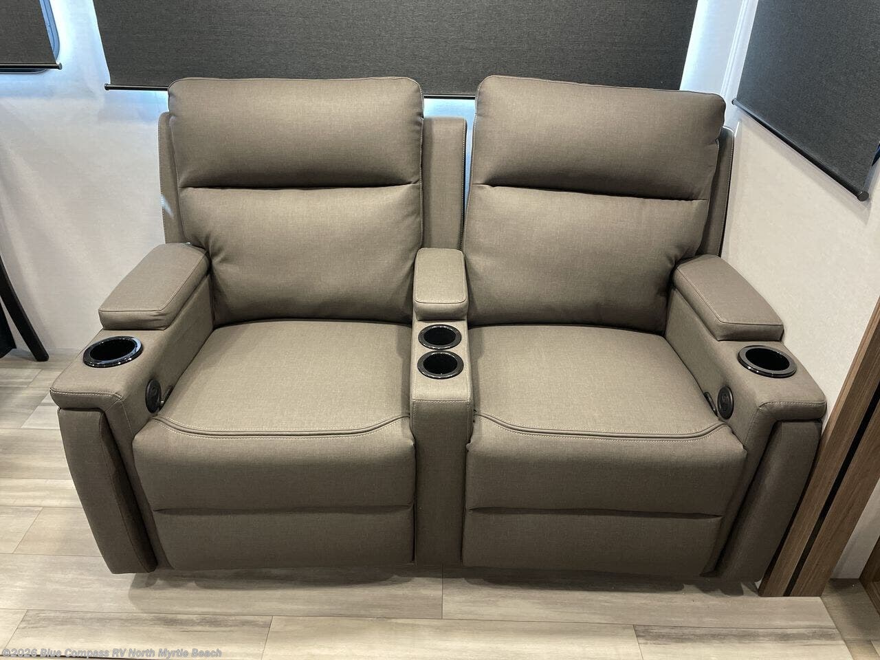 You will feel right at home camping in this travel trailer! The rear living area has a rear sofa and a set of theater seating conveniently across from the entertainment center with a 50" class HDTV above a pull-out fireplace storage for a cozy evening indoors. Prepare your best home cooked meals with the three burner cooktop, kitchen island which even has a tip-out trash can, and 10 cu. ft. 12V refrigerator. Enjoy your meals at the free standing dinette then either freshen up in the full bathroom with the 30" x 36" shower or head outside to relax under one of the two awnings. The front private bedroom has a queen bed for you to lay your head on at night and has wardrobe nightstands for your items!
