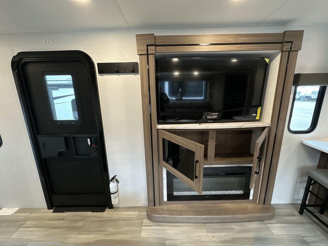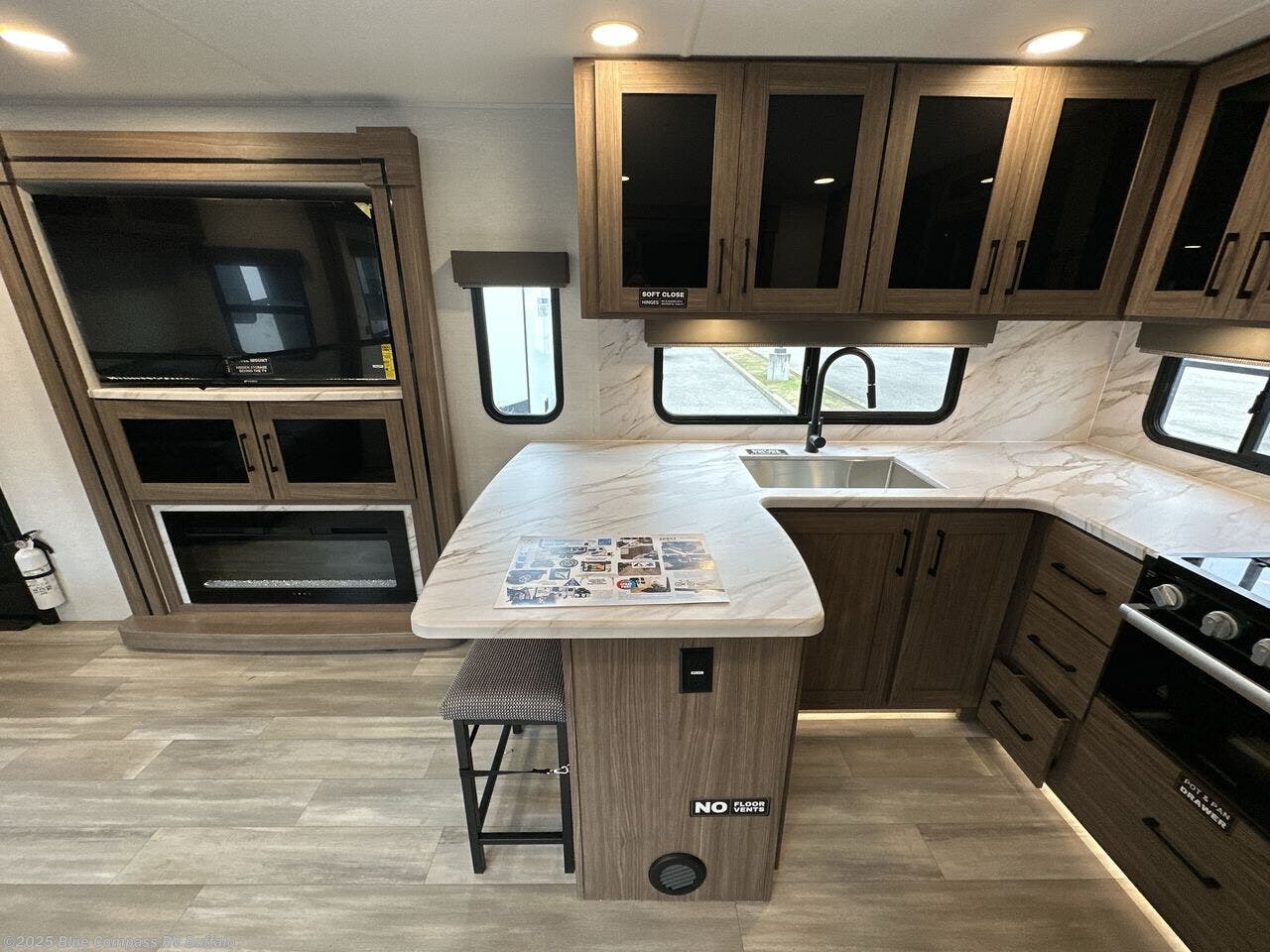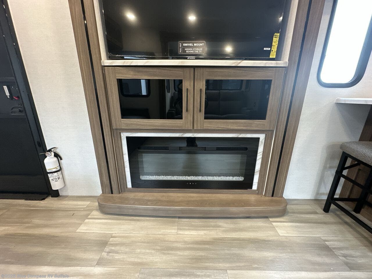 Start camping in luxury with this travel trailer! Prepare your best home cooked meals in the rear kitchen with the three burner cooktop, 10 cu. ft. 12V refrigerator, tip-out trash can, and even two bar stools to enjoy your morning coffee while reading the newspaper. Freshen up in the full bathroom with the 30" x 36" shower or head outside to relax under one of the two awnings. There is even an outdoor griddle/grill underneath one of the awnings to protect you while you grill up some juicy burgers, plus an outside 32" TV. The front private bedroom has a queen bed for you to lay your head on at night and has wardrobe nightstands for your items. Relax in true comfort each night on one of the two furniture spots in front of the entertainment center with a 50" class HDTV with a fireplace below it!