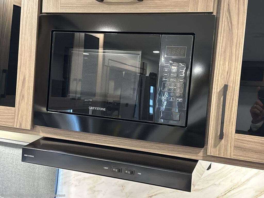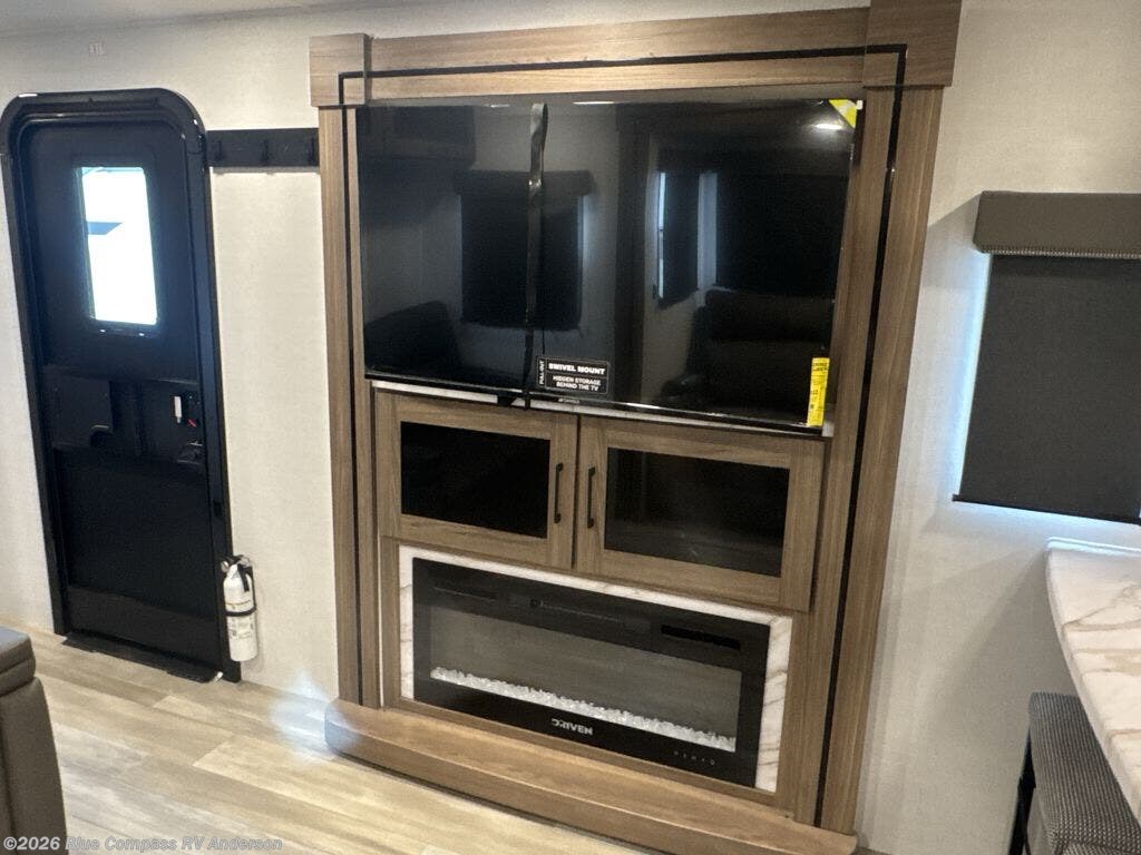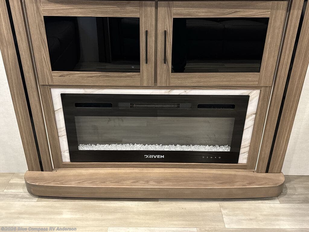 Start camping in luxury with this travel trailer! Prepare your best home cooked meals in the rear kitchen with the three burner cooktop, 10 cu. ft. 12V refrigerator, tip-out trash can, and even two bar stools to enjoy your morning coffee while reading the newspaper. Freshen up in the full bathroom with the 30" x 36" shower or head outside to relax under one of the two awnings. There is even an outdoor griddle/grill underneath one of the awnings to protect you while you grill up some juicy burgers, plus an outside 32" TV. The front private bedroom has a queen bed for you to lay your head on at night and has wardrobe nightstands for your items. Relax in true comfort each night on one of the two furniture spots in front of the entertainment center with a 50" class HDTV with a fireplace below it!