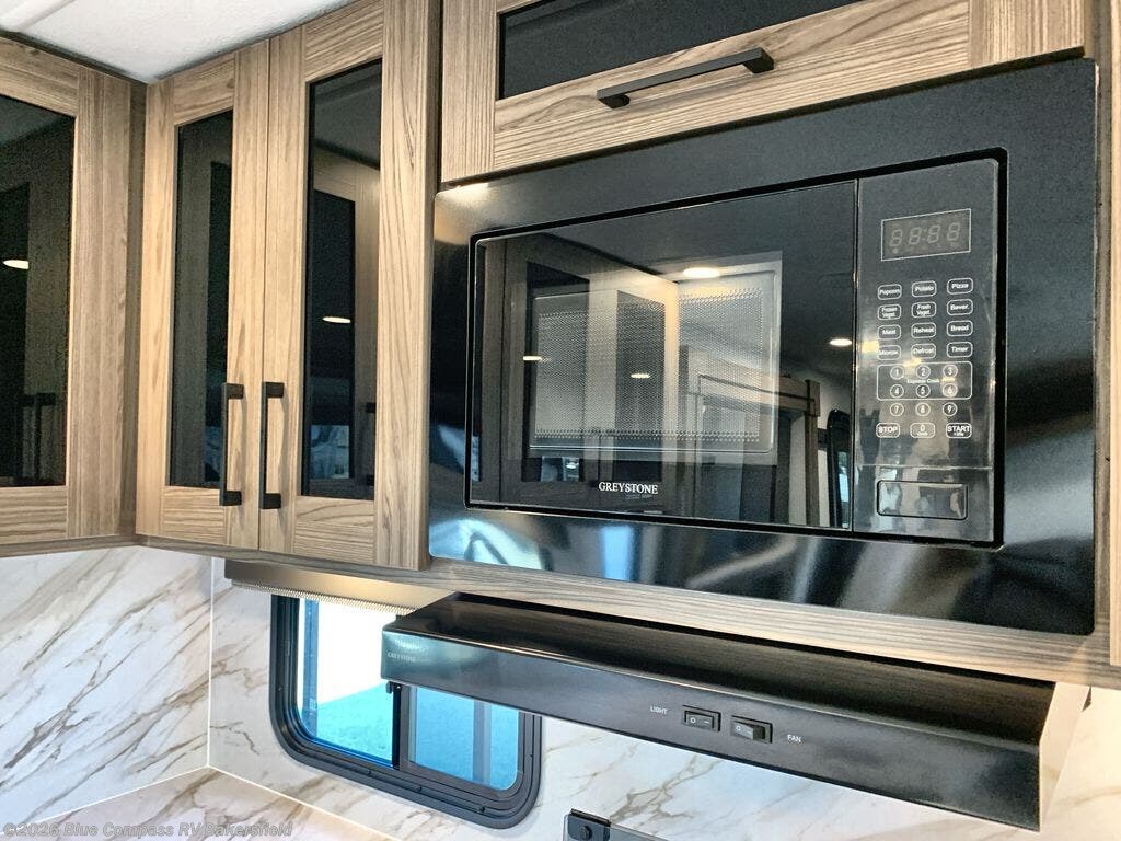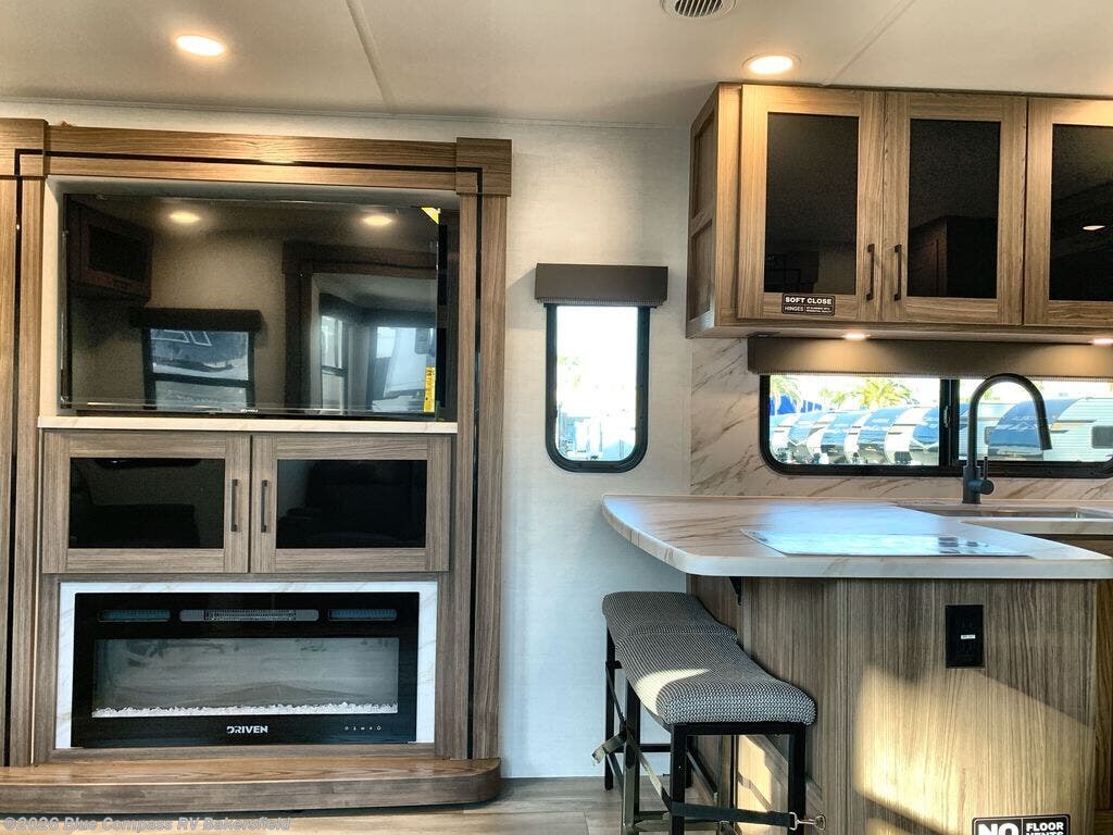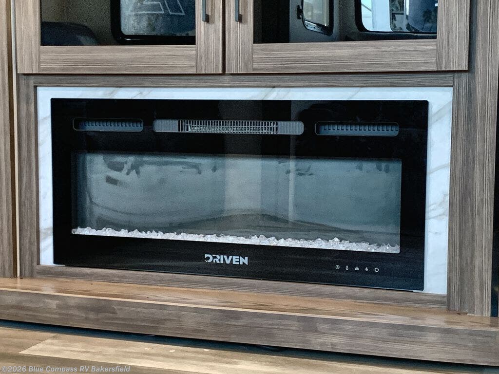 Start camping in luxury with this travel trailer! Prepare your best home cooked meals in the rear kitchen with the three burner cooktop, 10 cu. ft. 12V refrigerator, tip-out trash can, and even two bar stools to enjoy your morning coffee while reading the newspaper. Freshen up in the full bathroom with the 30" x 36" shower or head outside to relax under one of the two awnings. There is even an outdoor griddle/grill underneath one of the awnings to protect you while you grill up some juicy burgers, plus an outside 32" TV. The front private bedroom has a queen bed for you to lay your head on at night and has wardrobe nightstands for your items. Relax in true comfort each night on one of the two furniture spots in front of the entertainment center with a 50" class HDTV with a fireplace below it!