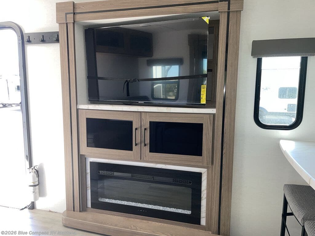 Start camping in luxury with this travel trailer! Prepare your best home cooked meals in the rear kitchen with the three burner cooktop, 10 cu. ft. 12V refrigerator, tip-out trash can, and even two bar stools to enjoy your morning coffee while reading the newspaper. Freshen up in the full bathroom with the 30" x 36" shower or head outside to relax under one of the two awnings. There is even an outdoor griddle/grill underneath one of the awnings to protect you while you grill up some juicy burgers, plus an outside 32" TV. The front private bedroom has a queen bed for you to lay your head on at night and has wardrobe nightstands for your items. Relax in true comfort each night on one of the two furniture spots in front of the entertainment center with a 50" class HDTV with a fireplace below it!