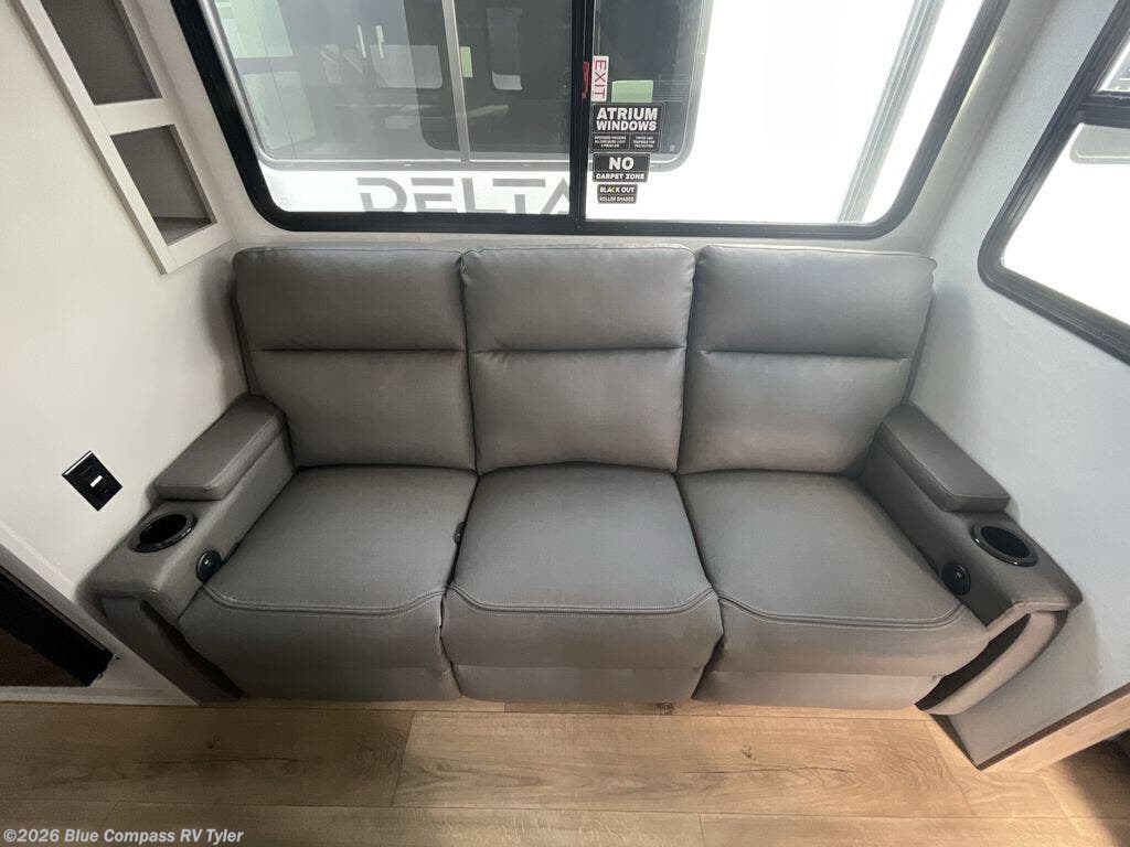 Form and function works together with every one of these Alliance RV Delta travel trailers! They are built with a walk-on roof with a seamless PVC roof covering, Mylar reinforced exterior seals, and a heated and enclosed underbelly to protect your unit in all seasons. The commercial grade vinyl flooring will be easy to clean and the oversized atrium windows throughout let in plenty of natural sunlight. With 62 cu. ft. of drop frame pass-through storage, you can bring along all of your essential camping gear plus it has USB charging for more convenience. There are many at home interior conveniences including a Bluetooth speaker, USB charging throughout, and even a pull-out kitchen trash can. Come find your favorite model today!