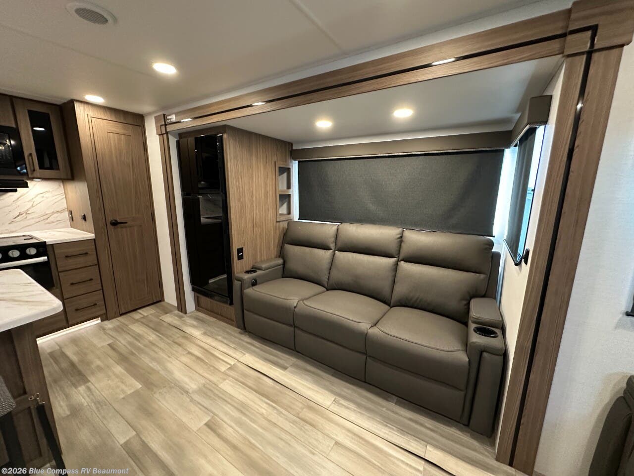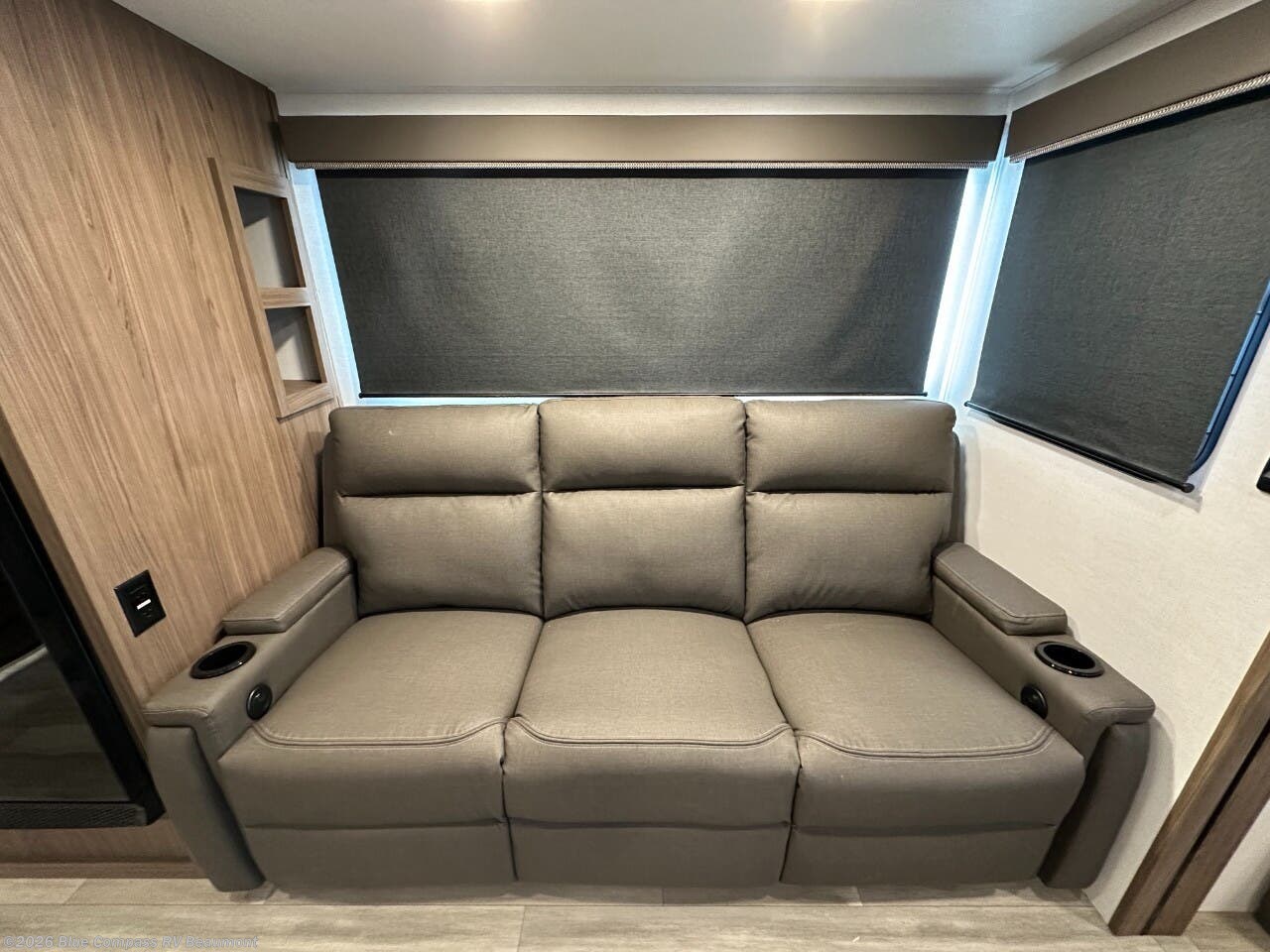 Start camping in luxury with this travel trailer! Prepare your best home cooked meals in the rear kitchen with the three burner cooktop, 10 cu. ft. 12V refrigerator, tip-out trash can, and even two bar stools to enjoy your morning coffee while reading the newspaper. Freshen up in the full bathroom with the 30" x 36" shower or head outside to relax under one of the two awnings. There is even an outdoor griddle/grill underneath one of the awnings to protect you while you grill up some juicy burgers, plus an outside 32" TV. The front private bedroom has a queen bed for you to lay your head on at night and has wardrobe nightstands for your items. Relax in true comfort each night on one of the two furniture spots in front of the entertainment center with a 50" class HDTV with a fireplace below it!