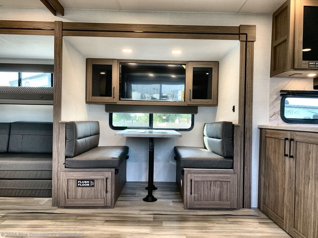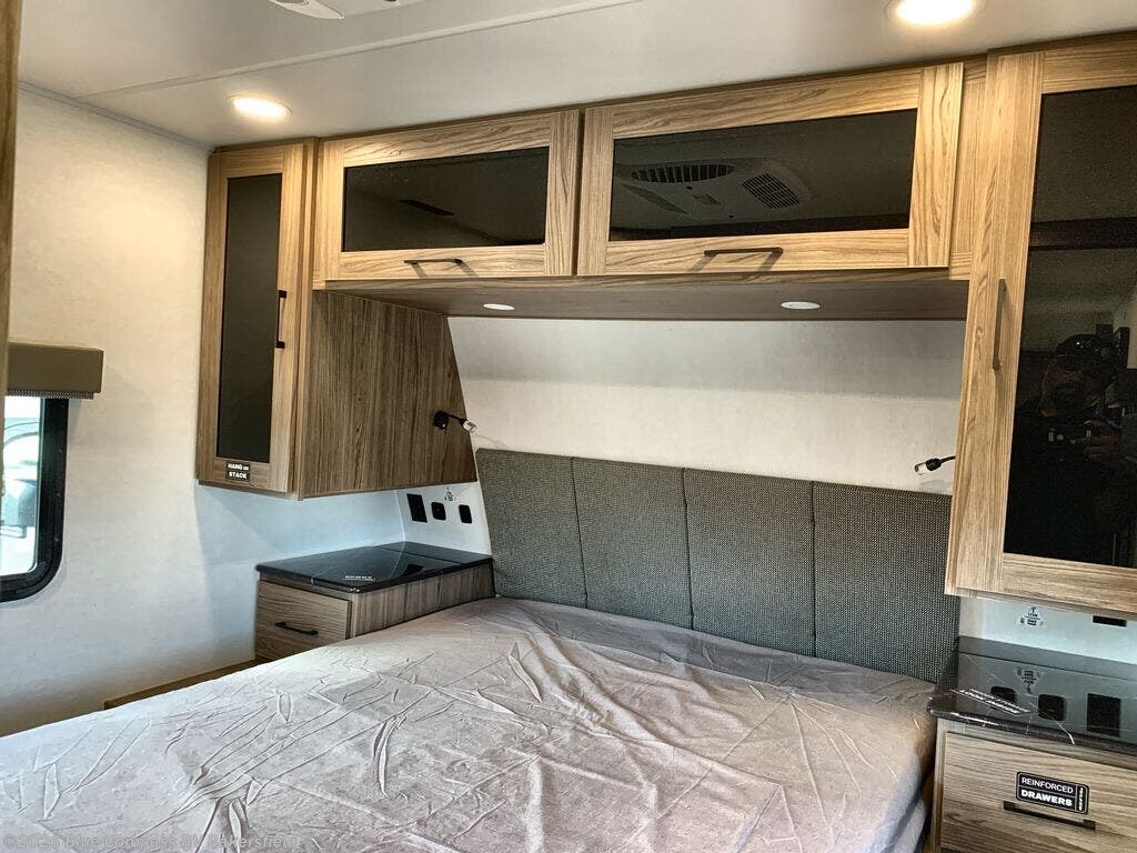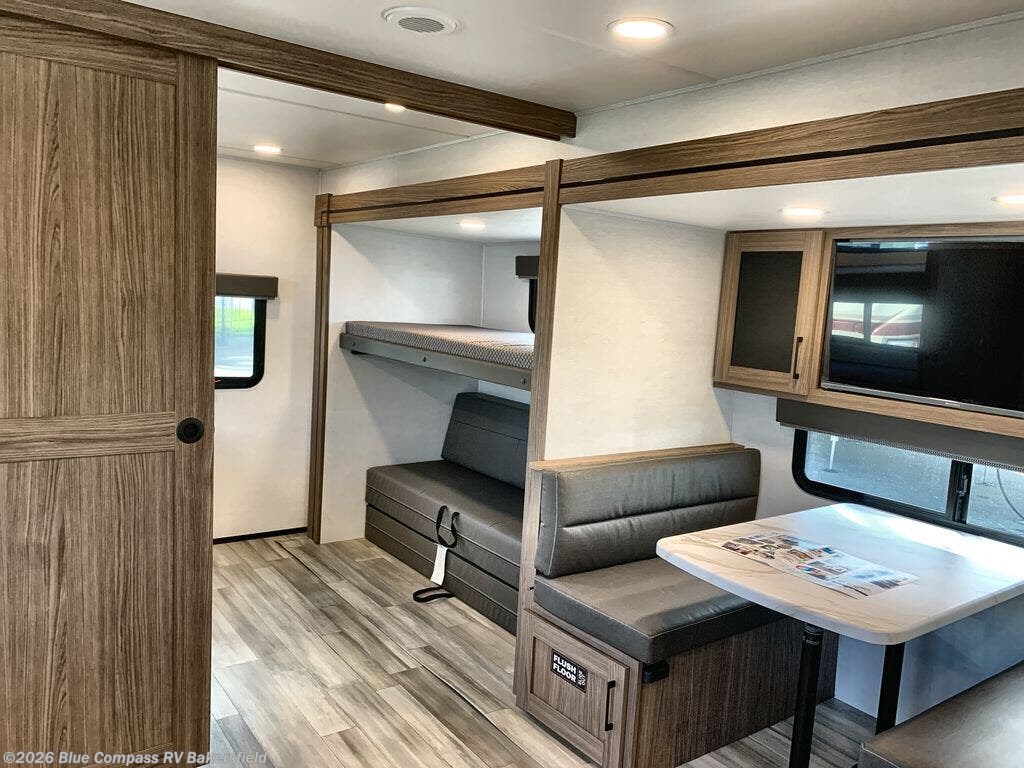 Enjoy glamping in this spacious travel trailer for eight! Your guests or the kids will love the rear bunkhouse with 40" x 72" bunk beds across from a third bunk with a cube sofa below, and the slide out will make this space more open. The slide out also includes the booth dinette in the main living area, which is across from the sofa slide out. The chef will love cooking in this Delta kitchen with generous counter space, a 10 cu. ft. 12V refrigerator, plus pull-out pantry trays for dry goods and snacks. The full bath with a 30" x 36" shower and a soft close porcelain foot flush toilet will allow you to fresh up each day without having to use the camp's facilities. And don't overlook the front private bedroom with a queen bed, wardrobe nightstands, a third wardrobe plus overhead storage; now nothing has to get left behind!