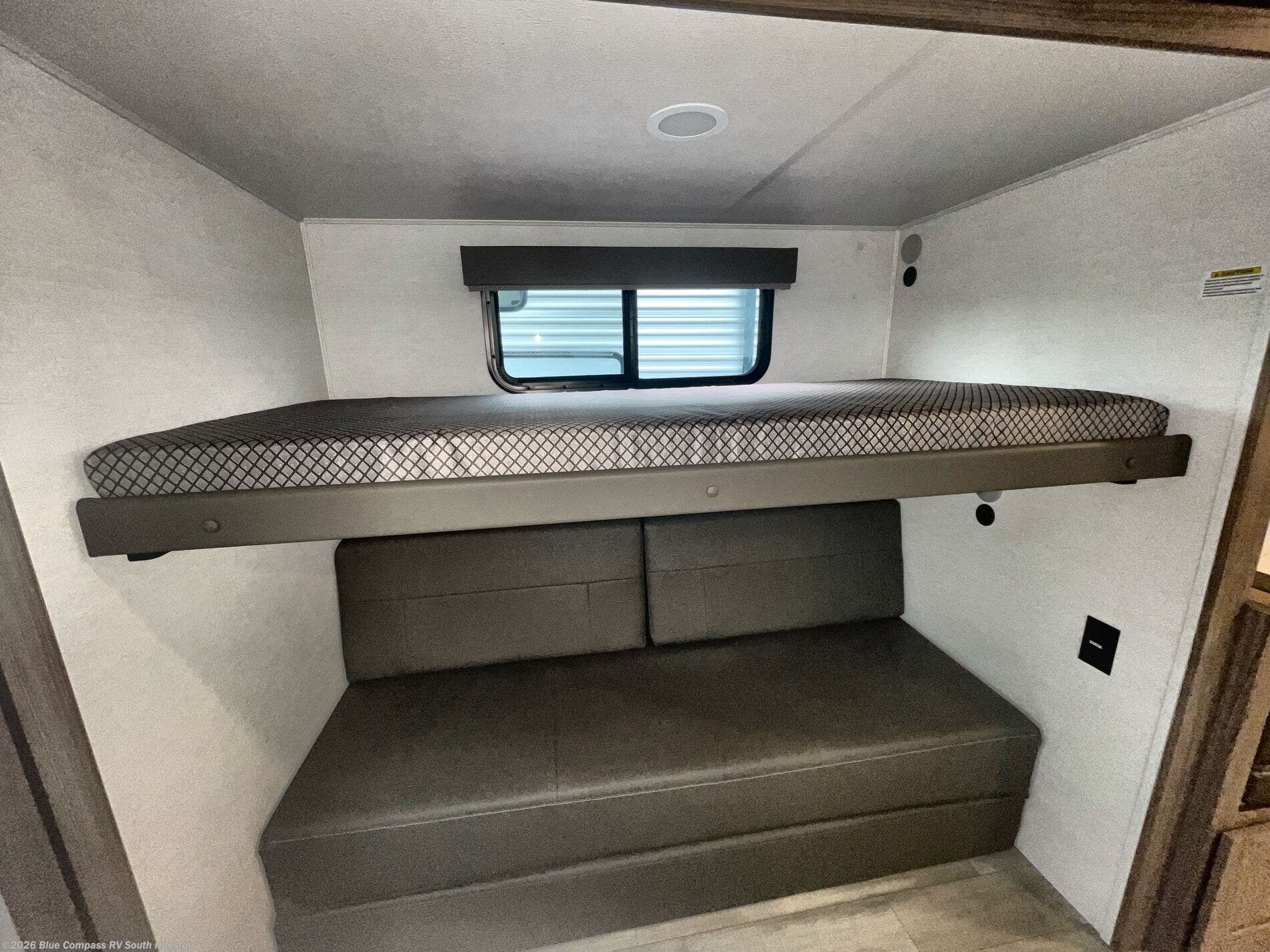 Enjoy glamping in this spacious travel trailer for eight! Your guests or the kids will love the rear bunkhouse with 40" x 72" bunk beds across from a third bunk with a cube sofa below, and the slide out will make this space more open. The slide out also includes the booth dinette in the main living area, which is across from the sofa slide out. The chef will love cooking in this Delta kitchen with generous counter space, a 10 cu. ft. 12V refrigerator, plus pull-out pantry trays for dry goods and snacks. The full bath with a 30" x 36" shower and a soft close porcelain foot flush toilet will allow you to fresh up each day without having to use the camp's facilities. And don't overlook the front private bedroom with a queen bed, wardrobe nightstands, a third wardrobe plus overhead storage; now nothing has to get left behind!