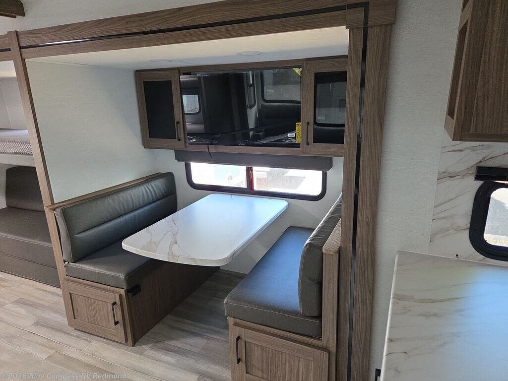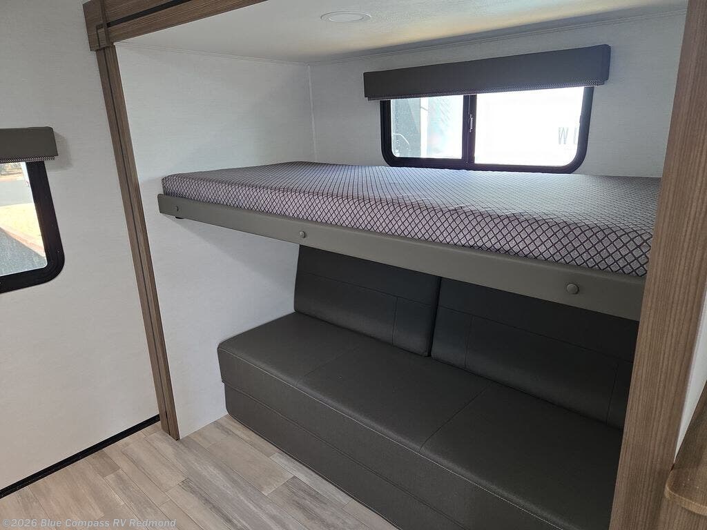 Enjoy glamping in this spacious travel trailer for eight! Your guests or the kids will love the rear bunkhouse with 40" x 72" bunk beds across from a third bunk with a cube sofa below, and the slide out will make this space more open. The slide out also includes the booth dinette in the main living area, which is across from the sofa slide out. The chef will love cooking in this Delta kitchen with generous counter space, a 10 cu. ft. 12V refrigerator, plus pull-out pantry trays for dry goods and snacks. The full bath with a 30" x 36" shower and a soft close porcelain foot flush toilet will allow you to fresh up each day without having to use the camp's facilities. And don't overlook the front private bedroom with a queen bed, wardrobe nightstands, a third wardrobe plus overhead storage; now nothing has to get left behind!