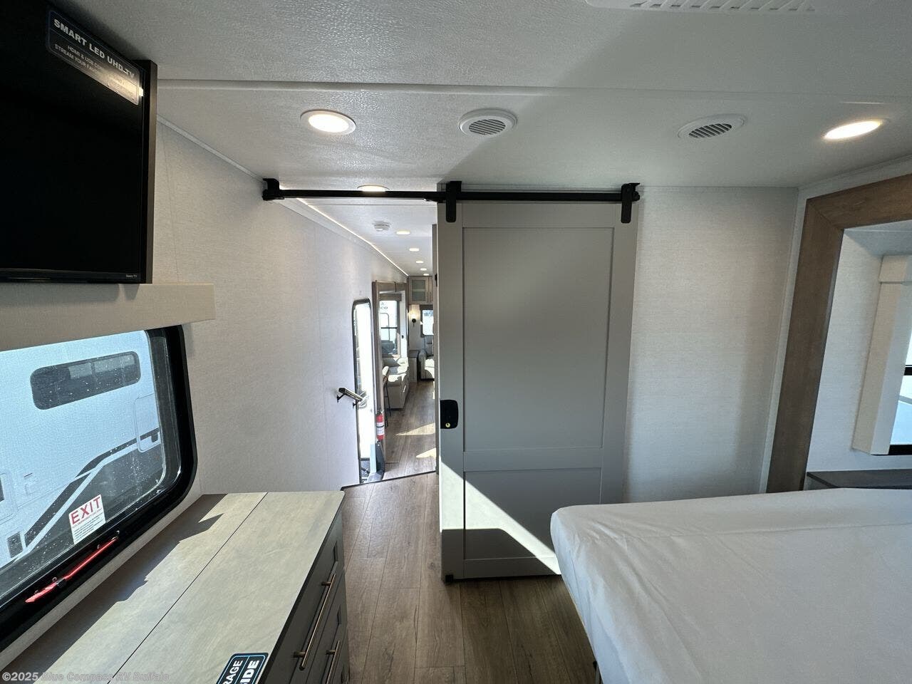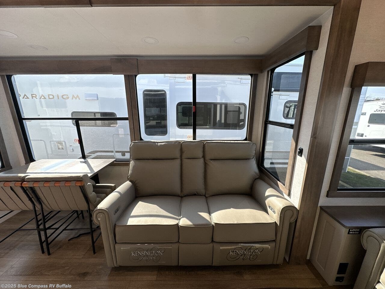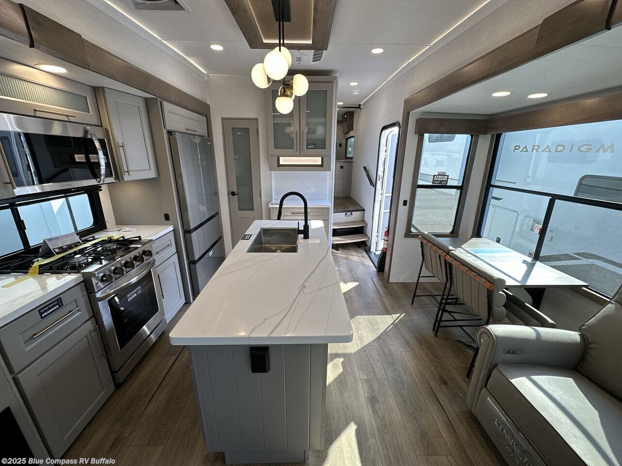 Search for the best views, the nicest RV park, or a place you haven't seen for years with this Paradigm in tow! There is a king bed slide in the master bedroom, a Smart TV, and a dresser with flip-up hidden storage for your belongings. The full bathroom offers a large residential shower, a porcelain toilet with a soft close seat, and storage for your linens, while the kitchen gives you two pantries, an island with a large undermount single basin sink and dishwasher prep if you want the option for easy clean up. You will also have a residential microwave and range, plus a 3.73 cu. ft. oven to make meals. When you're ready to relax for the evening, head to the rear living area to enjoy the dual recliner love seat across from the 50" Smart TV and fireplace!