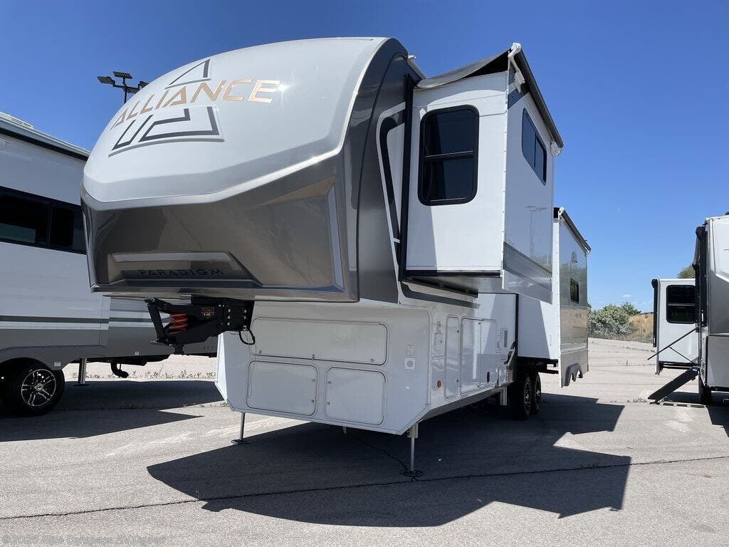 The Paradigm fifth wheels by Alliance RV are functional, high-quality, and luxurious for an unforgettable camping experience. There are three A/C units and a 40K BTU furnace to keep you comfortable year around, and you'll appreciate additional convenient amenities, like the all-in-one enclosed/heated utility center and the color coded and numbered wiring. A Rota-Flex pin box comes standard for hassle-free towing, along with Super-G 4,400 lb. rated tires and Dexter 7,000 lb. axles. You'll love the kitchen with its LG solid surface countertops and Lusso range, plus there is LED motion lighting in the pantry and a Maxx fan with a rain sensor to keep everything fresh when making dinner. Each model also includes an HD Smart TV in the living room and bedroom, plus a Winegard Air 360 antenna to keep you connected to the outside world. And of course there are a variety of options you can choose from to further customize your fifth wheel; dual pane windows, Super Solar Plus, slide out awning toppers, and generator prep or a generator to name a few!