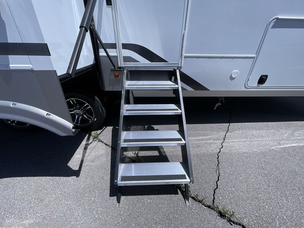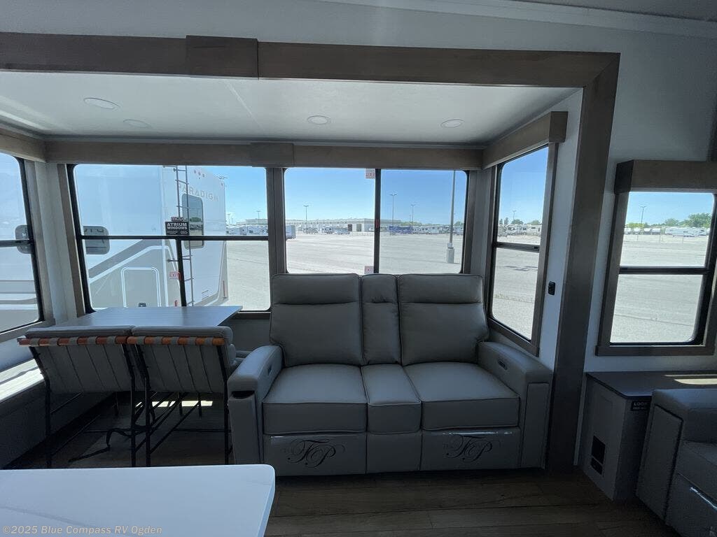 Search for the best views, the nicest RV park, or a place you haven't seen for years with this Paradigm in tow! There is a king bed slide in the master bedroom, a Smart TV, and a dresser with flip-up hidden storage for your belongings. The full bathroom offers a large residential shower, a porcelain toilet with a soft close seat, and storage for your linens, while the kitchen gives you two pantries, an island with a large undermount single basin sink and dishwasher prep if you want the option for easy clean up. You will also have a residential microwave and range, plus a 3.73 cu. ft. oven to make meals. When you're ready to relax for the evening, head to the rear living area to enjoy the dual recliner love seat across from the 50" Smart TV and fireplace!
