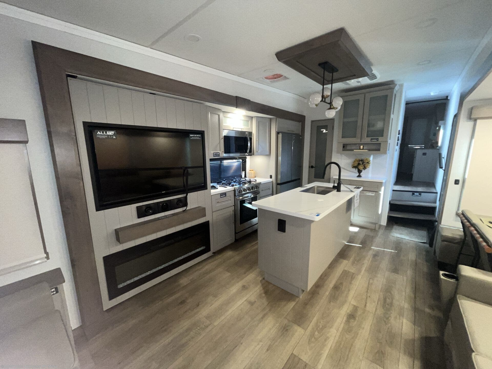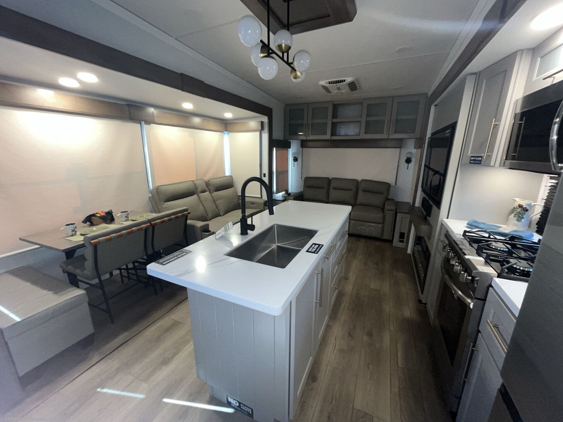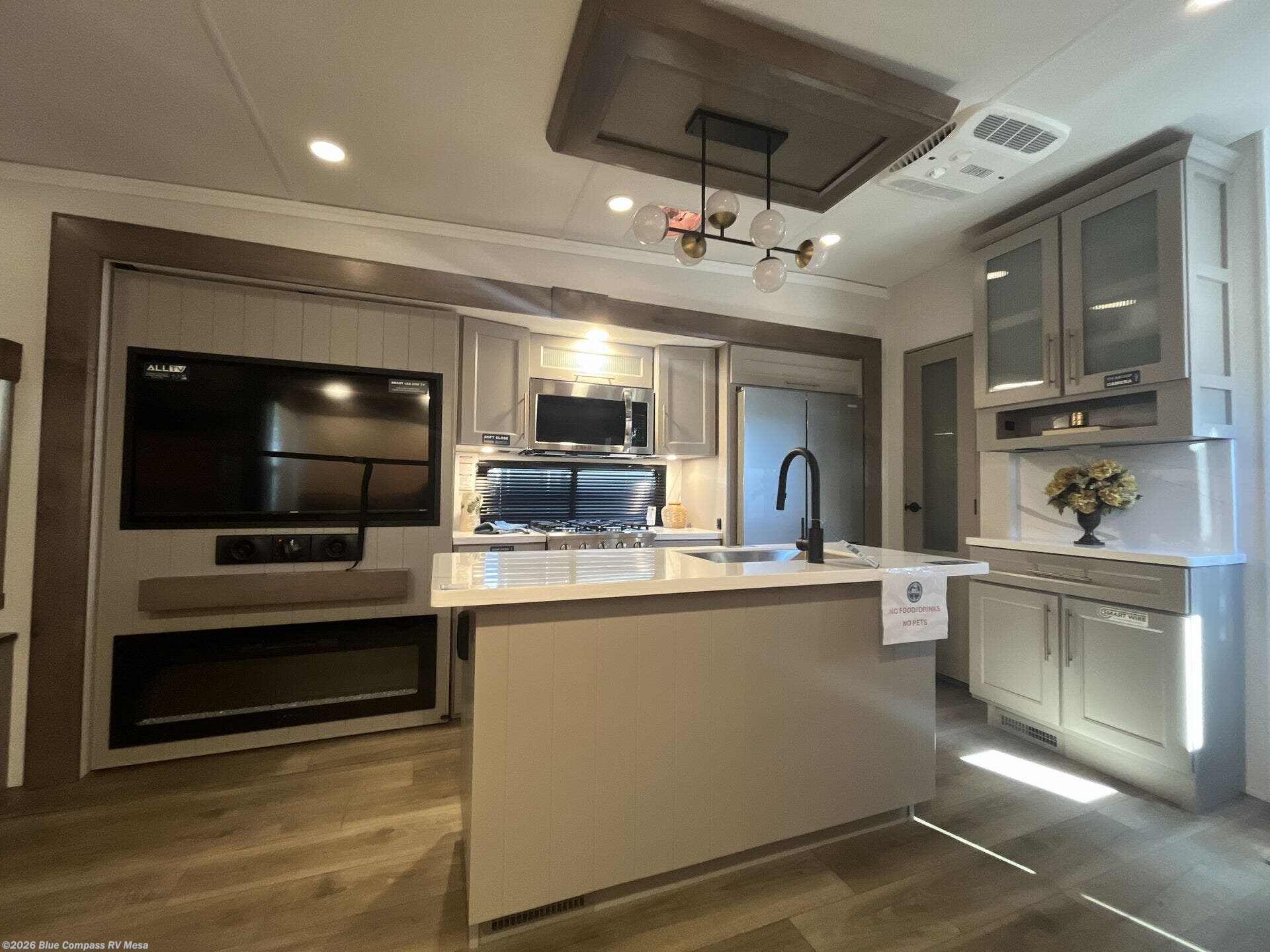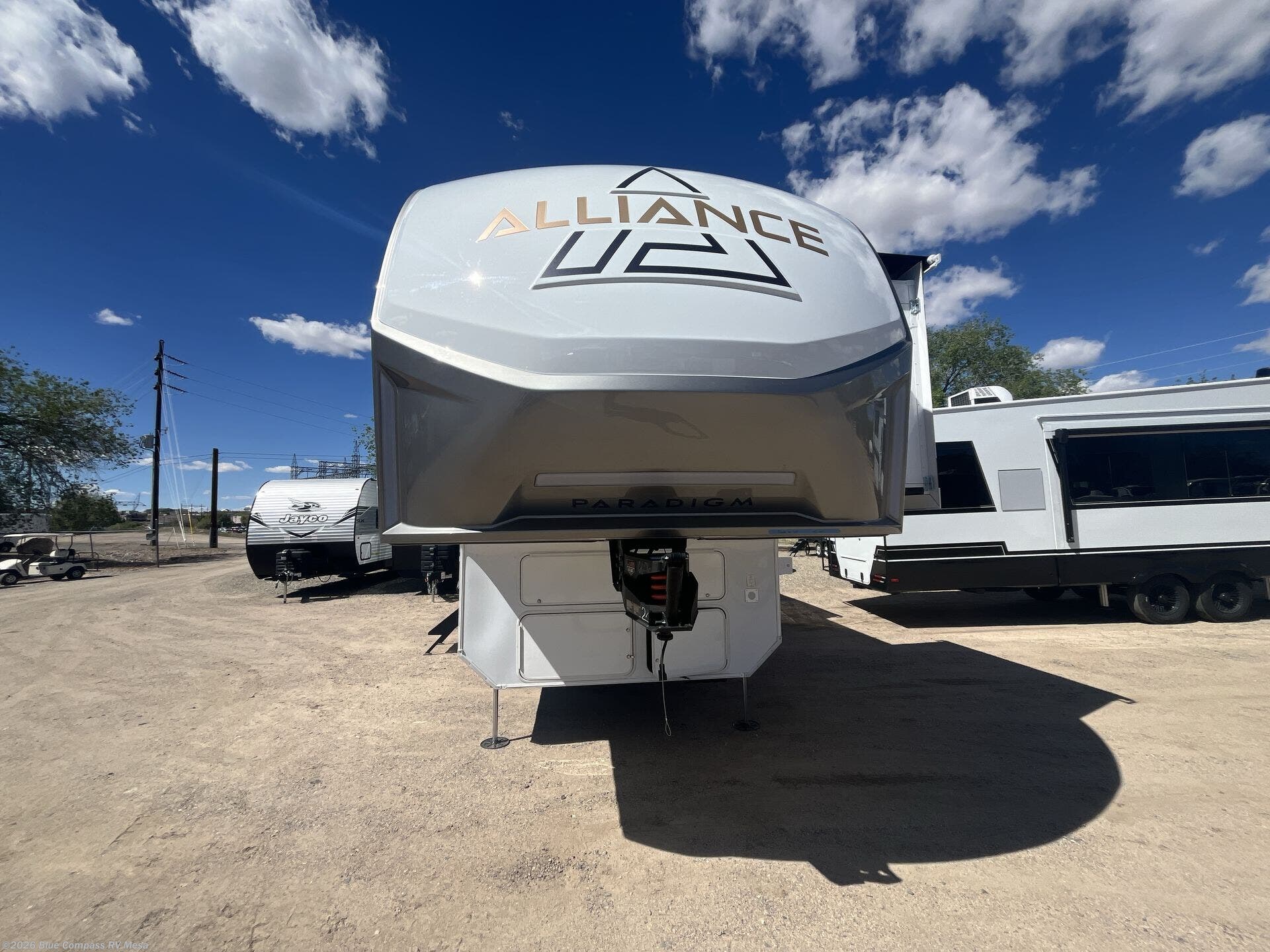 The Paradigm fifth wheels by Alliance RV are functional, high-quality, and luxurious for an unforgettable camping experience. There are three A/C units and a 40K BTU furnace to keep you comfortable year around, and you'll appreciate additional convenient amenities, like the all-in-one enclosed/heated utility center and the color coded and numbered wiring. A Rota-Flex pin box comes standard for hassle-free towing, along with Super-G 4,400 lb. rated tires and Dexter 7,000 lb. axles. You'll love the kitchen with its LG solid surface countertops and Lusso range, plus there is LED motion lighting in the pantry and a Maxx fan with a rain sensor to keep everything fresh when making dinner. Each model also includes an HD Smart TV in the living room and bedroom, plus a Winegard Air 360 antenna to keep you connected to the outside world. And of course there are a variety of options you can choose from to further customize your fifth wheel; dual pane windows, Super Solar Plus, slide out awning toppers, and generator prep or a generator to name a few!
