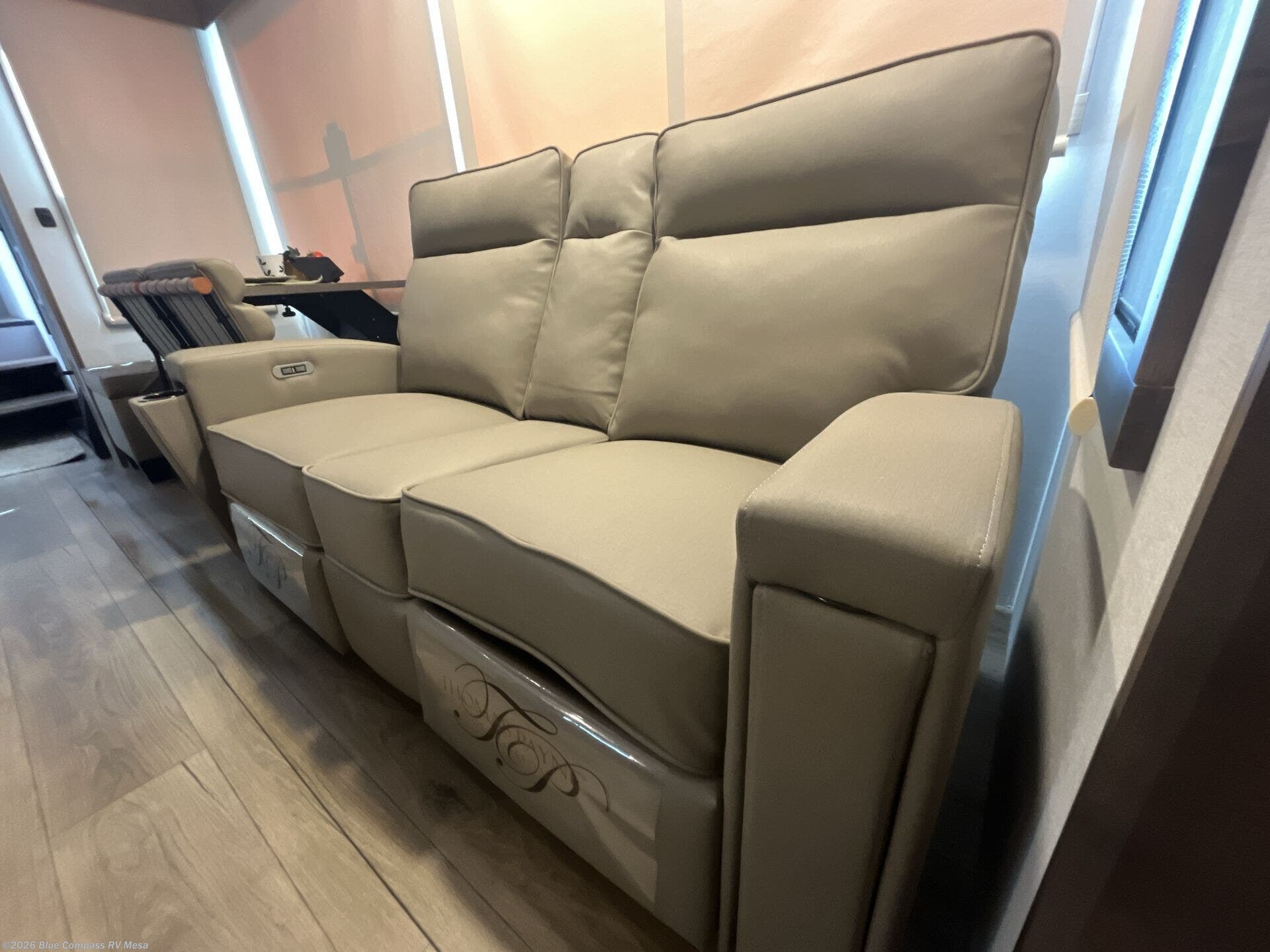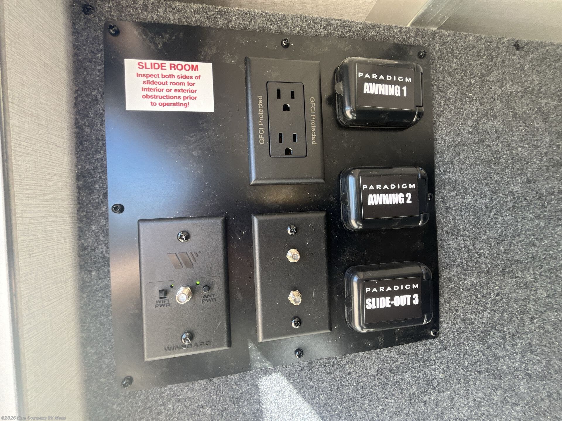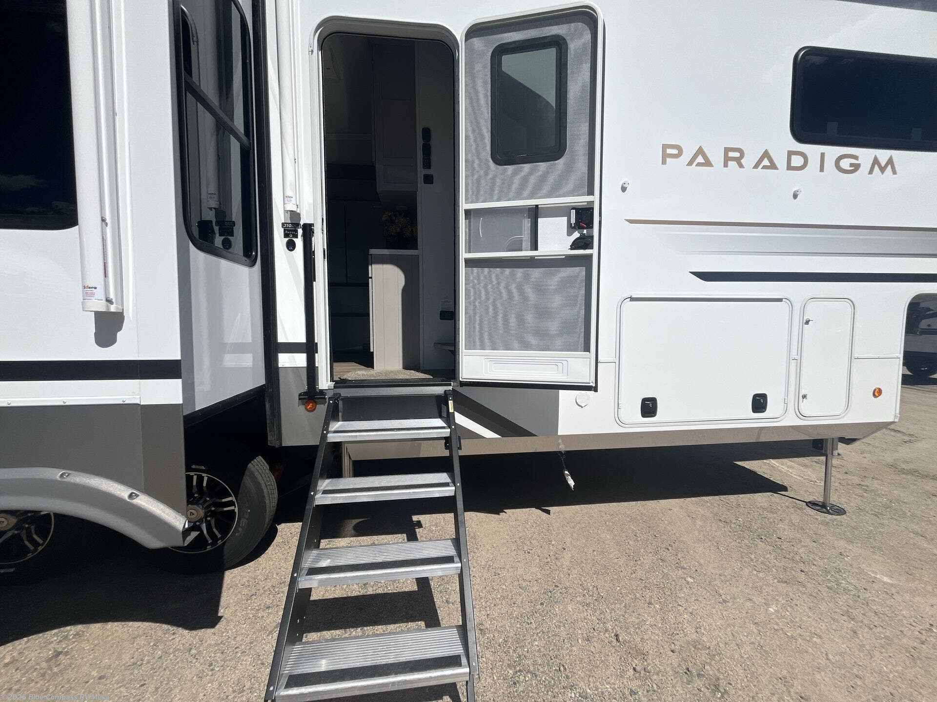 Search for the best views, the nicest RV park, or a place you haven't seen for years with this Paradigm in tow! There is a king bed slide in the master bedroom, a Smart TV, and a dresser with flip-up hidden storage for your belongings. The full bathroom offers a large residential shower, a porcelain toilet with a soft close seat, and storage for your linens, while the kitchen gives you two pantries, an island with a large undermount single basin sink and dishwasher prep if you want the option for easy clean up. You will also have a residential microwave and range, plus a 3.73 cu. ft. oven to make meals. When you're ready to relax for the evening, head to the rear living area to enjoy the dual recliner love seat across from the 50" Smart TV and fireplace!