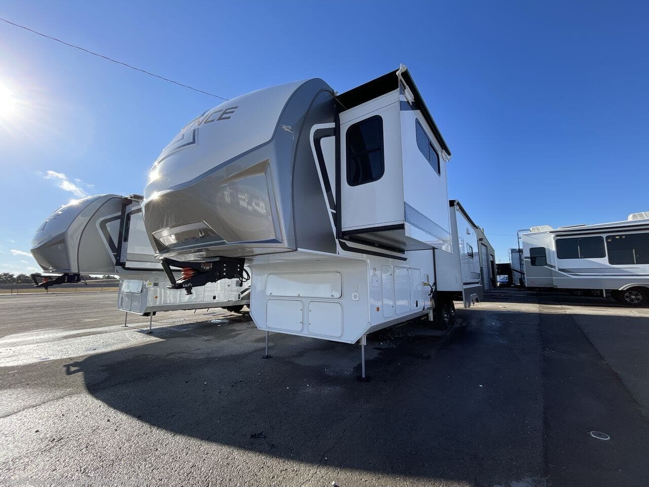 The Paradigm fifth wheels by Alliance RV are functional, high-quality, and luxurious for an unforgettable camping experience. There are three A/C units and a 40K BTU furnace to keep you comfortable year around, and you'll appreciate additional convenient amenities, like the all-in-one enclosed/heated utility center and the color coded and numbered wiring. A Rota-Flex pin box comes standard for hassle-free towing, along with Super-G 4,400 lb. rated tires and Dexter 7,000 lb. axles. You'll love the kitchen with its LG solid surface countertops and Lusso range, plus there is LED motion lighting in the pantry and a Maxx fan with a rain sensor to keep everything fresh when making dinner. Each model also includes an HD Smart TV in the living room and bedroom, plus a Winegard Air 360 antenna to keep you connected to the outside world. And of course there are a variety of options you can choose from to further customize your fifth wheel; dual pane windows, Super Solar Plus, slide out awning toppers, and generator prep or a generator to name a few!
