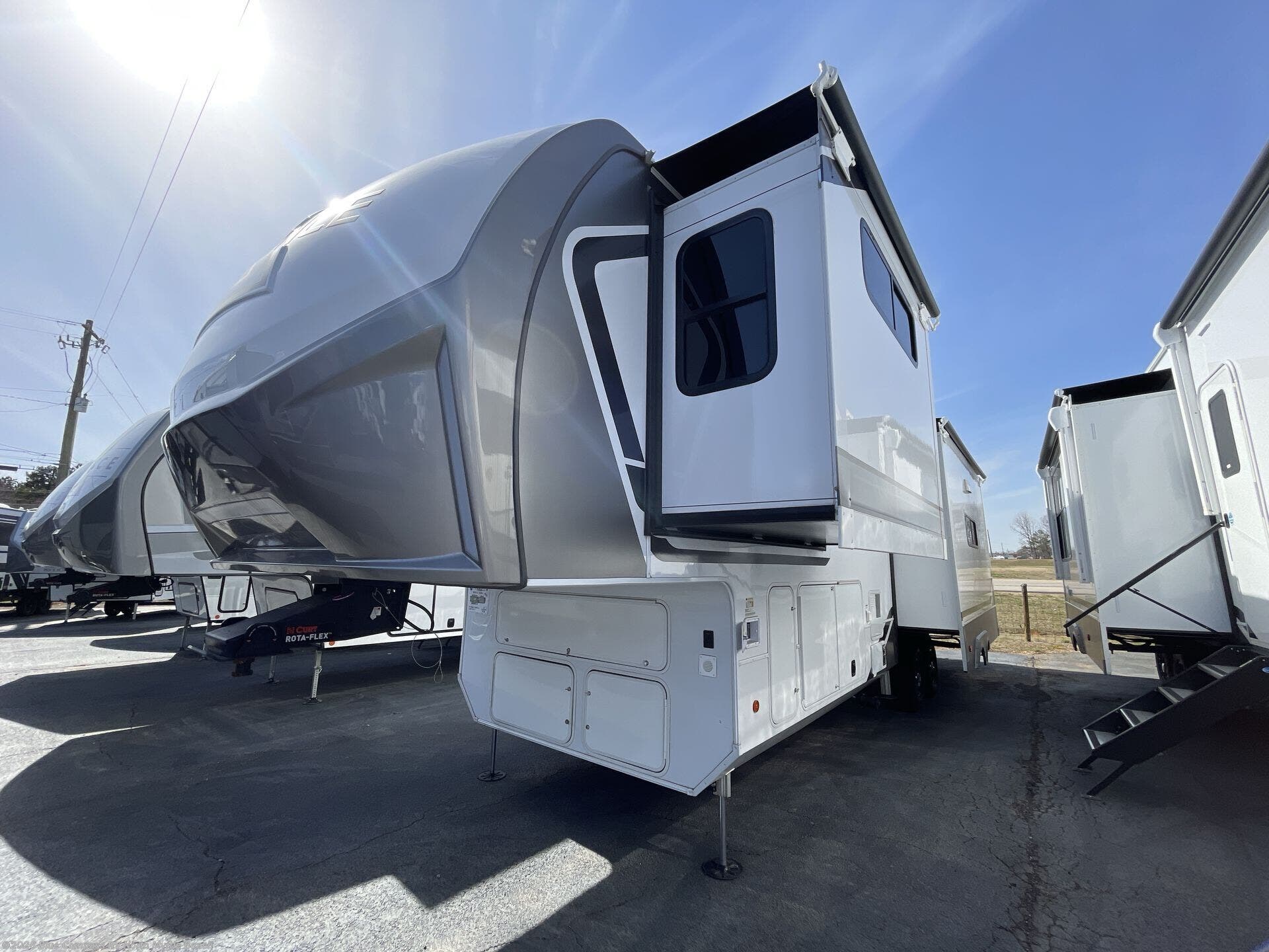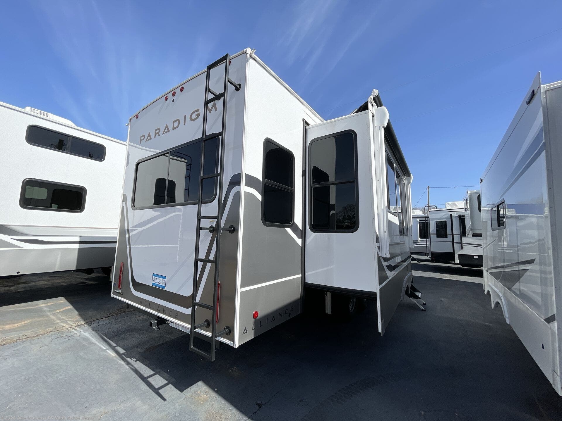 The Paradigm fifth wheels by Alliance RV are functional, high-quality, and luxurious for an unforgettable camping experience. There are three A/C units and a 40K BTU furnace to keep you comfortable year around, and you'll appreciate additional convenient amenities, like the all-in-one enclosed/heated utility center and the color coded and numbered wiring. A Rota-Flex pin box comes standard for hassle-free towing, along with Super-G 4,400 lb. rated tires and Dexter 7,000 lb. axles. You'll love the kitchen with its LG solid surface countertops and Lusso range, plus there is LED motion lighting in the pantry and a Maxx fan with a rain sensor to keep everything fresh when making dinner. Each model also includes an HD Smart TV in the living room and bedroom, plus a Winegard Air 360 antenna to keep you connected to the outside world. And of course there are a variety of options you can choose from to further customize your fifth wheel; dual pane windows, Super Solar Plus, slide out awning toppers, and generator prep or a generator to name a few!
