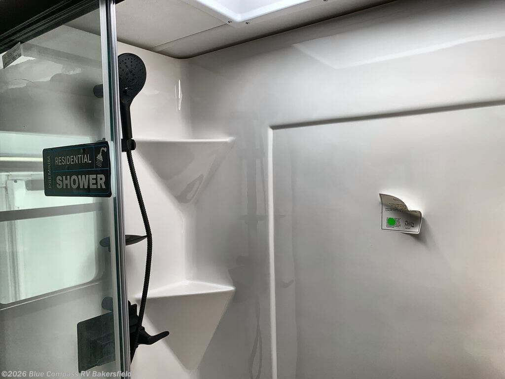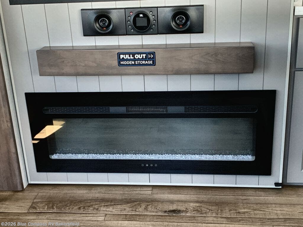 Travel to see family and friends while living in this RV or while on vacation! You will love the spacious rear living area thanks to the dual opposing slides which include the kitchen amenities and the 50" Smart TV with a fireplace. There is also a hidden pantry storage behind the TV for smart storage spaces! You can get comfortable on the dual recliner love seat or dine at the swivel table and desk. The kitchen island includes a sink and counter space to utilize many ways, plus there is dishwasher prep if you want to add that option. The full bathroom is up the steps towards the front bedroom and includes a spacious 61" x 30" shower. You even have more floor space in the hallway thanks to the third slide out which includes shelf storage, plus more shelves and a king bed in the bedroom.