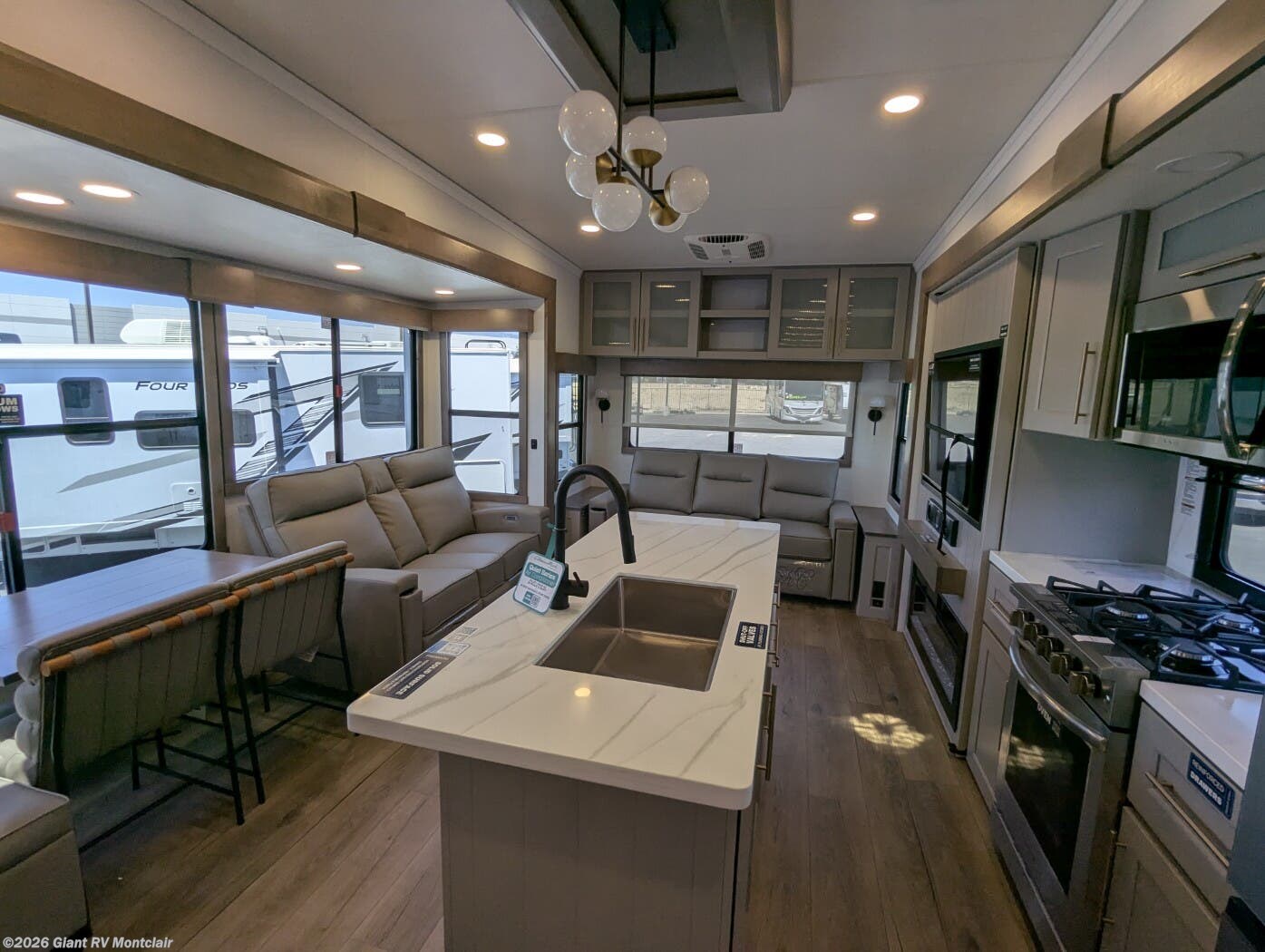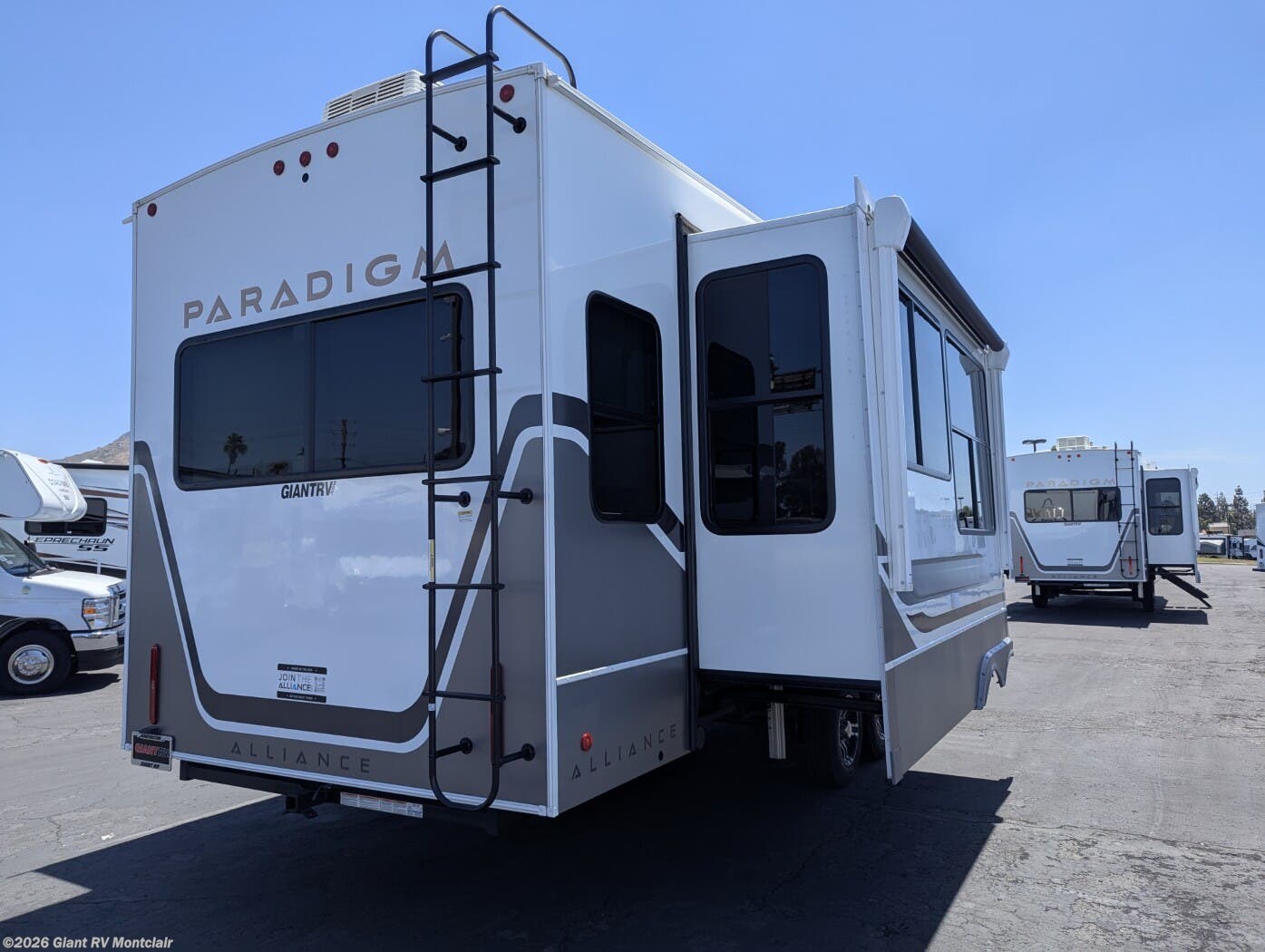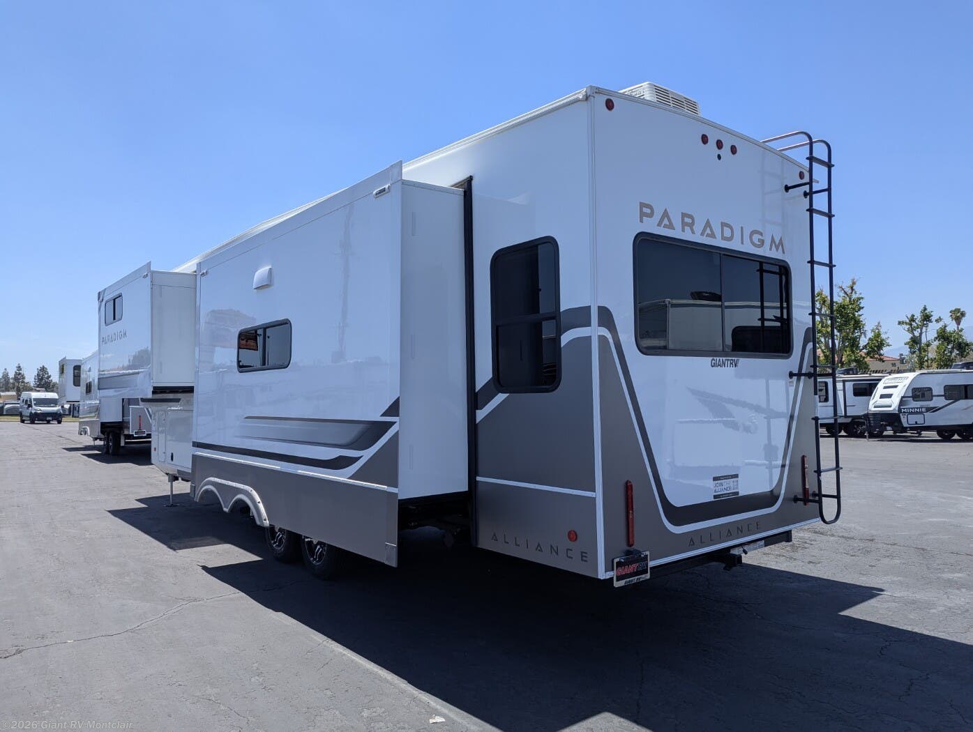 Experience premium RV camping with the 2025 Alliance RV Paradigm 340RL fifth wheel at Giant RV in California! Ideal for couples, this RV features a rear living area with dual opposing slide-outs, theater seating, a tri-fold sofa, and 50” LED TV, plus a front king bedroom. The kitchen boasts a 19 cu. ft. fridge, Insignia range, and island. A full bath with shower ensures comfort. Enjoy a 16’ power awning, exterior storage, and a 98.3-gal fresh water tank. Equipped with three 13,500 BTU A/Cs, a 40,000 BTU furnace, and 6-point hydraulic leveling for off-grid luxury.