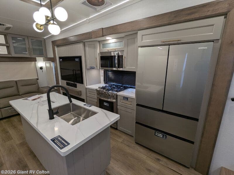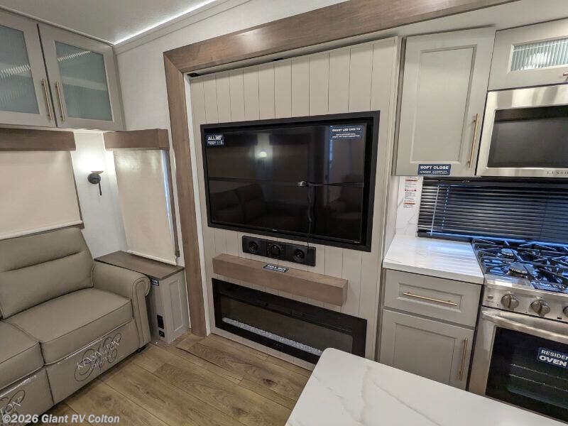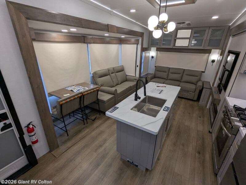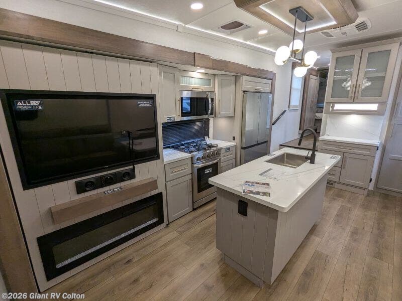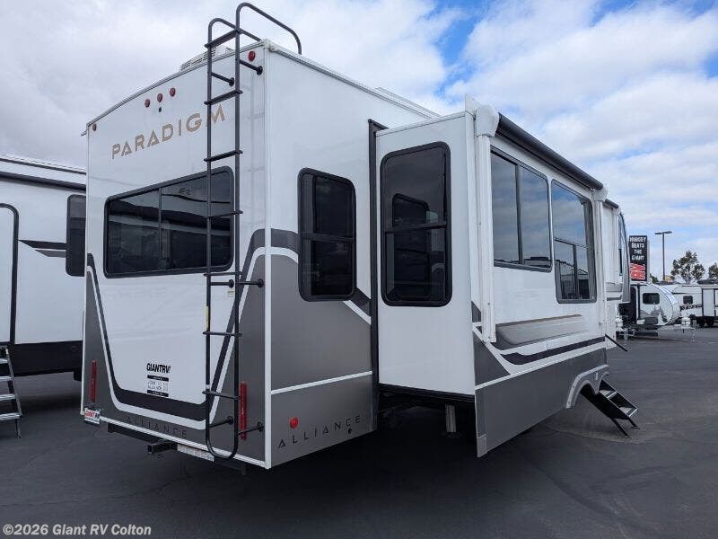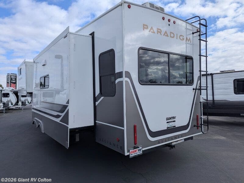 Experience premium RV camping with the 2025 Alliance RV Paradigm 340RL fifth wheel at Giant RV in California! Ideal for couples, this RV features a rear living area with dual opposing slide-outs, theater seating, a tri-fold sofa, and 50” LED TV, plus a front king bedroom. The kitchen boasts a 19 cu. ft. fridge, Insignia range, and island. A full bath with shower ensures comfort. Enjoy a 16’ power awning, exterior storage, and a 98.3-gal fresh water tank. Equipped with three 13,500 BTU A/Cs, a 40,000 BTU furnace, and 6-point hydraulic leveling for off-grid luxury.