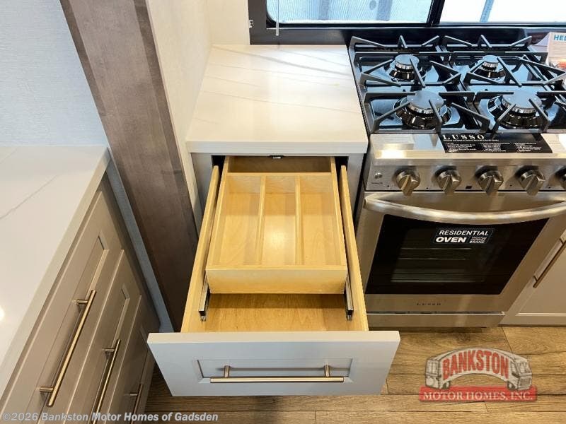 The Paradigm fifth wheels by Alliance RV are functional, high-quality, and luxurious for an unforgettable camping experience. There are three A/C units and a 40K BTU furnace to keep you comfortable year around, and you'll appreciate additional convenient amenities, like the all-in-one enclosed/heated utility center and the color coded and numbered wiring. A Rota-Flex pin box comes standard for hassle-free towing, along with Super-G 4,400 lb. rated tires and Dexter 7,000 lb. axles. You'll love the kitchen with its LG solid surface countertops and Lusso range, plus there is LED motion lighting in the pantry and a Maxx fan with a rain sensor to keep everything fresh when making dinner. Each model also includes an HD Smart TV in the living room and bedroom, plus a Winegard Air 360 antenna to keep you connected to the outside world. And of course there are a variety of options you can choose from to further customize your fifth wheel; dual pane windows, Super Solar Plus, slide out awning toppers, and generator prep or a generator to name a few!