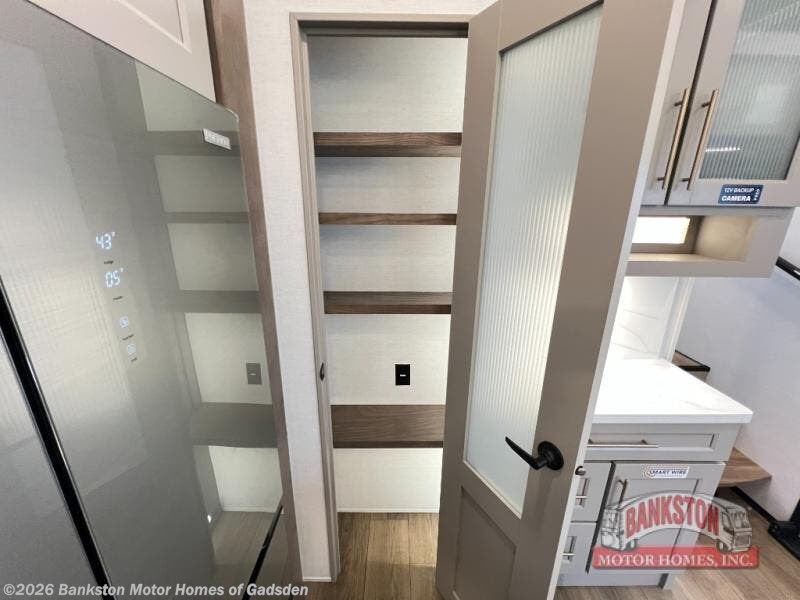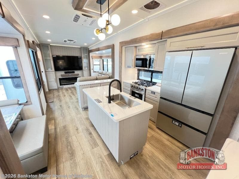 You'll love everything about this luxurious fifth wheel! There are five slide outs so you can enjoy more space than ever, and the rear living area can double as a den for guest. They can sleep on the sleeper sofa or second sofa with overhead storage, and there is a dual recliner across from the 65" Smart TV. The middle kitchen includes a kitchen island with dishwasher prep, generous counter space, a pantry and hutch for storage, and a swivel table and desk to dine or work at! This model also includes a spacious full bath with a large 61" x 30" shower for all-around comfort plus a front private bedroom with a king bed slide out. There is also a walk-in closet with washer and dryer prep, a flip top dresser with a Smart TV, and a seat with storage to keep everything tidy!